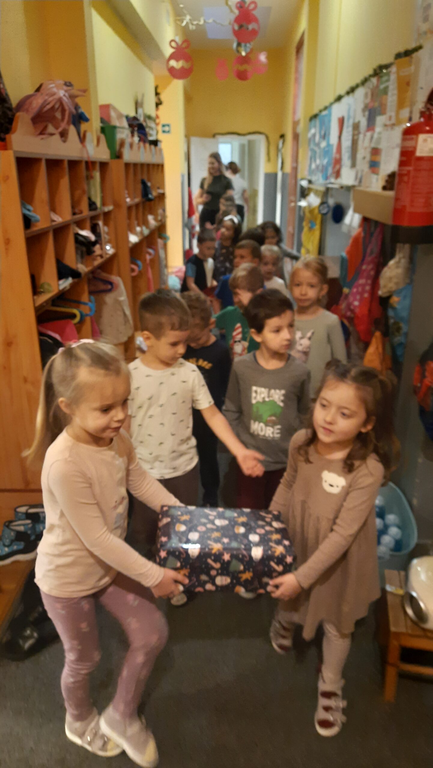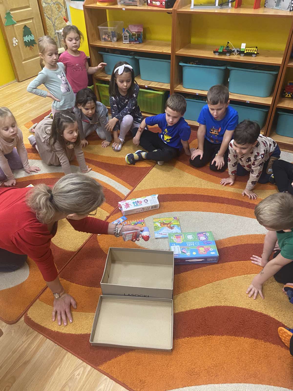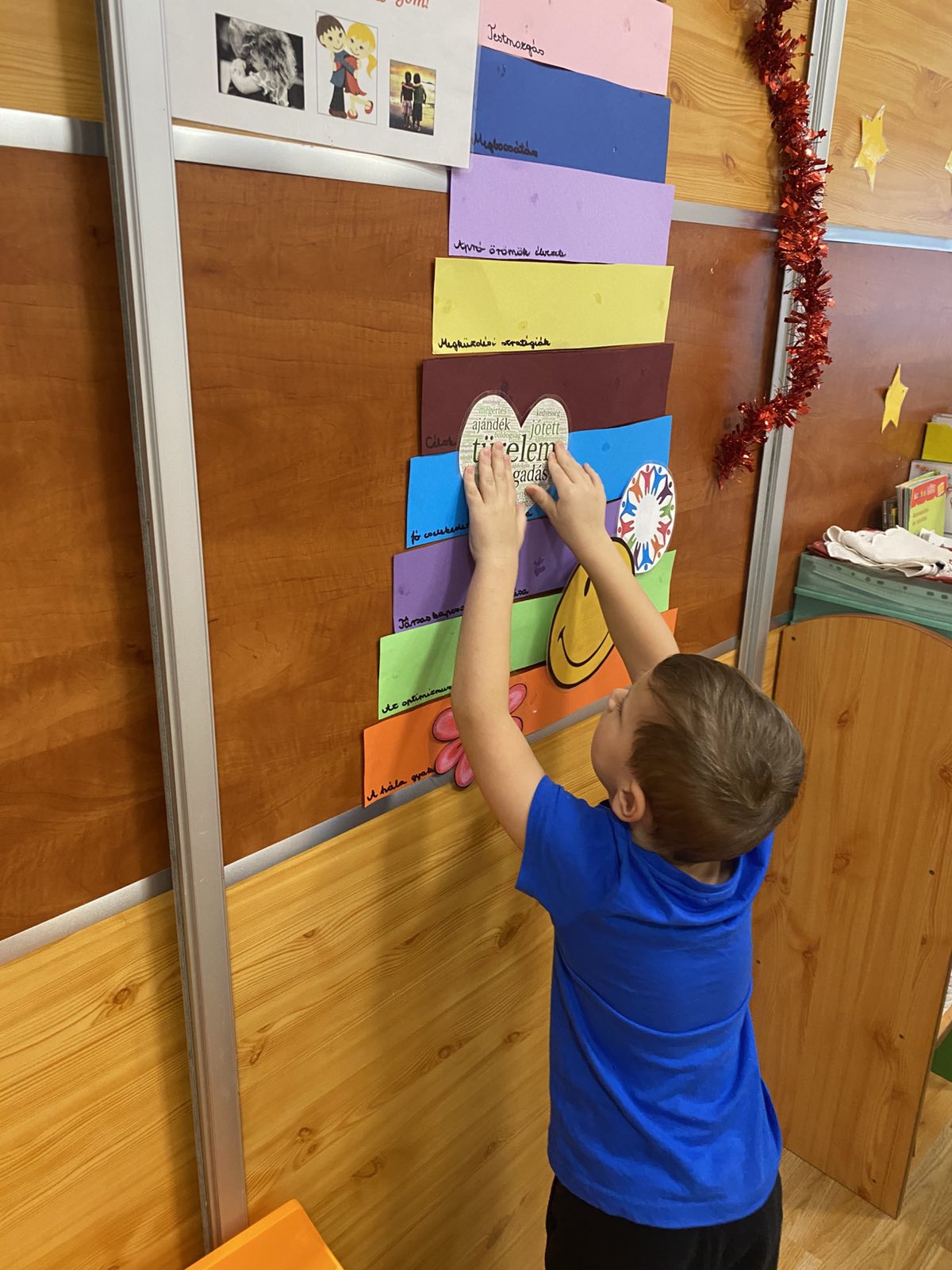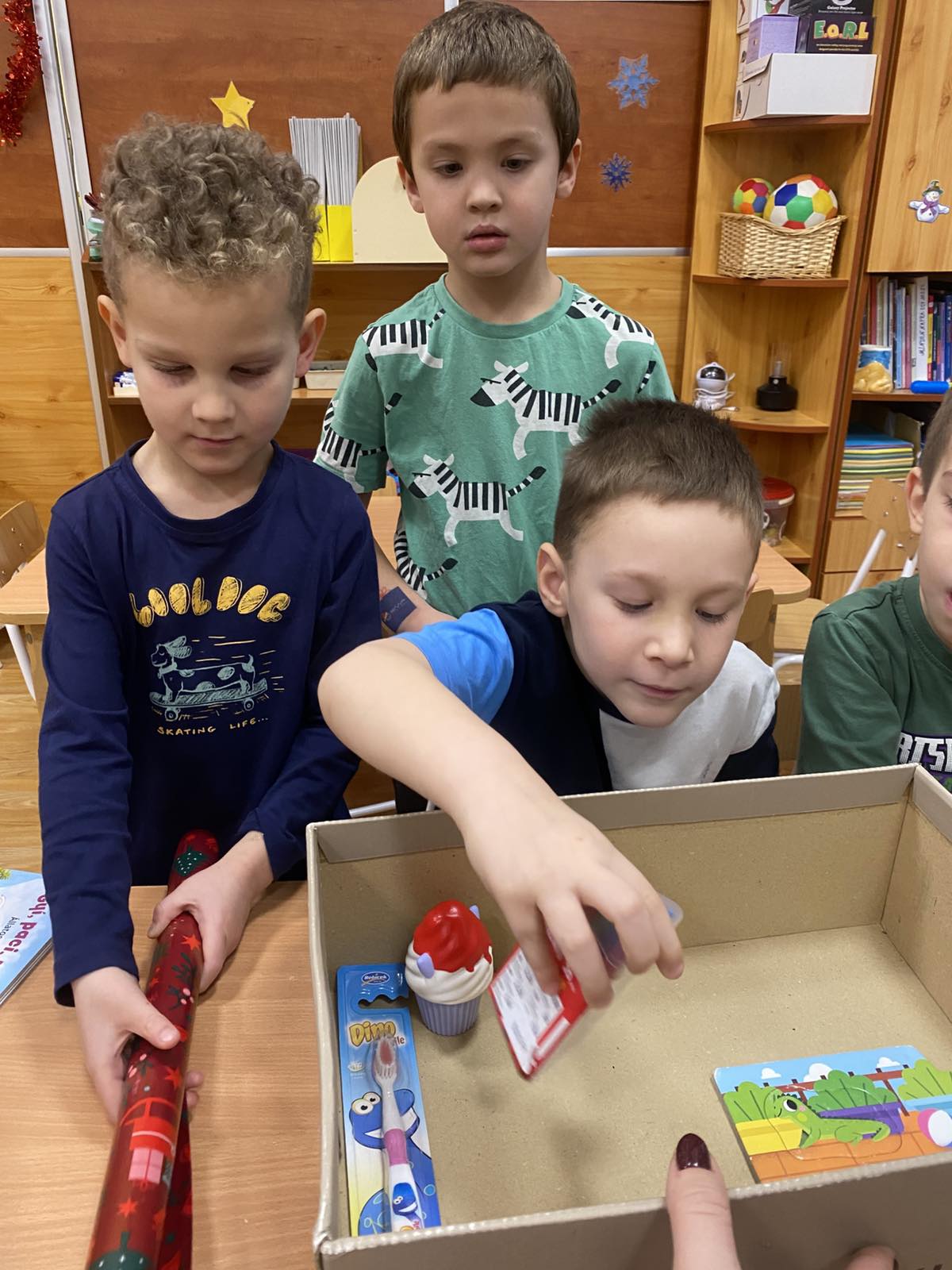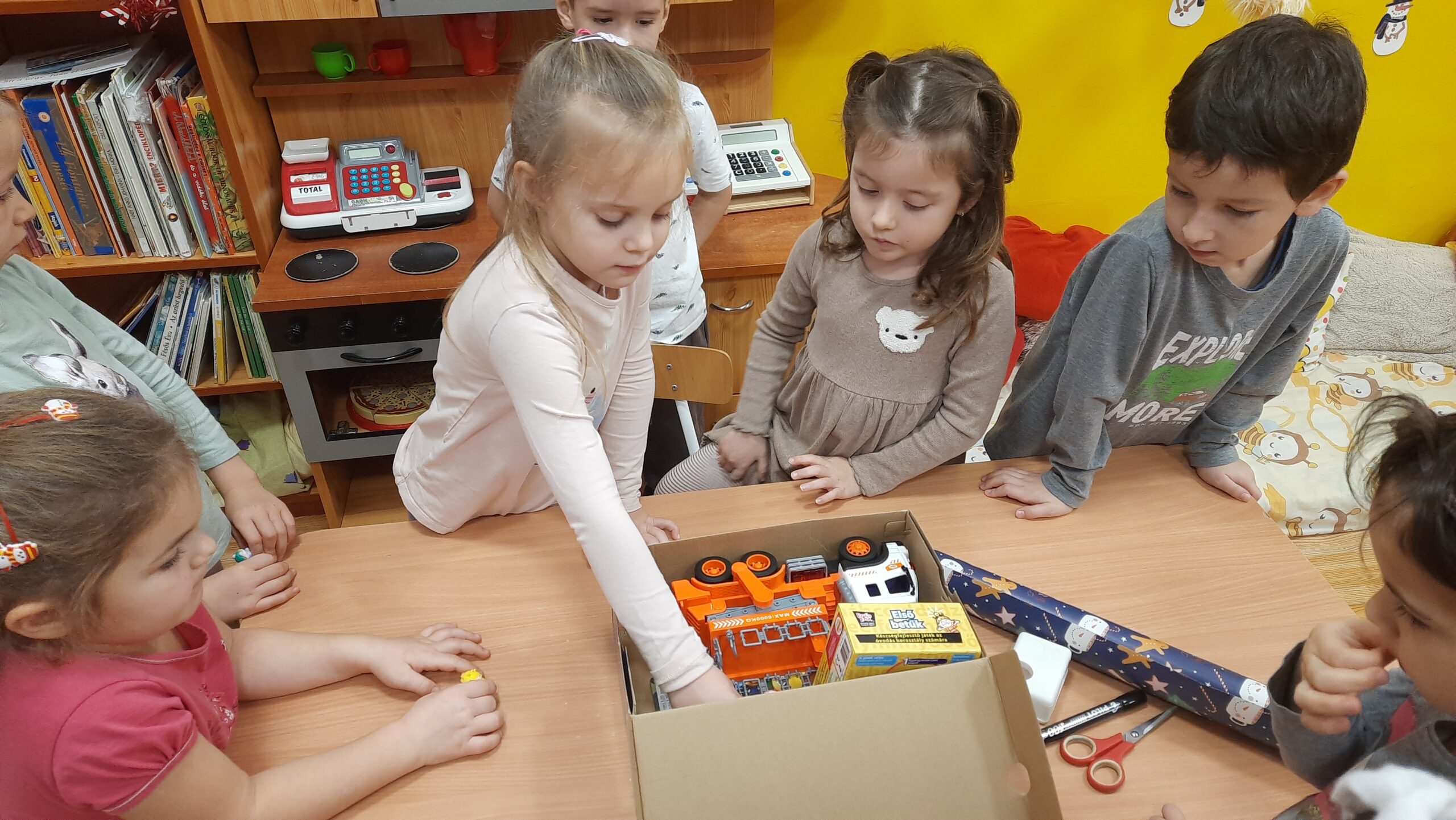 A boldogságóra középpontjában a segítségnyújtás és az önzetlenség állt. A gyerekekkel közösen válogattuk ki az adománygyűjtésre szánt játékokat, majd együtt csomagoltuk be azokat. A tevékenység közben beszélgettünk arról, milyen jó érzés segíteni másokon, és miért fontos odafigyelni a rászorulókra. Megbeszéltük, hogy nem mindenkinek van annyi játéka, mint nekünk, és a megosztás örömet szerezhet másoknak. A gyerekek örömmel és nagy lelkesedéssel vettek részt a csomagolásban. Közben megfogalmazták saját gondolataikat arról, hogyan lehetünk kedvesek és segítőkészek. A közös munka erősítette az összetartozás érzését és az empátiát. A becsomagolt játékokat ezután együtt vittük el a gyűjtőhelyre. A gyerekek izgatottan beszéltek arról, hogy a játékok egy vidéki óvodába kerülnek. A foglalkozás során megtapasztalták az adakozás örömét és fontosságát. A boldogságóra hozzájárult a pozitív értékek és a segítő magatartás kialakításához.