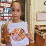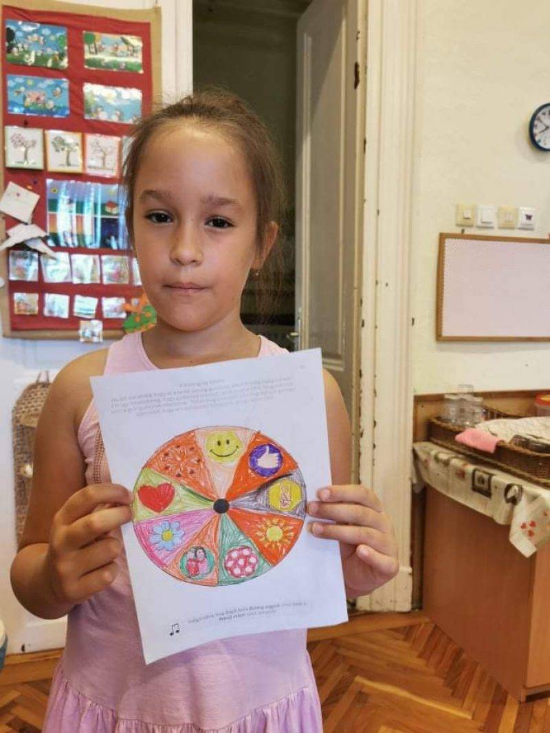 A ráhangolódás szakaszában a gyermekek bemutatkoztak egymásnak, majd egy választott szeretet jelet (ölelés, simogatás, mosoly, dicséret) üdvözölték egymást. A visszaemlékezést fényképek, közös munkáink megmutatásával, illetve a Hálafal és Opti Miska figurájával elevenítettük fel. Felidéztük a mozgás örömét, a Boldogvárhoz vezető úthoz szükséges erőket, a kitartást, a szorgalmat. Véleményeiket is kifejtették, legtöbben az optimizmus szemüvegét említették kedvenc témájuknak. Azóta is gyorsan “felvesszük”, ha valaki nem olyan derűlátó. Niki óvó néni egy megerősítő mantrázást tanított nekünk, amit még csak a Napocskák ismertek, de pillanatokon belül együtt mantráztuk: “Boldog vagyok, jól vagyok, erős vagyok, szép vagyok!” – egyre hangosabban, egyre ritmusosabban. Mindenki arcáról a vidámság sugárzott. Ezt követően megismertettük a gyerekeket A boldog ember inge – magyar népmesével, majd röviden el is játszottuk. A gyermekeket rávezettük, hogy a a boldogságot nem keresni kell, csak meg kell lelni az apró dolgokban. Ahogy a dolgozó ember elégedett volt a saját életével, boldogság és szeretet vette körül. A királynak pedig meg kellett tanulnia, hogy hiába kutatja, mert “boldog ing nincs”, azt belülről kell megváltoztatni, annak aki nem érzi jól magát a bőrében. Néhányan a boldog ember ingét, az ajánlott színezőn egyedi módon kidíszítették. A választható feladatok közül a “Kerekerdő építése” nagy lelkesedést váltott ki. Úgy alakítottuk, hogy a különböző csoportba járó gyerekek összefogjanak, a nagyok segítsék a szimmetriát kialakítani a kisebbeknek. A változtatásnál figyelmesek voltak, alig tudták kivárni, hogy következzenek a kitalálásban. Szabadidőben többen is fűztek nyakláncot, a családi boldogság jelképekeként – hozzá fűzött kívánságaikat is elsorolták, illetve volt aki a gyöngyszemeket a családtagok tulajdonságaival, kedvenc színeivel ruházta fel és tette fel sorba a nyakláncára. A délelőtt lezárásaként egy szeretetalagutat varázsoltunk, a keresztül haladó gyermeket pedig pozitív szavakkal, mosollyal biztattuk. Közösön meghallgattuk a hónap dalát – a Jobb veled a világot!