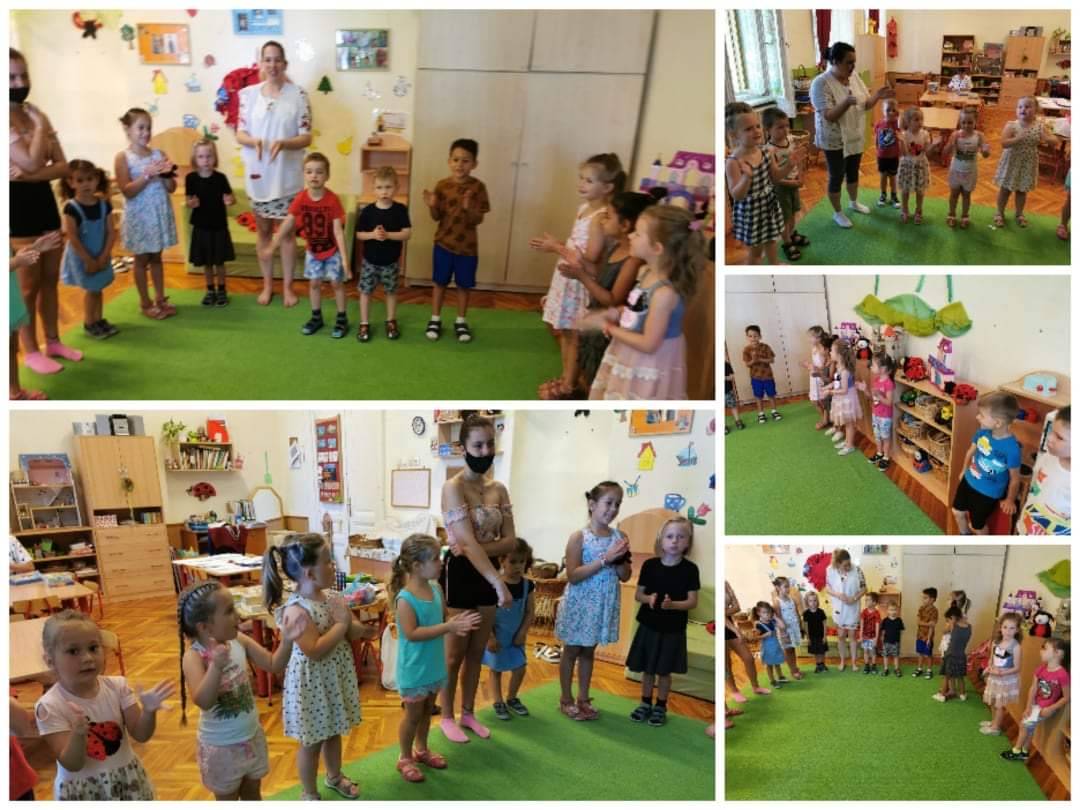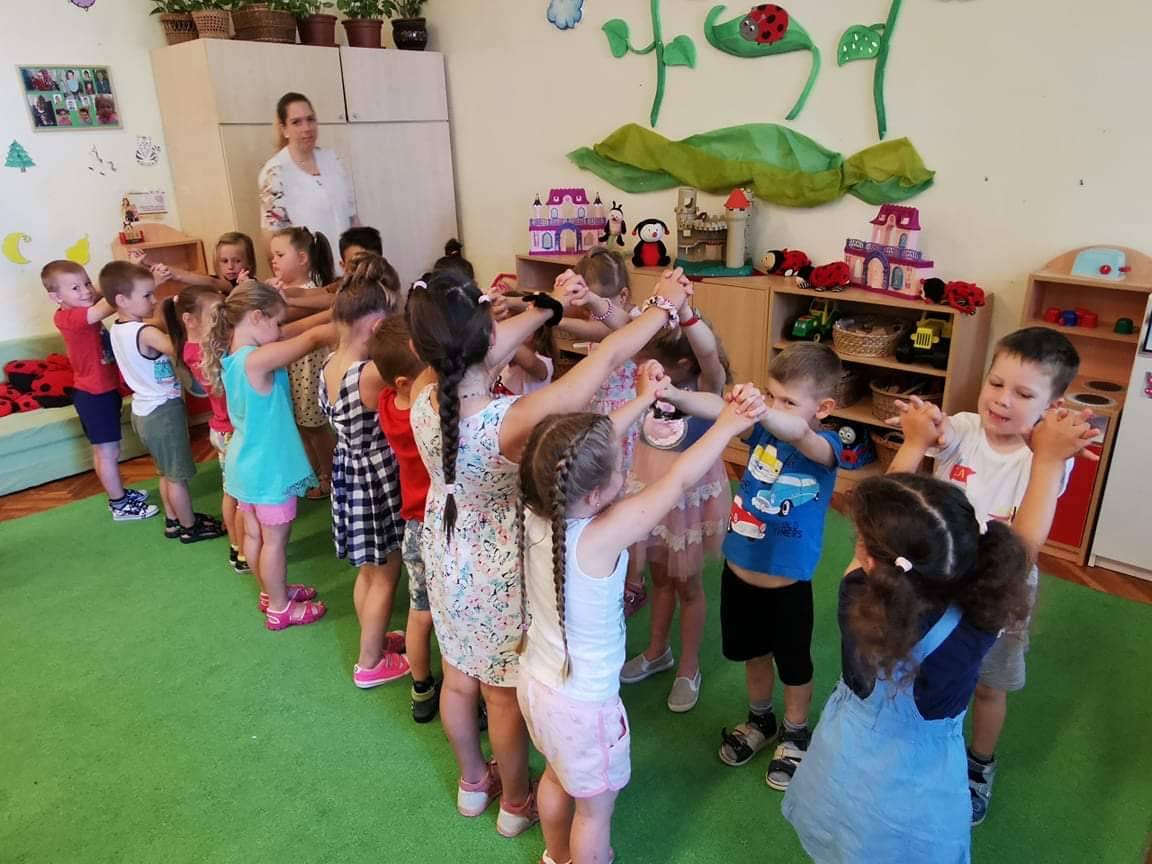Az utolsó témakör a fenntartható boldogság, lehetőséget nyújtott újra átélni a szép pillanatokat, a nevelési év során tanult új élményeket. Arra gondoltunk, hogy újra együtt tartunk egy “boldog napot”, így az aktuálisan oviba járó Gomba és a Napocska csoport csatlakozott a Katicákhoz. Néhányan már a nyári szünetet élvezték, így kevesebb létszámmal, vegyes korosztállyal játszottunk, ennek ellenére nagyon jó hangulat alakult ki és egyre nyitottabbak lettek a pajtások. A felnőttek közül is volt érdeklődő óvó néni, aki szívesen csatlakozott, mert már nagyon érdekelte, hogyan zajlik egy ilyen nap.