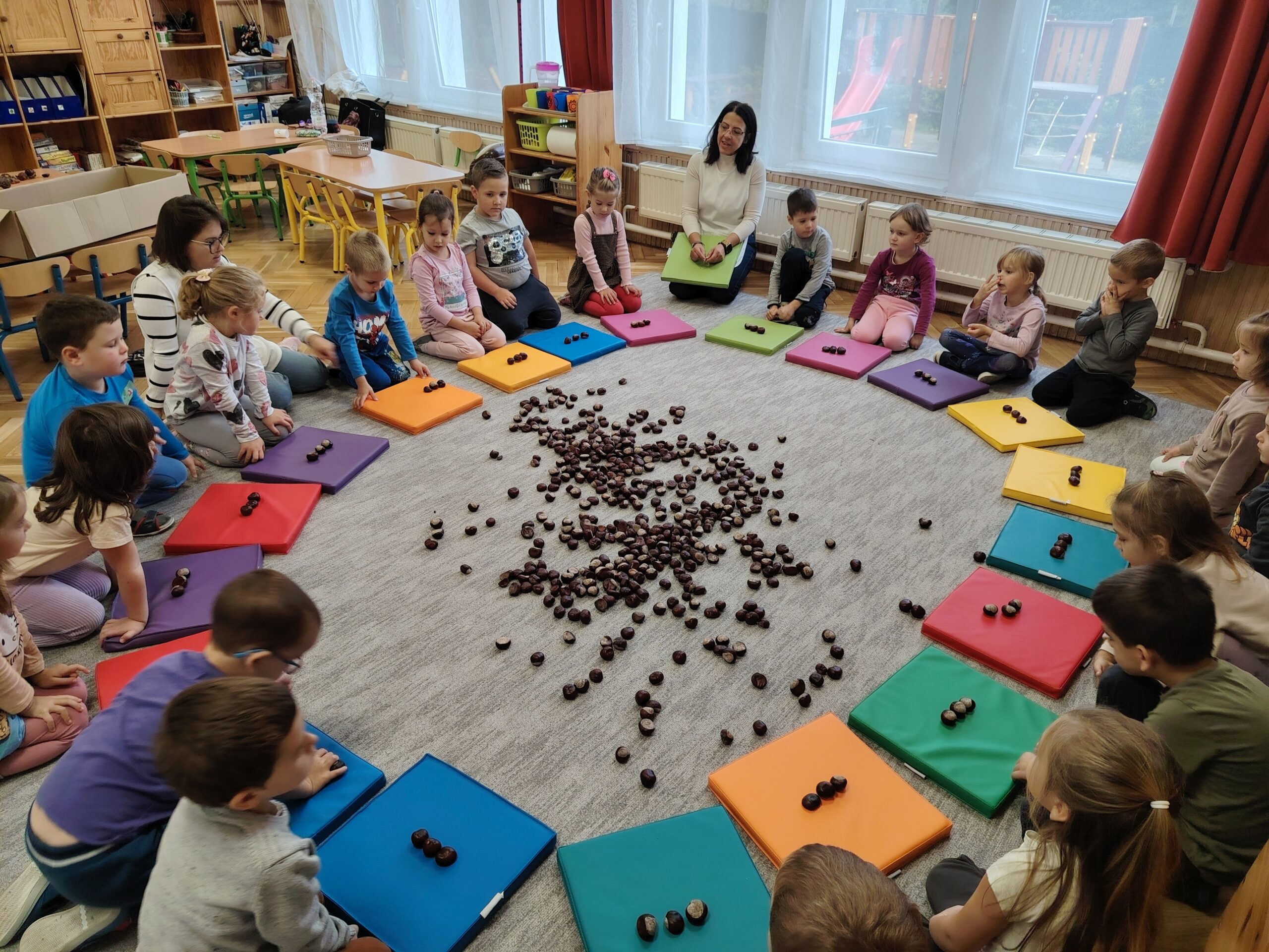Hálafa készítése gesztenyéből. A csoportszoba szőnyegére halmozok nagy mennyiségű gesztenyét, melyet az egyik gyermek hozott. Ebből kis csoportok készítenek hálafát.