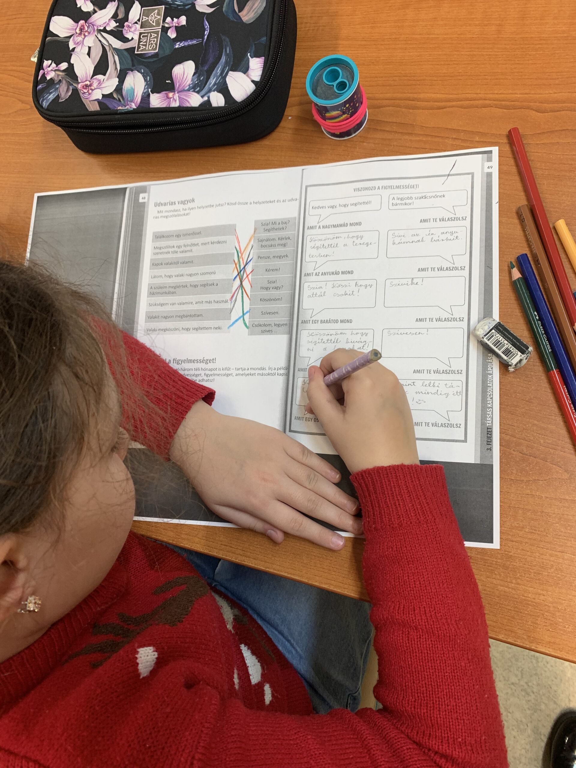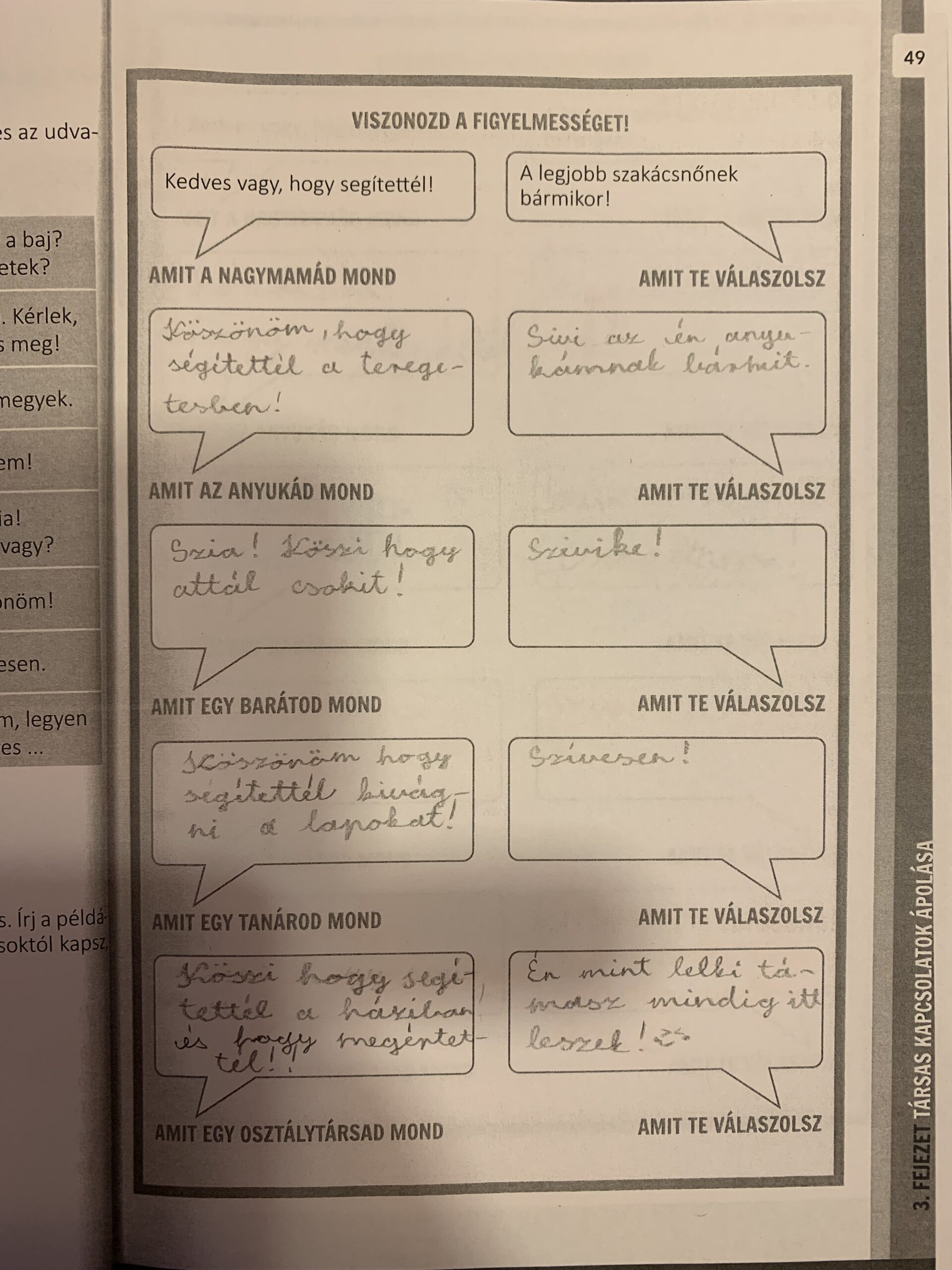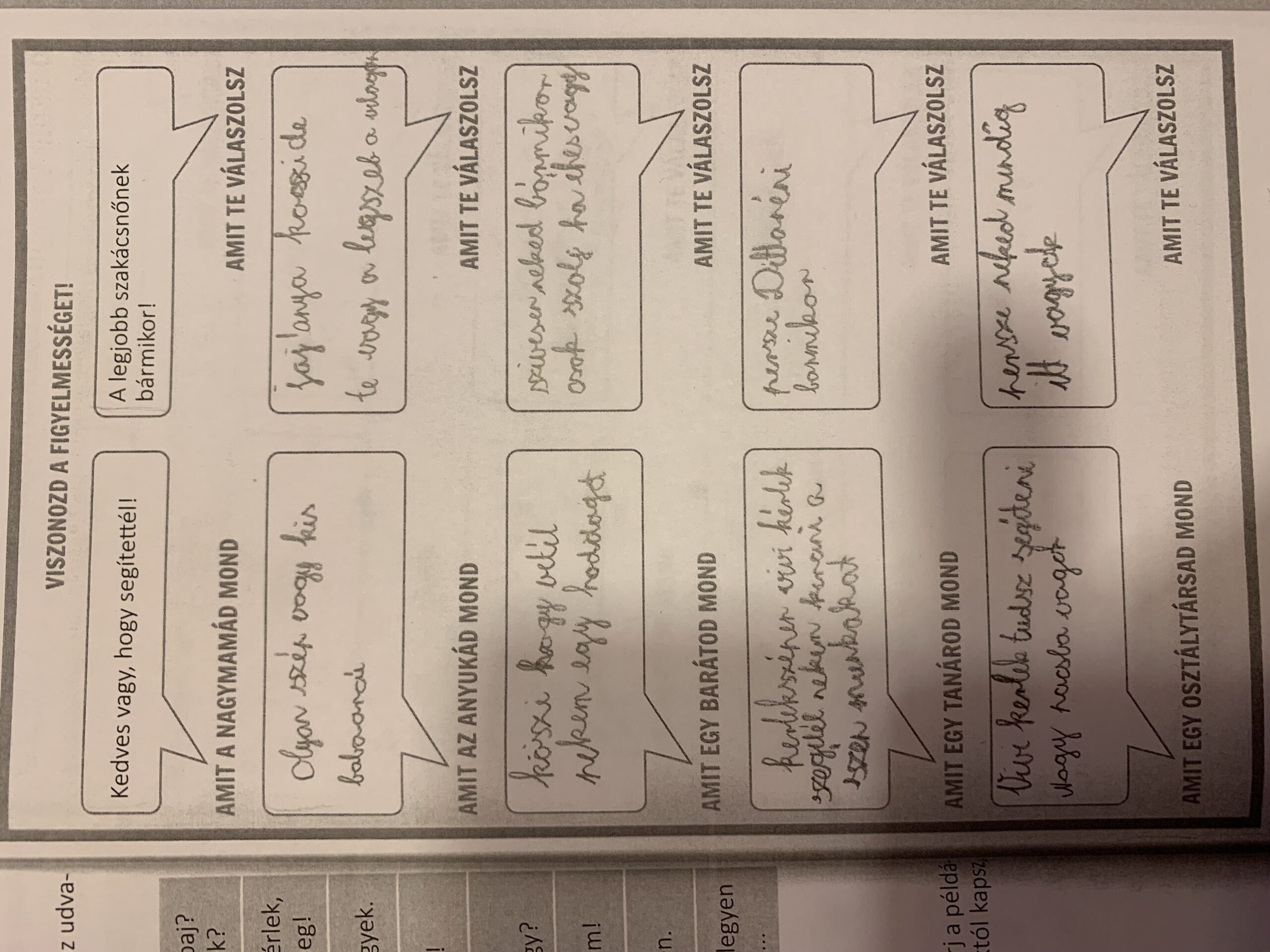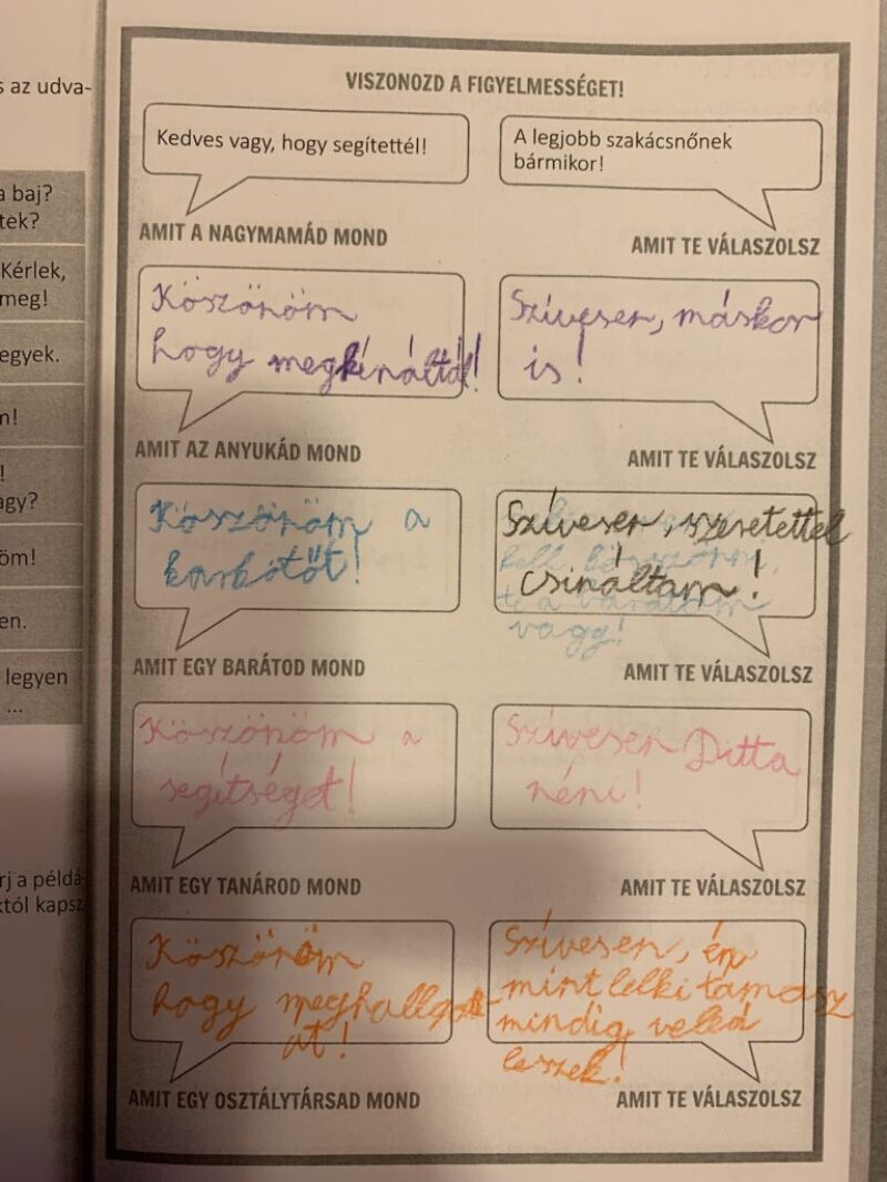 A mai alkalommal az udvarias, figyelmes kifejezések fontosságára hívtam fel a figyelmet a társas kapcsolatokban. Ehhez a munkafüzet feladatait oldottuk meg.