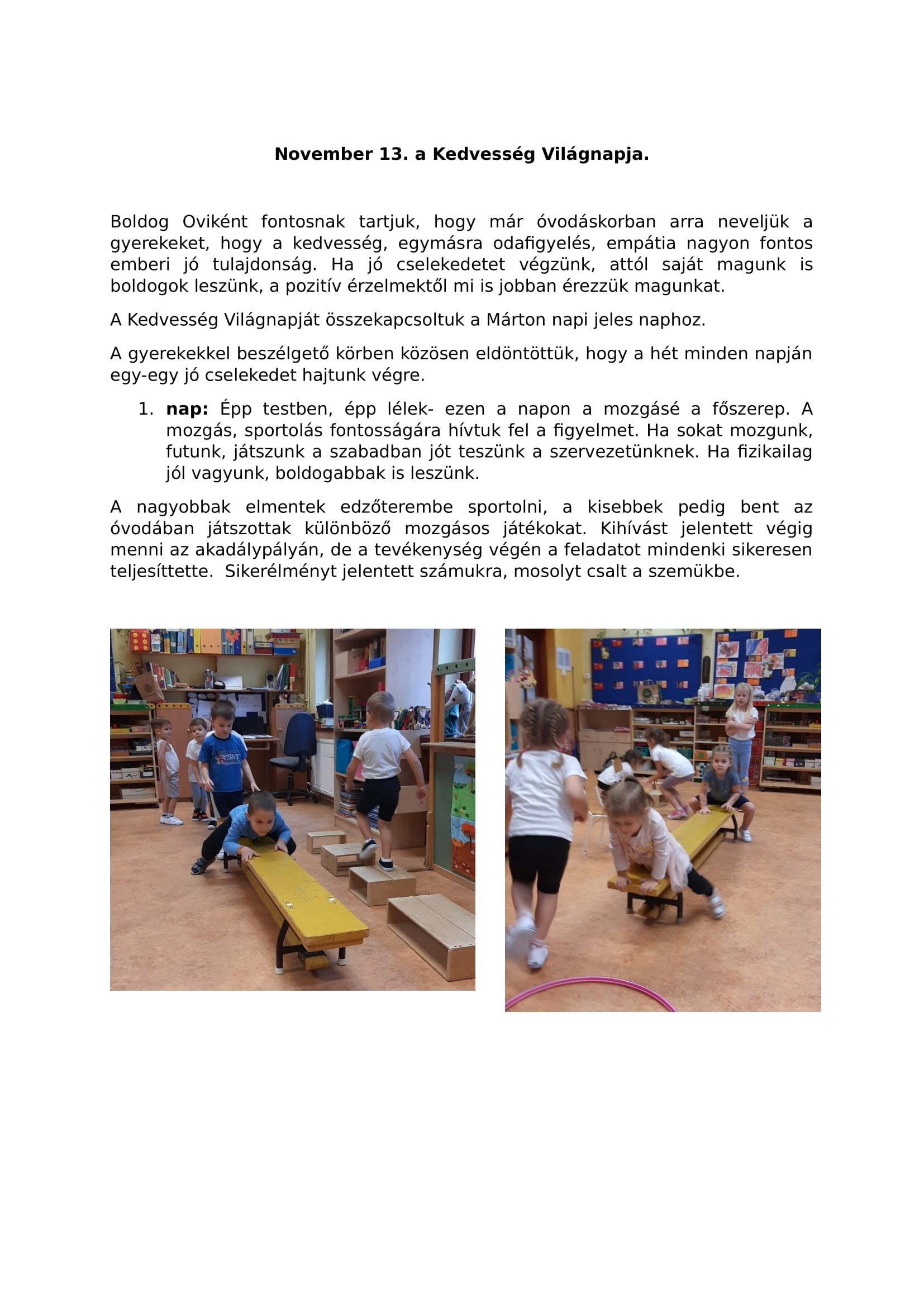 A nagyobbak elmentek edzőterembe sportolni, a kisebbek pedig bent az óvodában játszottak különböző mozgásos játékokat. Kihívást jelentett végig menni az akadálypályán, de a tevékenység végén a feladatot mindenki sikeresen teljesíttette. Sikerélményt jelentett számukra, mosolyt csalt a szemükbe.