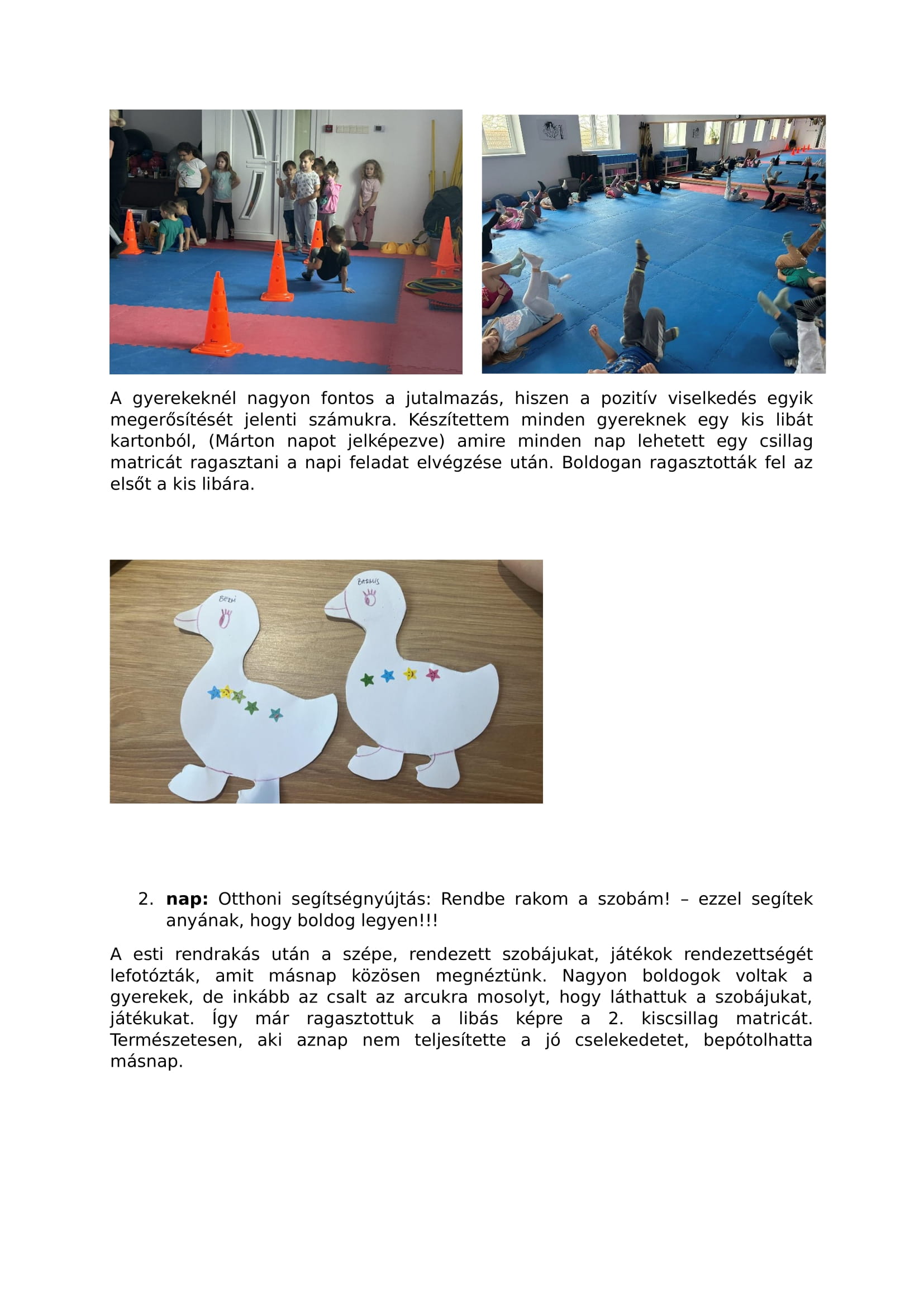 A esti rendrakás után a szépe, rendezett szobájukat, játékok rendezettségét lefotózták, amit másnap közösen megnéztünk. Nagyon boldogok voltak a gyerekek, de inkább az csalt az arcukra mosolyt, hogy láthattuk a szobájukat, játékukat. Így már ragasztottuk a libás képre a 2. kiscsillag matricát. Természetesen, aki aznap nem teljesítette a jó cselekedetet, bepótolhatta másnap.