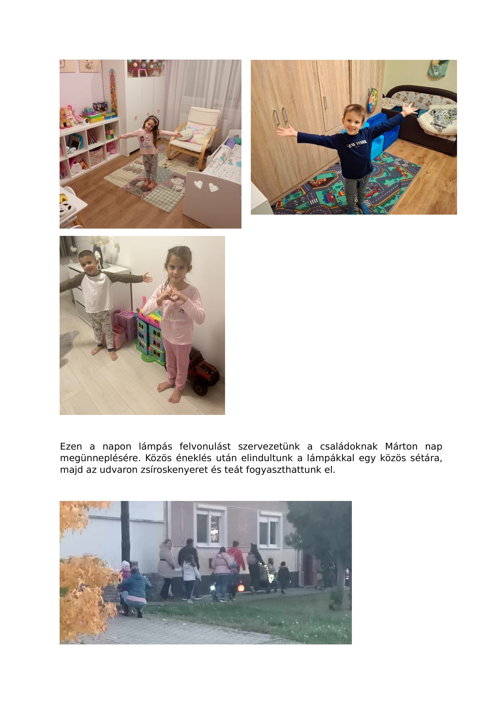 Ezen a napon lámpás felvonulást szervezetünk a családoknak Márton nap megünneplésére. Közös éneklés után elindultunk a lámpákkal egy közös sétára, majd az udvaron zsíroskenyeret és teát fogyaszthattunk el.