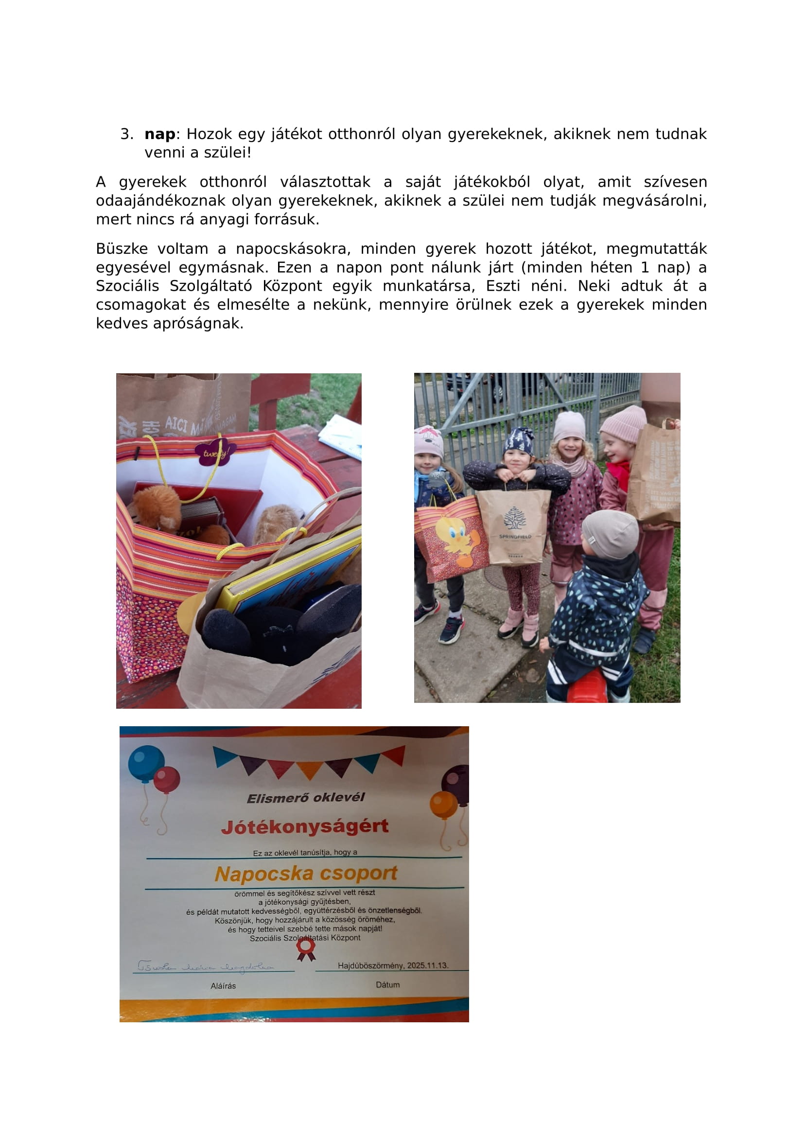 Büszke voltam a napocskásokra, minden gyerek hozott játékot, megmutatták egyesével egymásnak. Ezen a napon pont nálunk járt (minden héten 1 nap) a Szociális Szolgáltató Központ egyik munkatársa, Eszti néni. Neki adtuk át a csomagokat és elmesélte a nekünk, mennyire örülnek ezek a gyerekek minden kedves apróságnak.