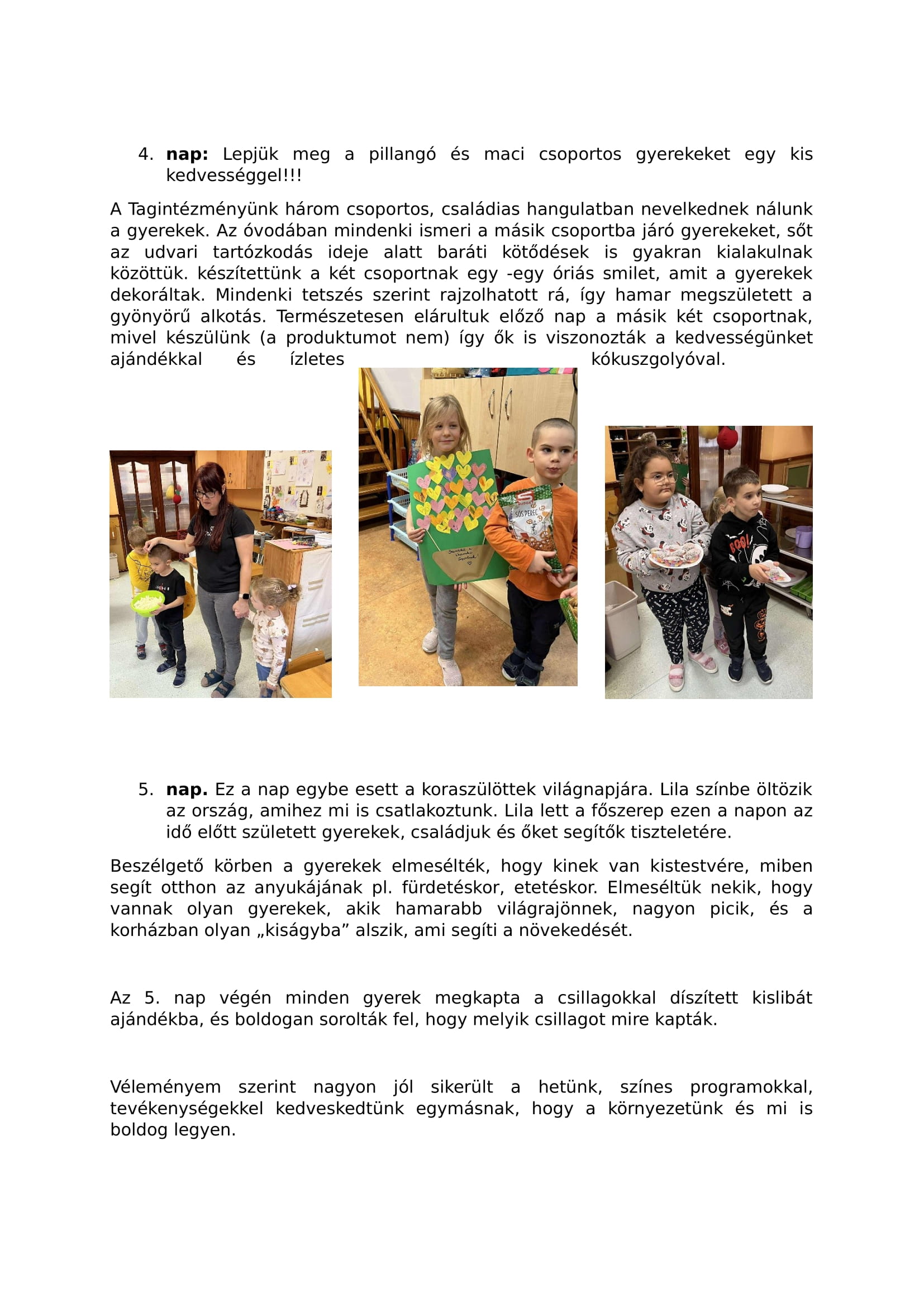 Véleményem szerint nagyon jól sikerült a hetünk, színes programokkal, tevékenységekkel kedveskedtünk egymásnak, hogy a környezetünk és mi is boldog legyen.