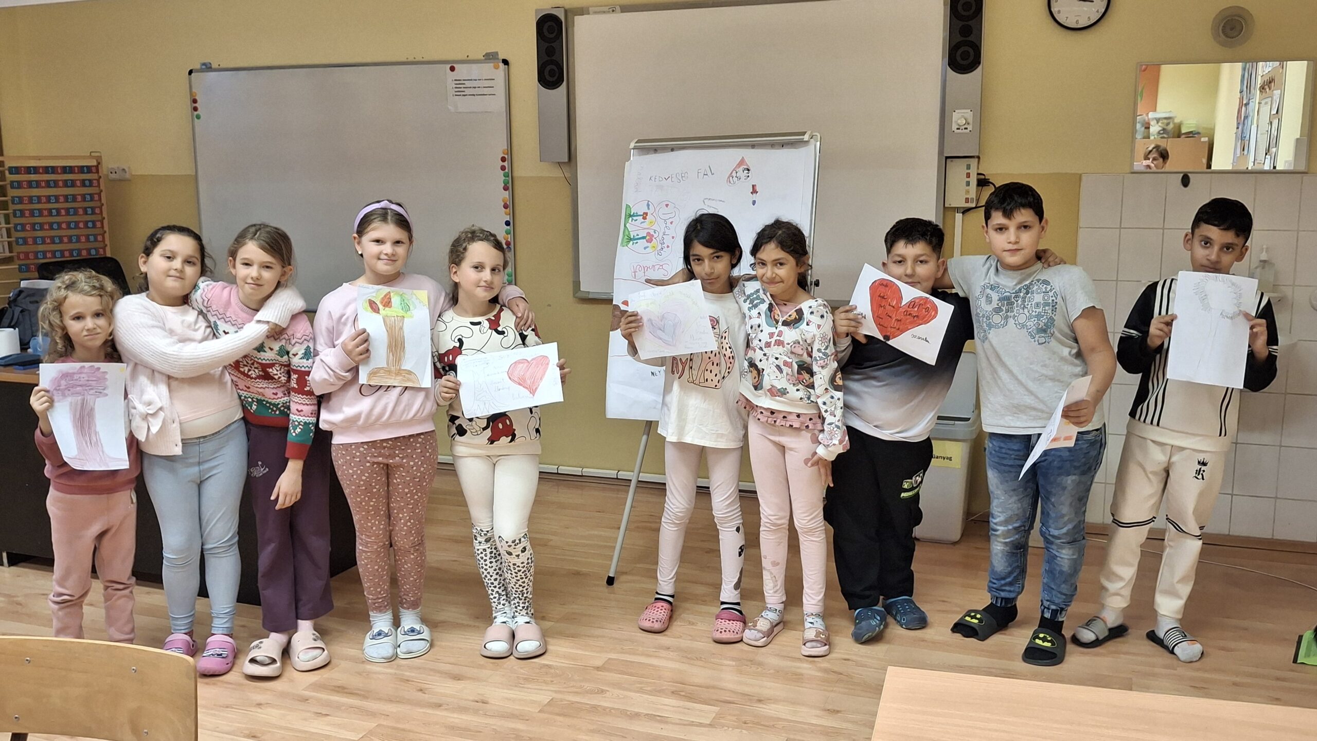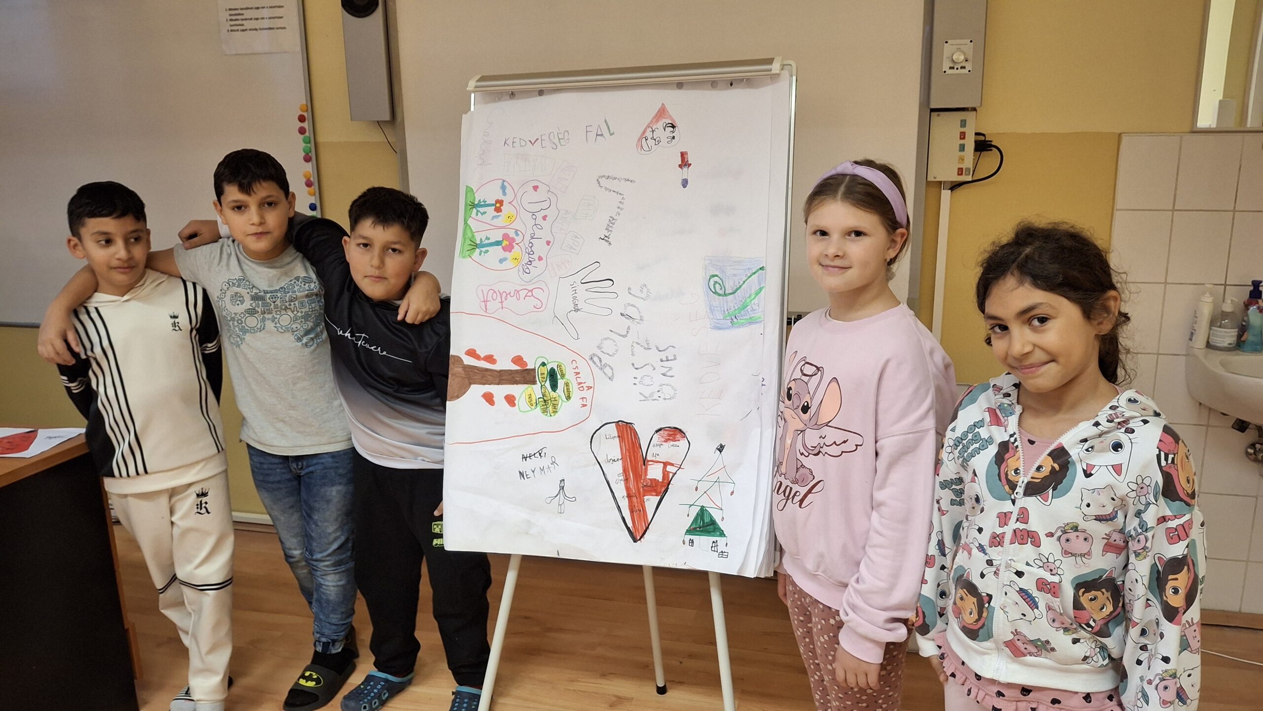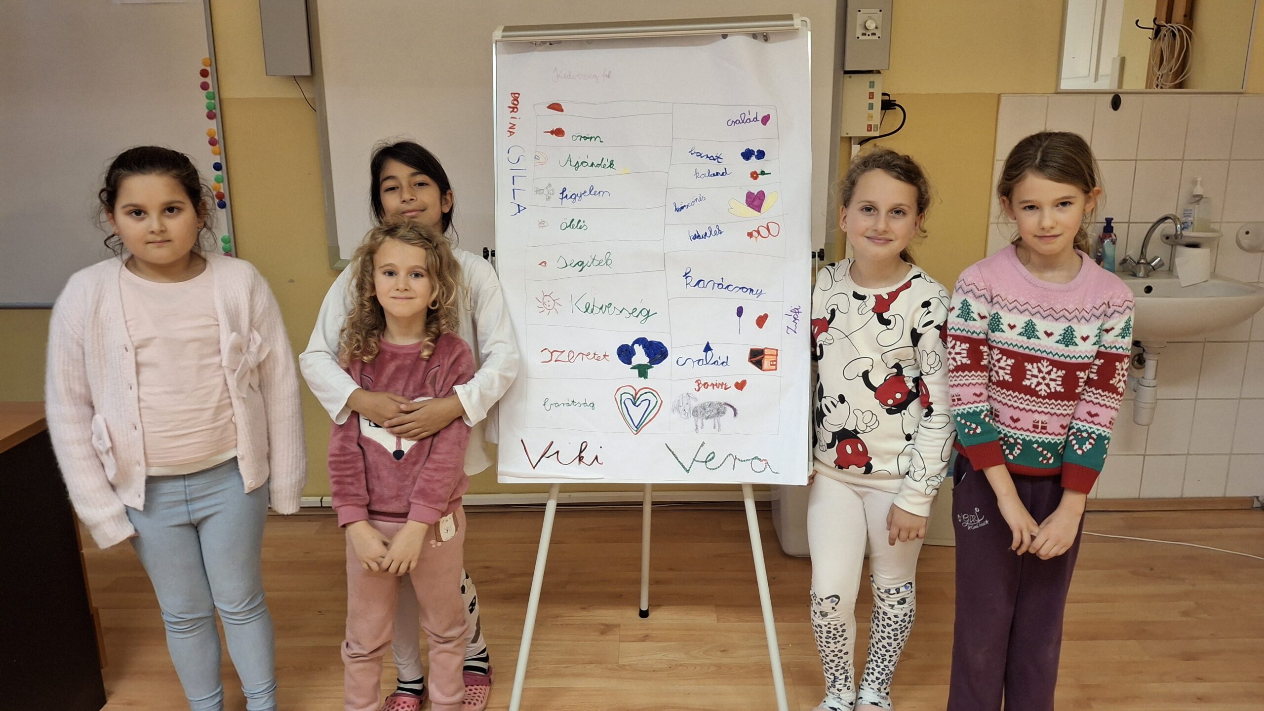 A boldogságóra keretében a gyerekek azt a feladatot kapták, hogy minél több szinonimát gyűjtsenek a kedvesség fogalmára. Olyan kedves szavakat és mondatokat írtak le, amelyeket a mindennapokban is használnak mások bátorítására és megerősítésére. Az elkészült plakát a „Kedvességfal” címet kapta.