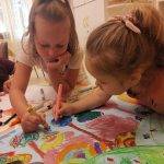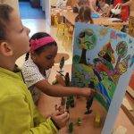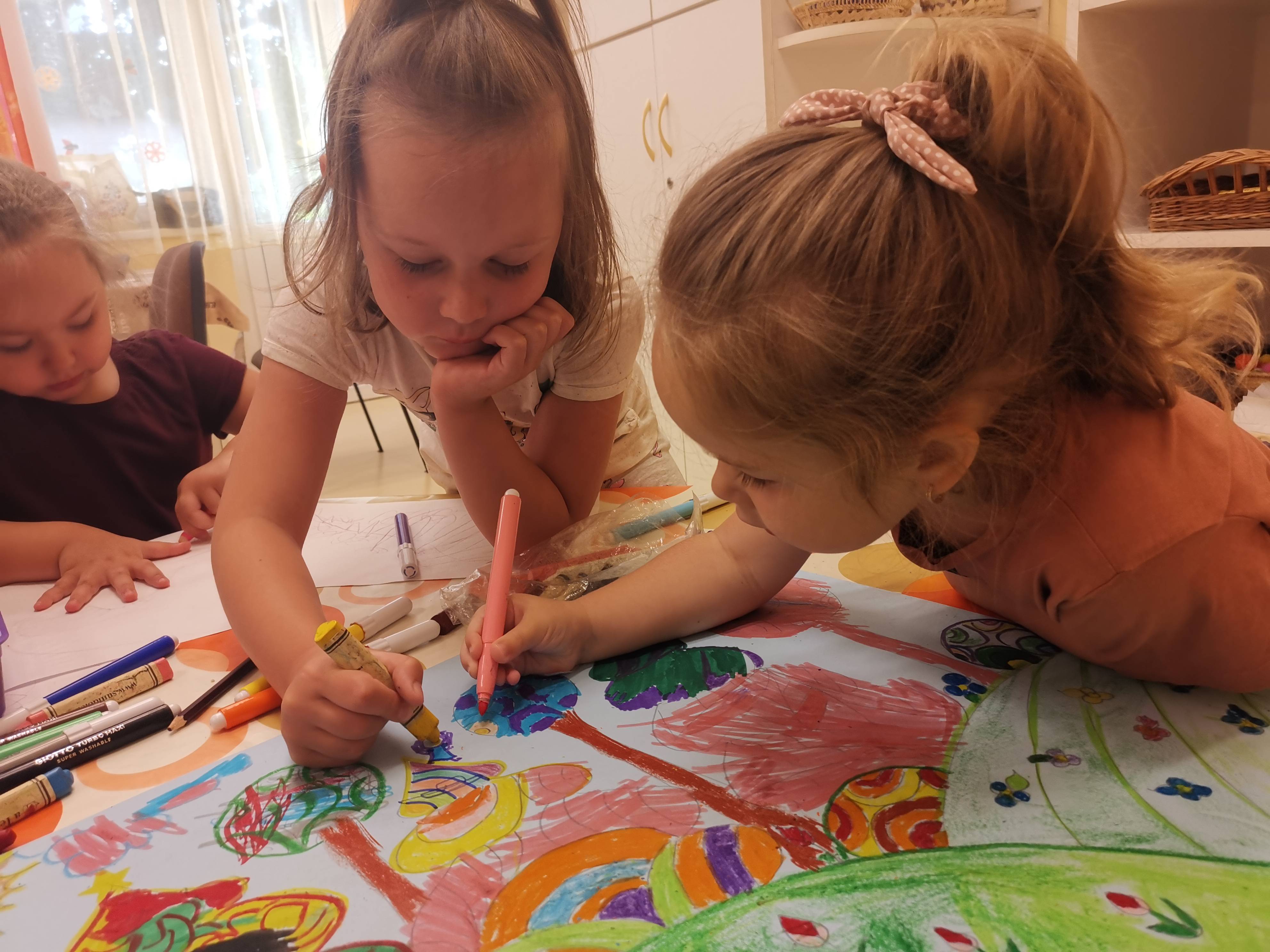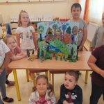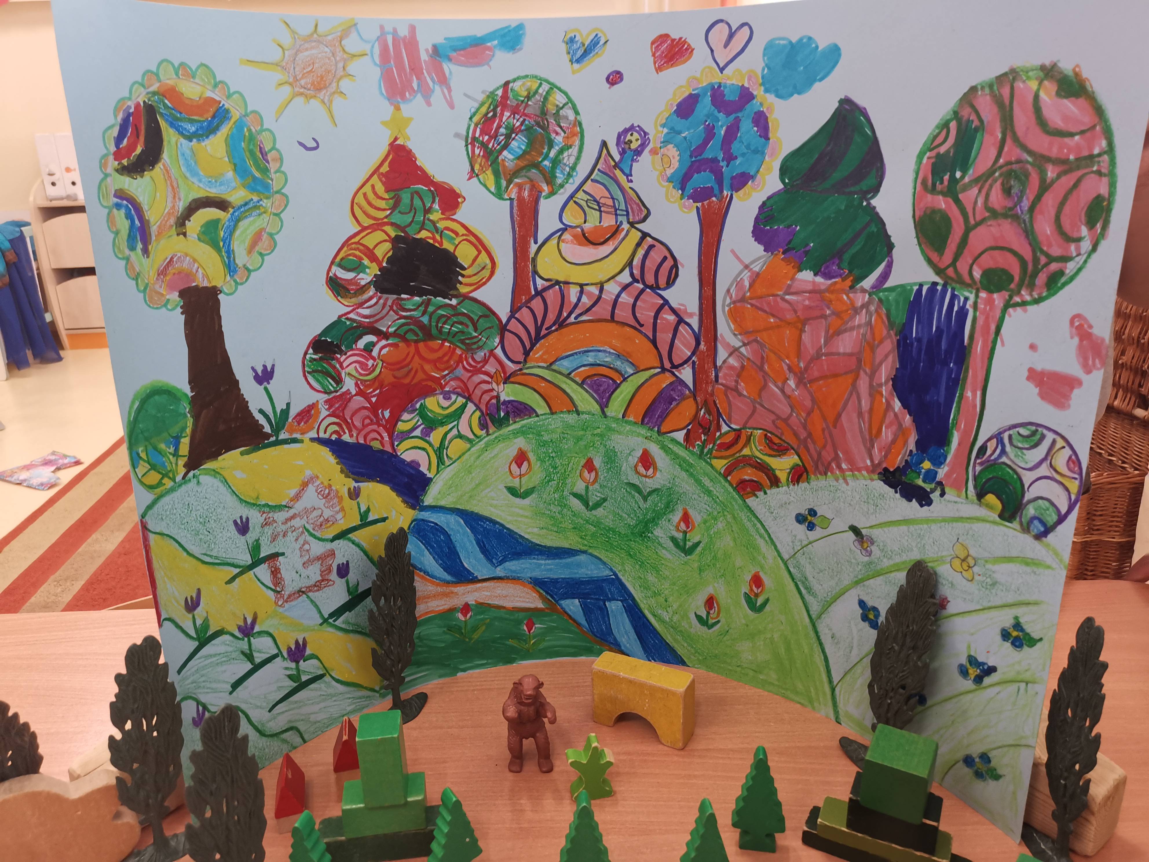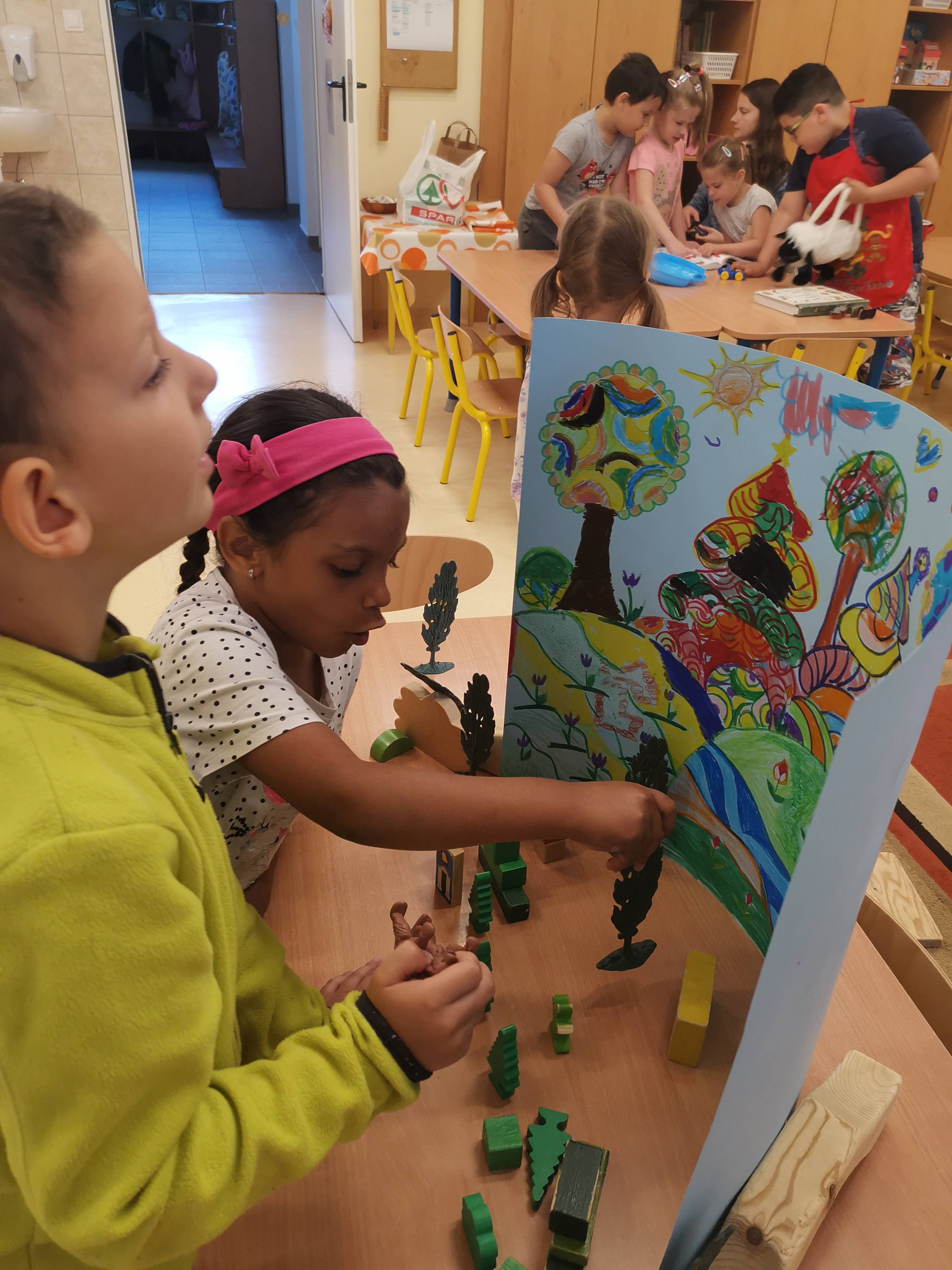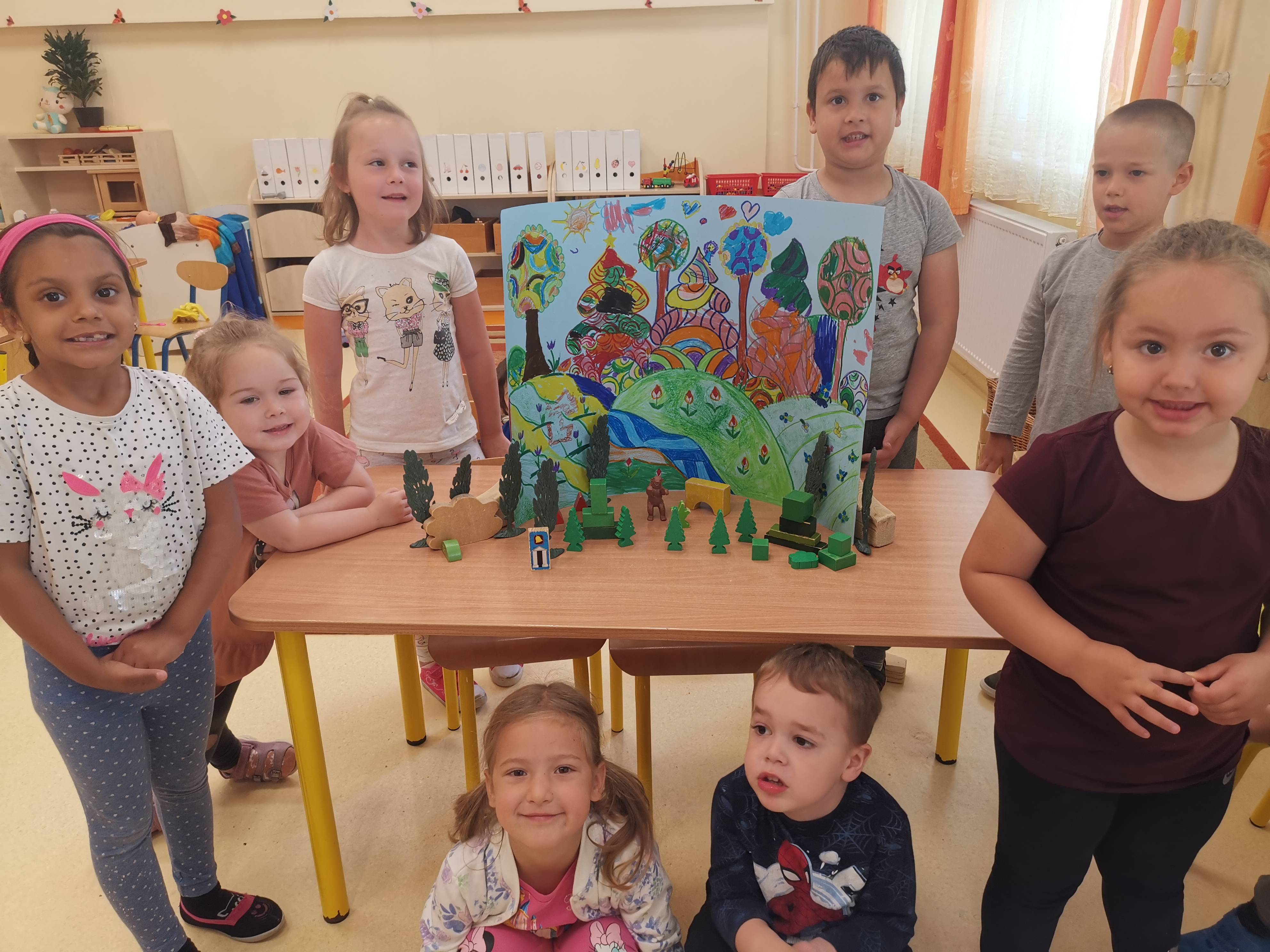 Gyerejek elkészítették közösen a mesebeli kerek erdőt, majd meséket találtak ki hozzá és kiegészítették a rajzot kockákkal.