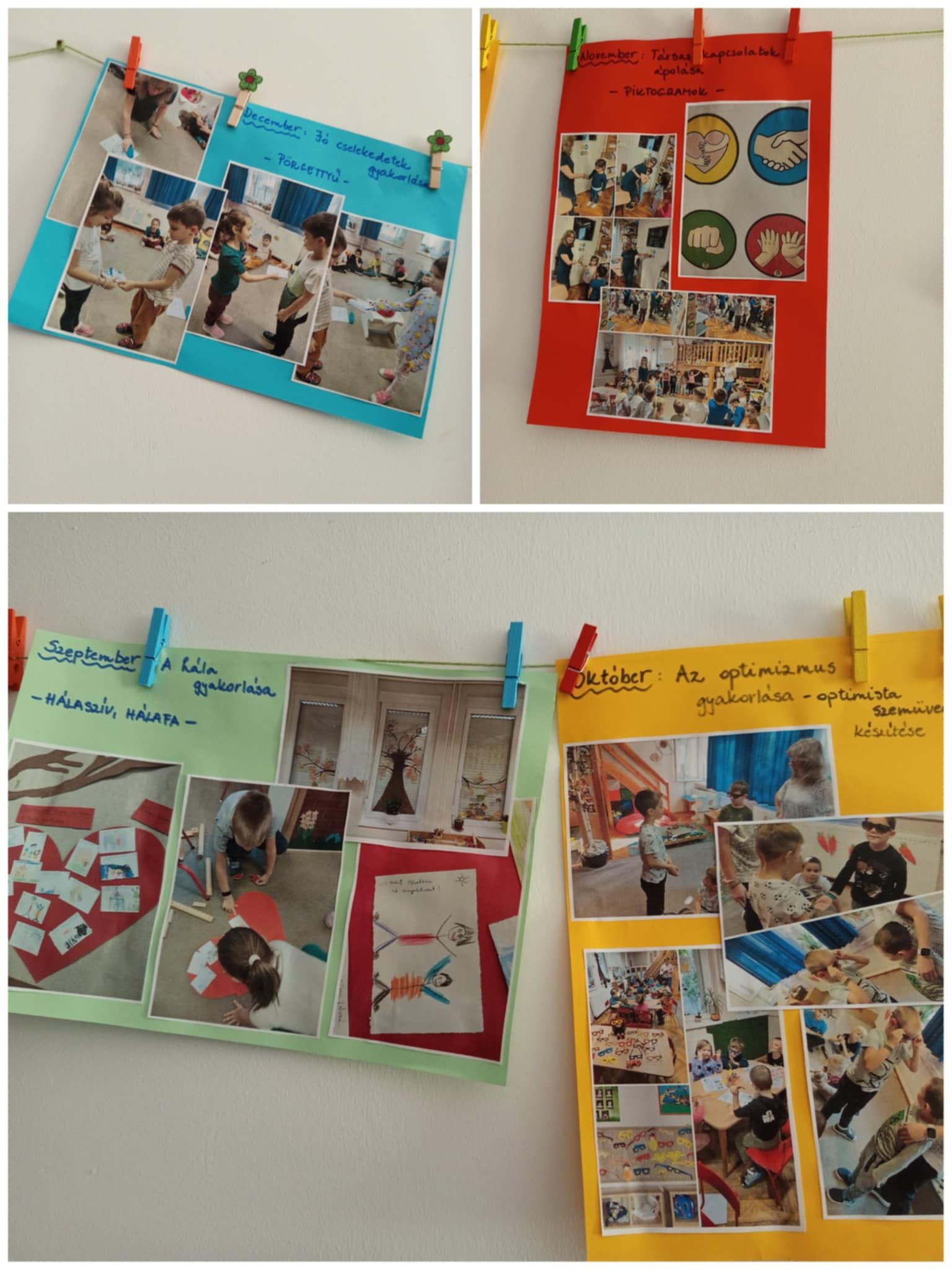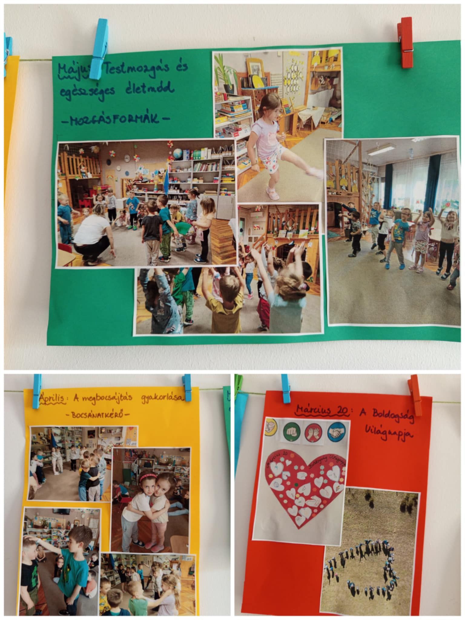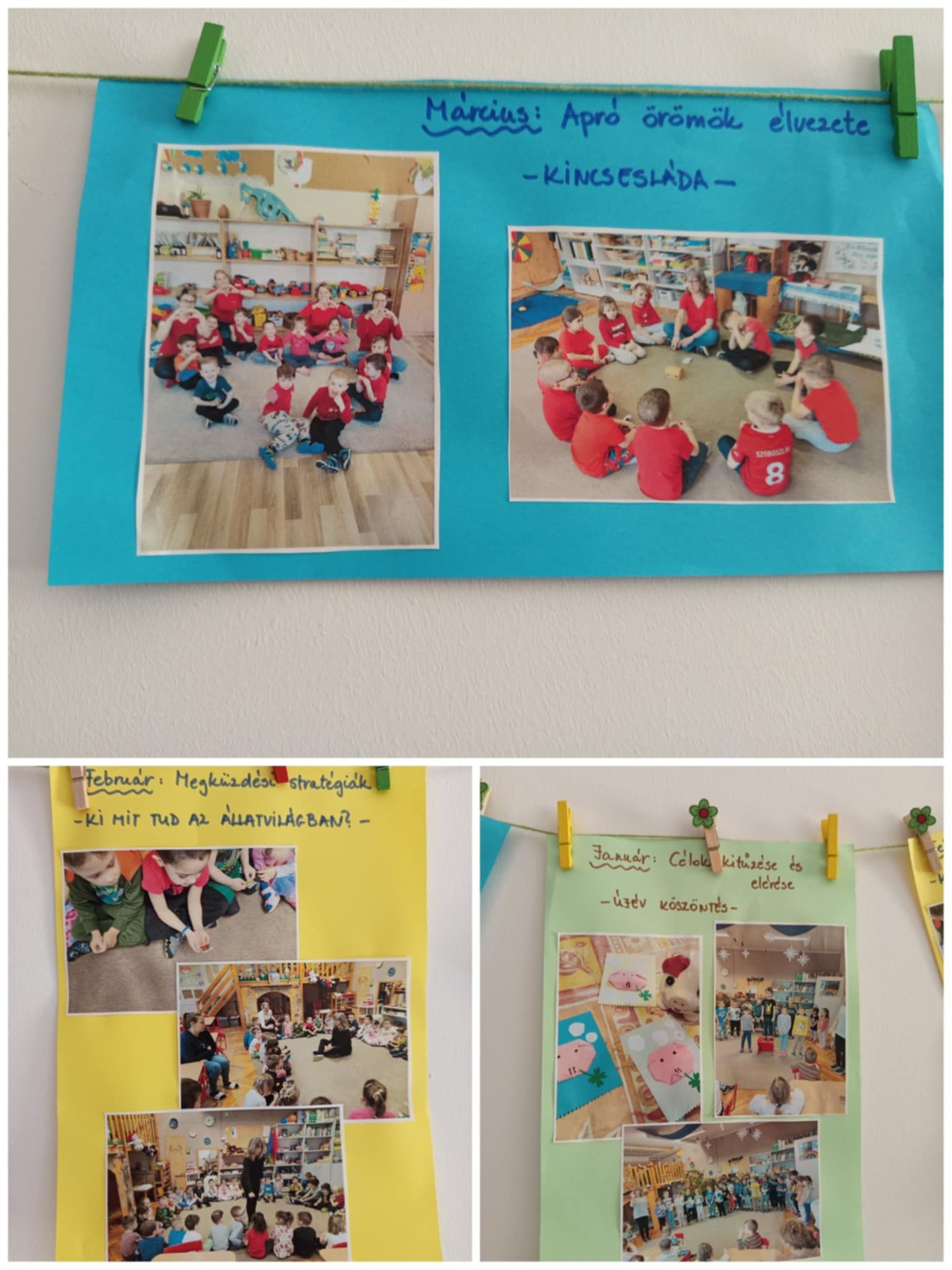 Tanév végén fontosnak tartom megismertetni boldog óvodai életünket a szülőkkel is, ezért kis kiállítást rendeztem az óvoda folyosóján a hónap témáiból. Képekkel mutattam be a havi témákat, feladatokat. Jó volt látni, ahogy a gyerekek felfedezték és felidézték élményeiket és emlékeiket. A szülők is érdeklődve figyelték együtt gyermekükkel, akik örömmel meséltek róla.