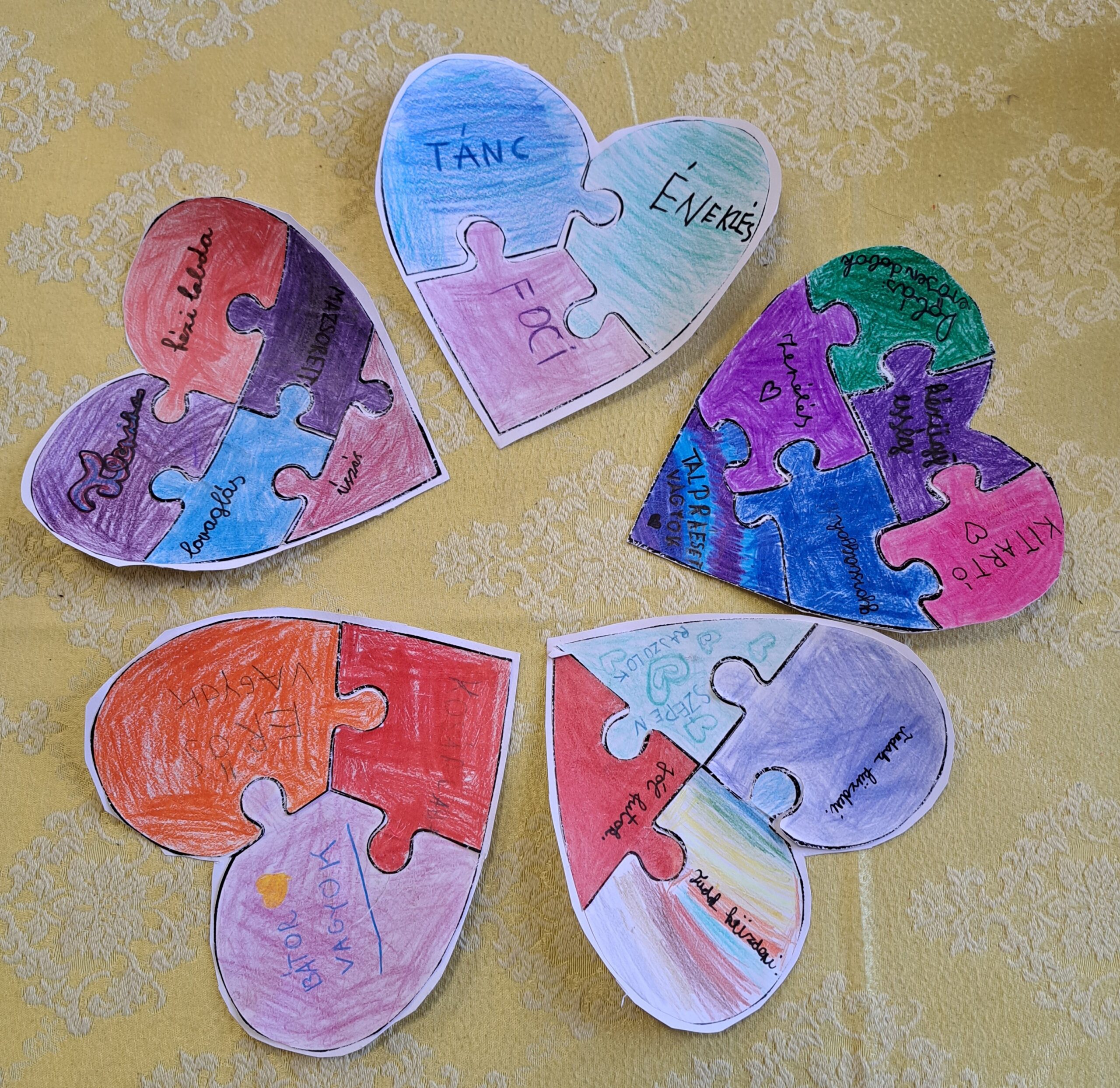 Ezután színezés, majd az erősségek felírása következett. Végül minden darab a helyére került. Az eredmény: színes, különleges, az osztályt is tökéletesen tükröző szívek születtek.