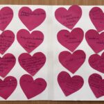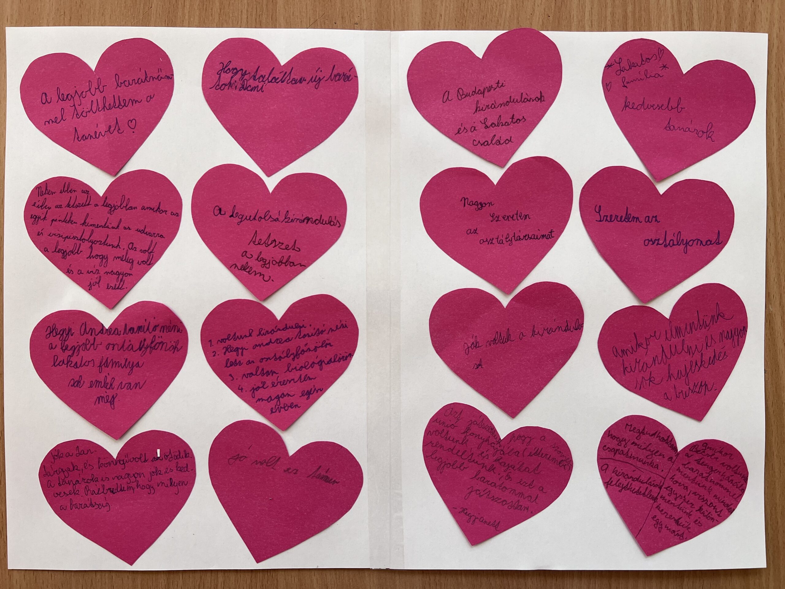 A gyerekekkel közösen gyűjtöttük össze azokat a dolgokat, amelyek ebben az évben örömet okoztak nekünk – minden pozitív élményt, amelyet nem lehet megvenni, de annál értékesebb. Ezeket kis szívecskékbe írtuk bele, és egy nagy közös plakátra helyeztük el őket.