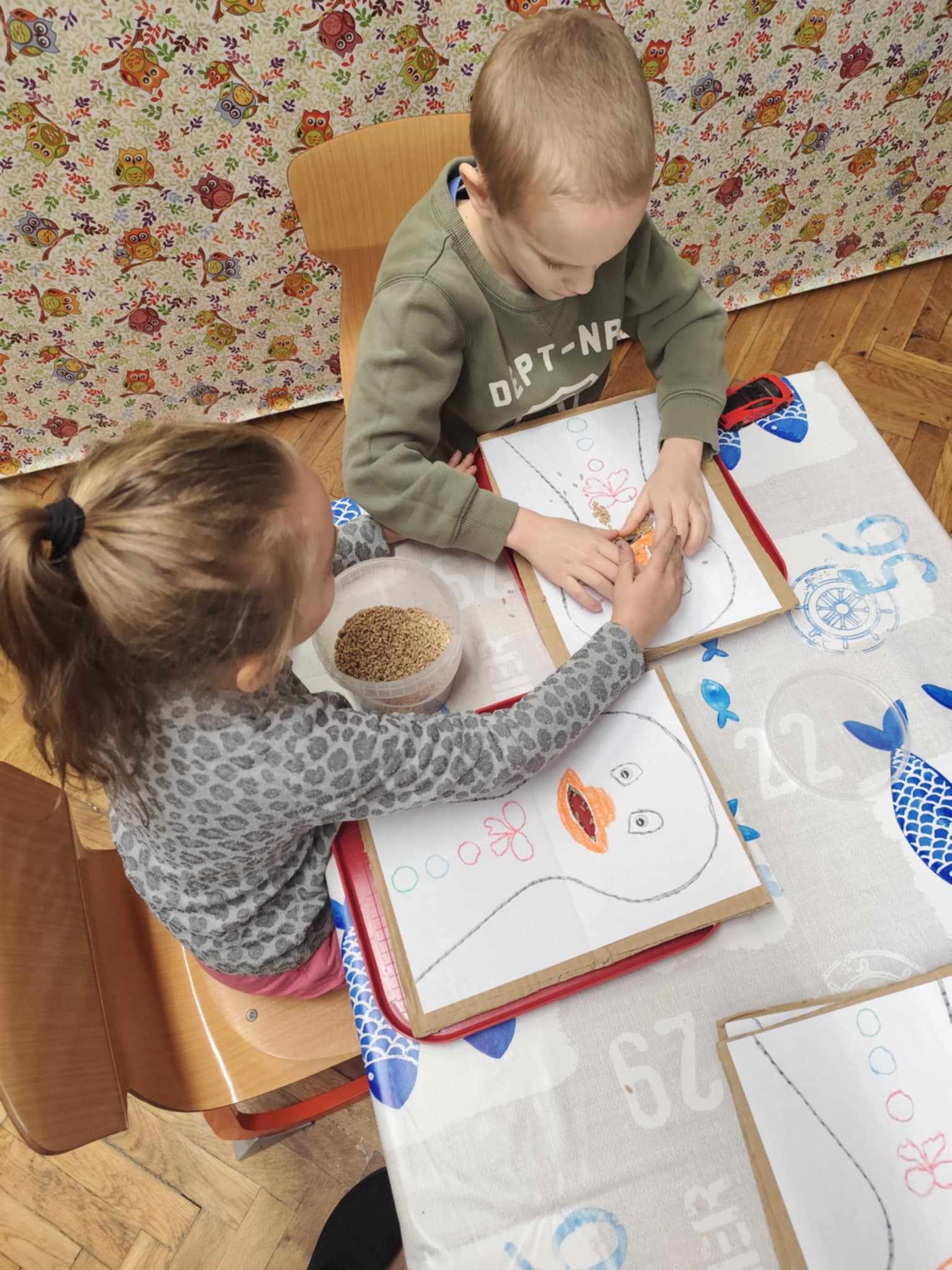 A gyerekek előre rajzolt, kivágott szájú libát etettek búzával és kukoricával. A feladat segítette a finommotorika, a szem-kéz koordináció és az együttműködés fejlődését. A tevékenység közben az alábbi dalokat énekeltük, hallgattuk meg: Száz liba … , A liba mondja gágágá,