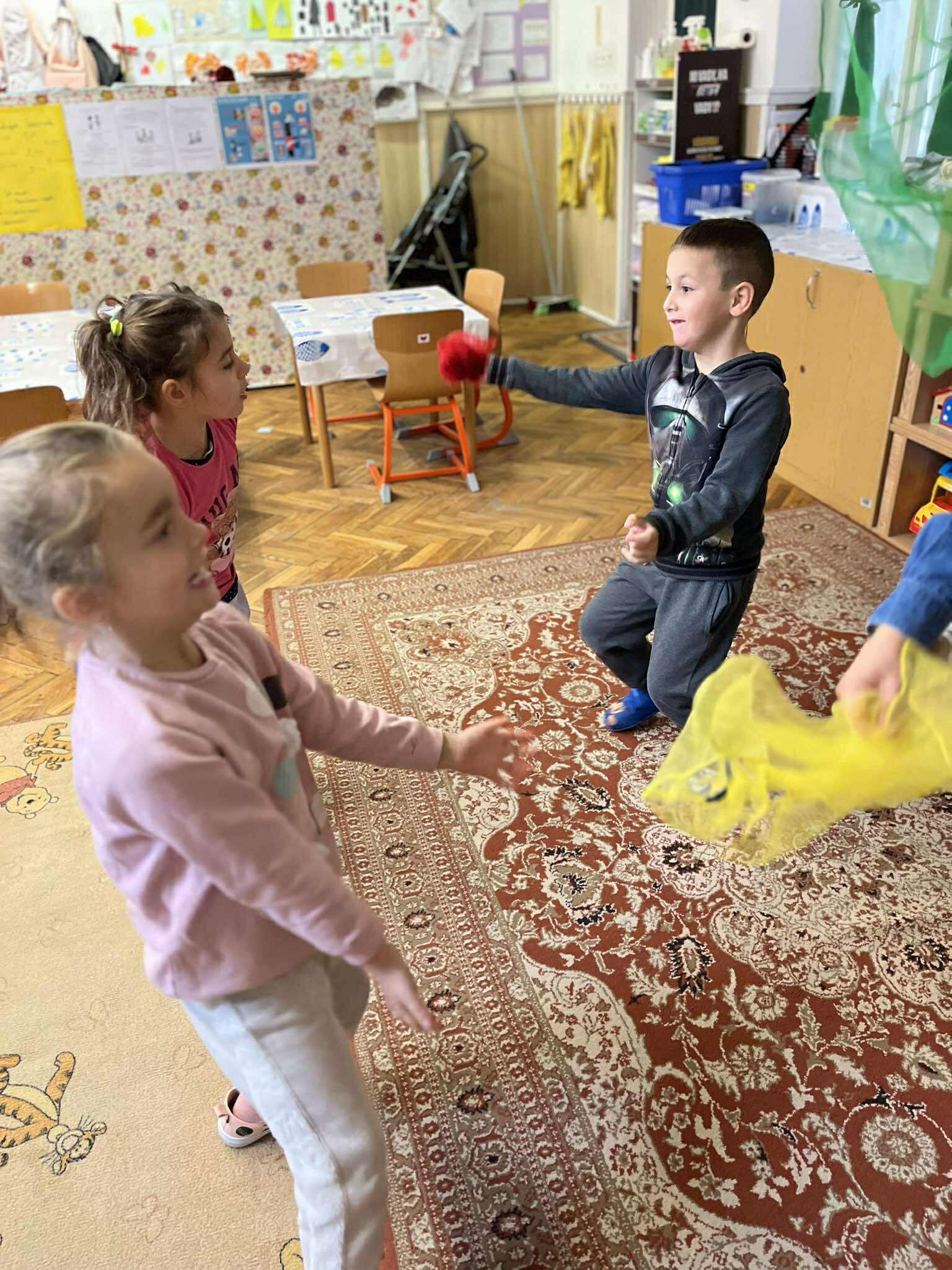 A gyerekek színes kendőkkel mozogtak, egymásnak adták és dobták, majd a foglalkozás végén megölelték egymást. Ez erősítette a kapcsolatokat, a bizalmat és az egymás felé irányuló pozitív érzelmeket. A mozgásos játék során az alábbi énekeket énekeltük: Színes kendő, Süssünk, süssünk valamit.