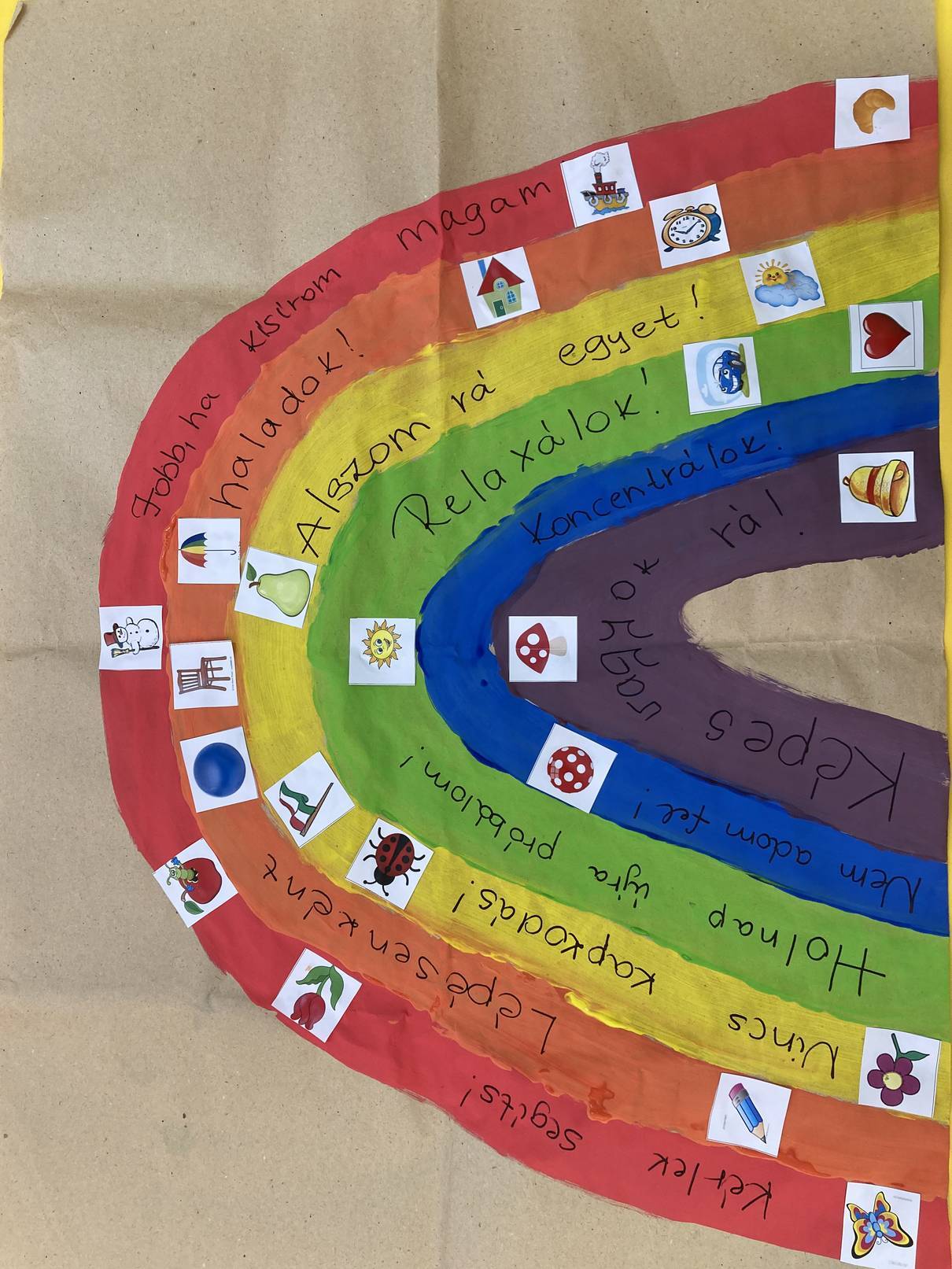 A másik megküzdéseinket ábrázoló tevékenység a szivárvány festése, amelyben a színek által rávezettük a gyerekeket, a különféle nehézségű akadályokra. Minden színhez kapcsoltunk egy-egy stratégiát, amelyhez a csoport minden kis pajtásának a tulajdonságait figyelembe véve úgy csoportosítottuk őket, hogy eddig milyen sérelmekkel, megpróbáltatásokkal találkoztak, és hogy végül mennyire lesznek boldog a megküzdéseik által.