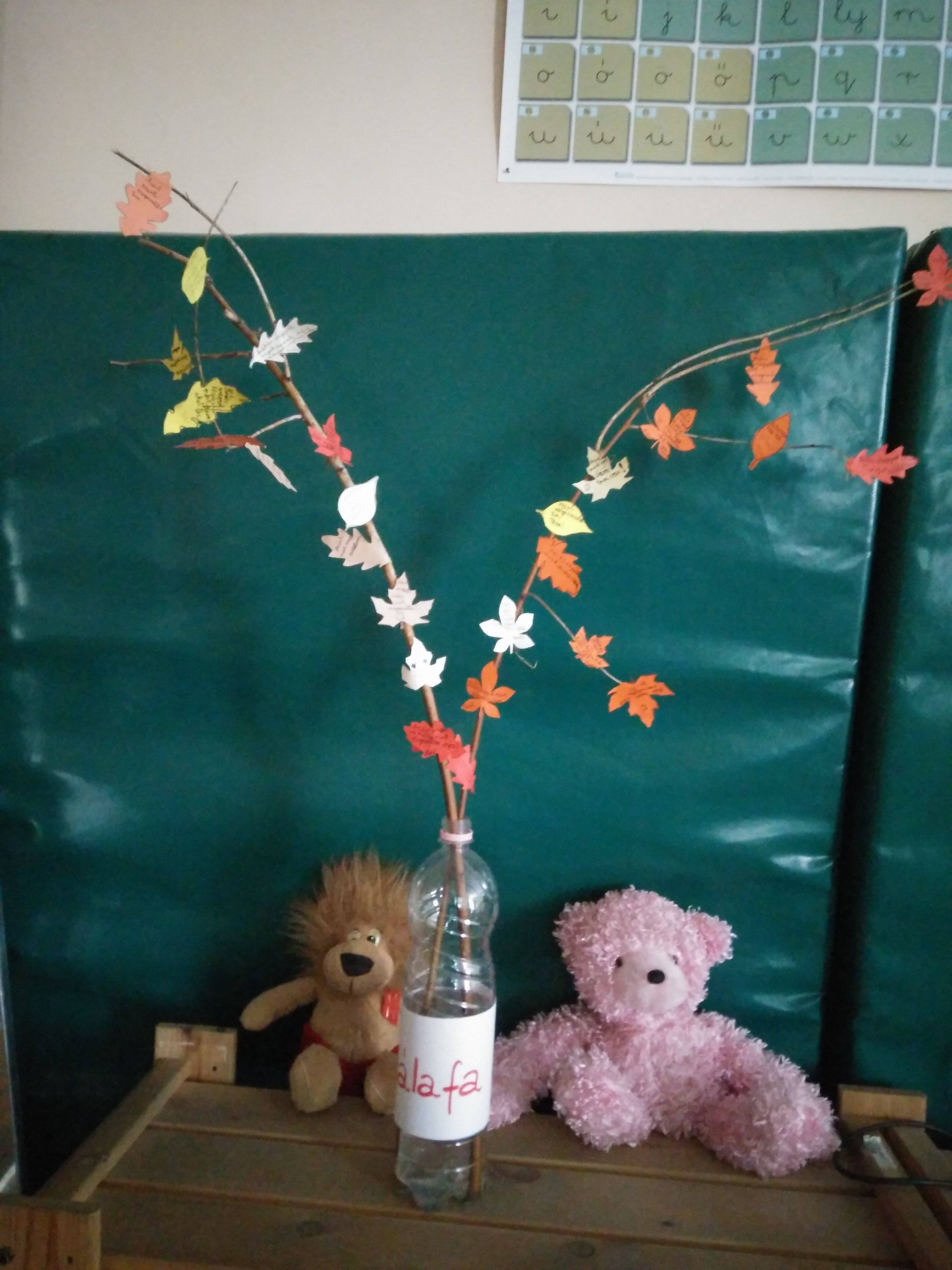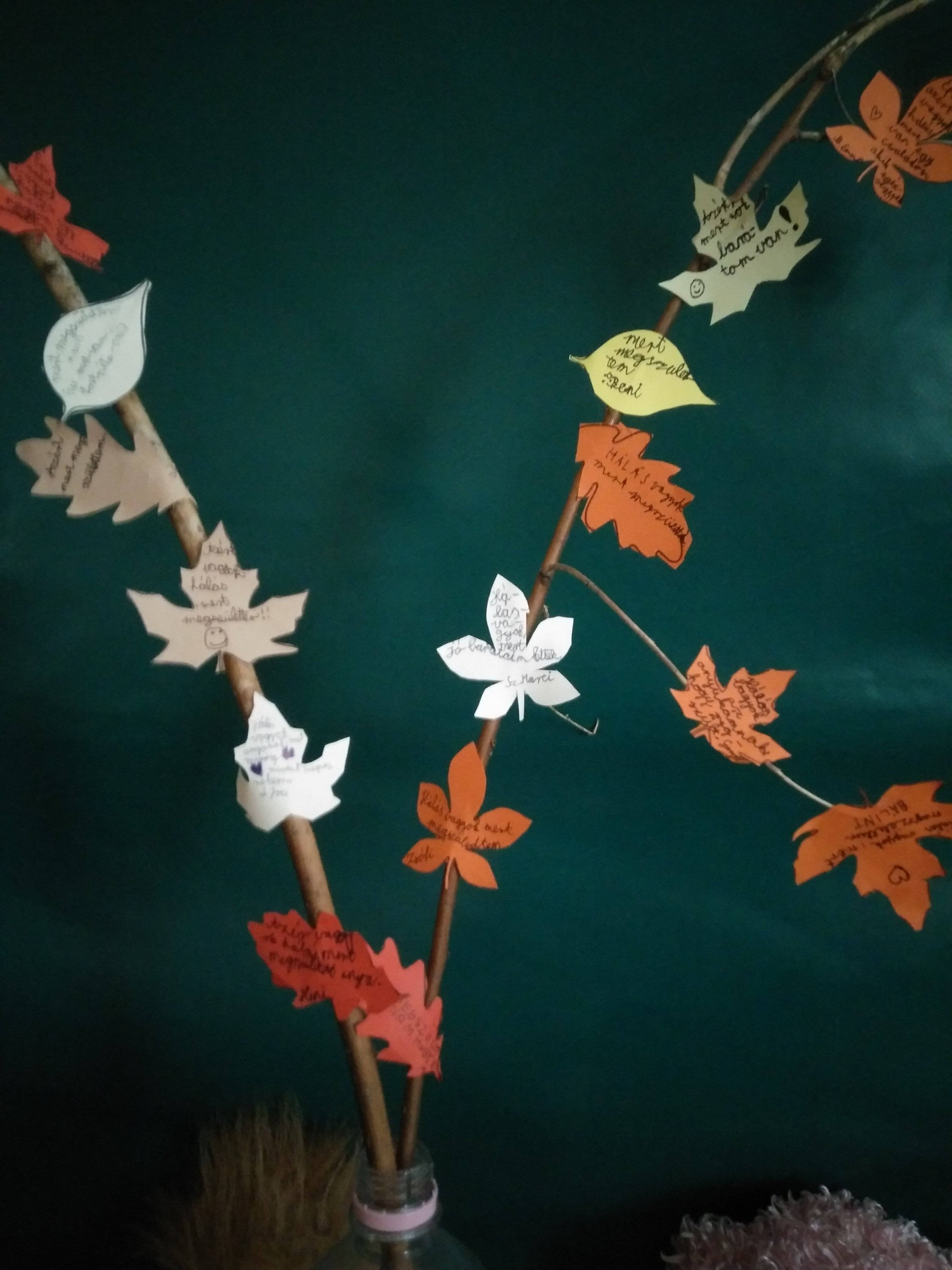 Hálafánkon kedves gondolatok olvashatók: ” Hálás vagyok, mert megszülettem.; Hálás vagyok, mert sok barátom van.; Én azért vagyok hálás, mert nagyon jó családba kerültem…stb.”