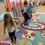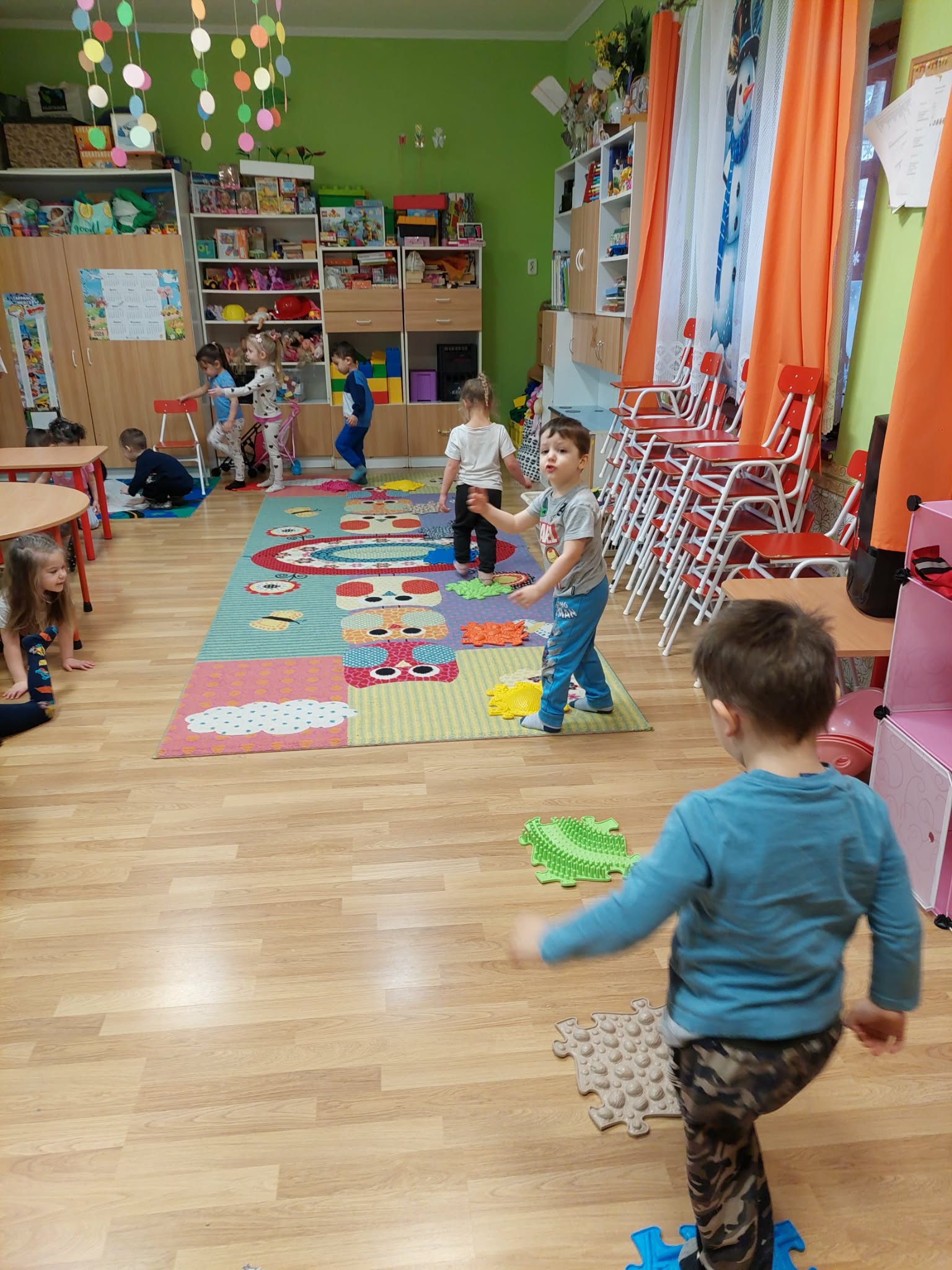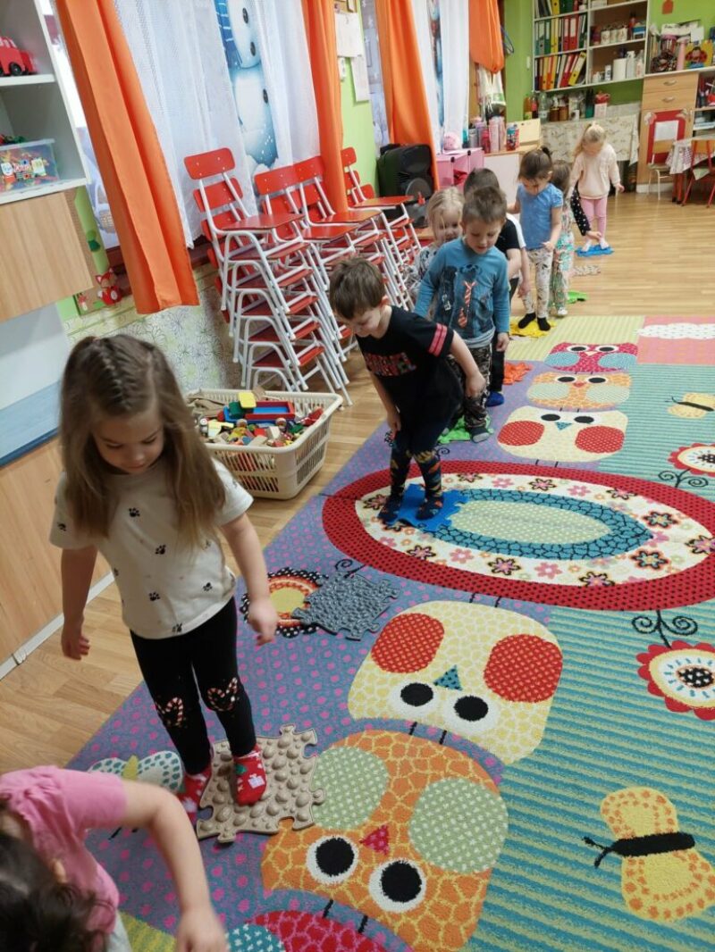 A február hónap a télről, a farsangi szokásokról és a télűzésről szólt. Egész hónapban végig vittem a Boldogságórát, beleszőve a mindennapokba. A kicsik nagyon szeretik a mozgásos gyakorlatokat. A mese, amit elmondtam a gyerekeknek elég hosszú, de bábokkal előadva a figyelmüket végig fenn tudtam tartani azok számára, akik elég érettek már erre. Voltak gyermekek, akik közben mást csináltak, látszólag nem érdekelte őket a mese, de a nap folyamán mégis a kezükbe vették a meséhez használt kesztyűbábokat. A kislányok közül egy páran velem együtt szerették volna újra játszani a mesét a bábokkal. Többször eljátszottuk a mesét, vagy annak csak egy kis részletét. Velem énekelték azt, amit Róza királylány énekelt, hogy legyőzze az előtte álló akadályokat. A tornánk során akadálypályát is készítettünk és legyőztük az akadályokat! Többször végig mentünk rajta. Mi felnőttek is végig lépkedtünk a különböző lépőköveken. A legjobb, de egyben a legszúrósabb a süni volt a lépőkövek közül. Zoknival álltunk rá és többszöri próbálkozásra már kellemesen szúrta a talpunkat.