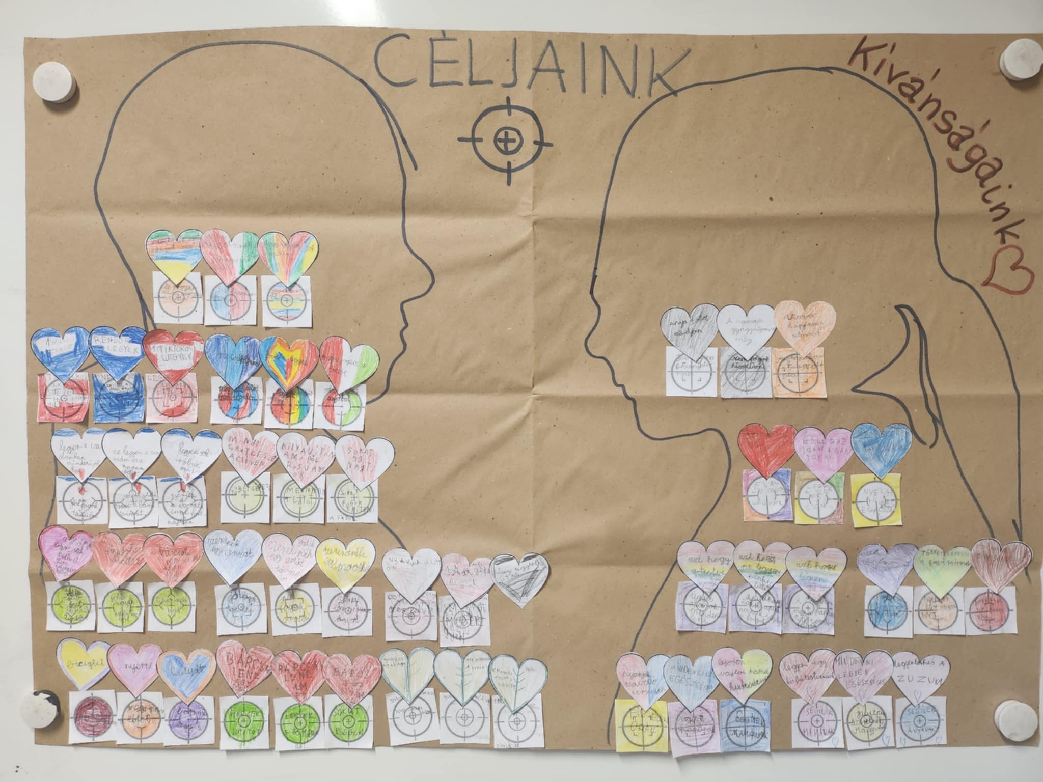 Hoztam nektek papír szívecskéket és céltáblákat. Írjatok 3 kívánságot és célt a papírra.