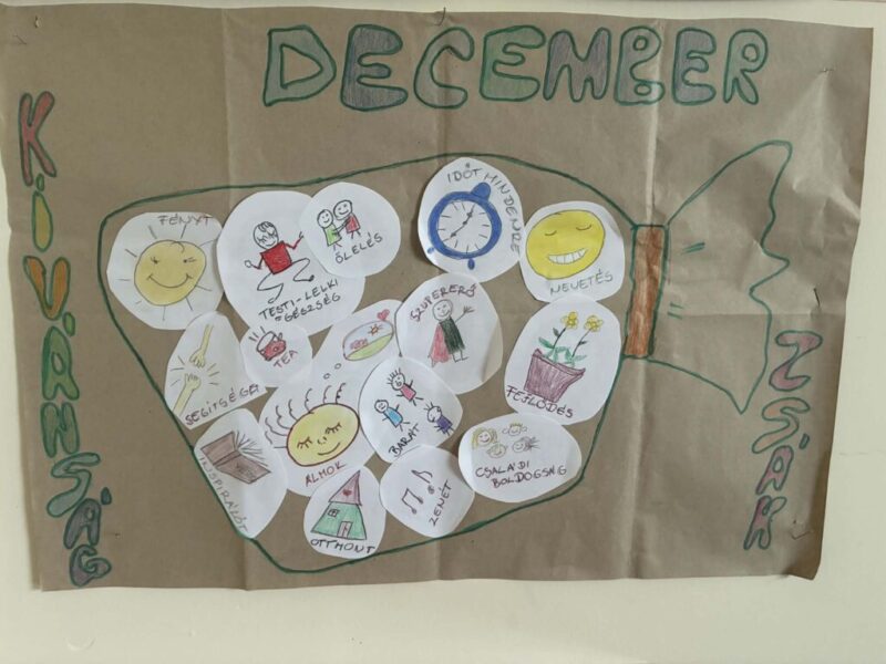 A gyerekekkel átbeszéltük az ajándékozás témakörét: Miért jobb ajándékot adni, mint kapni? Mit kívánunk magunk a hónap napjaira, illetve a fa alá? Rajzzal is illusztráltuk a kívánságokat, amelyekkel jelképesen megtöltöttük „KÍVÁNSÁGOK ZSÁKJÁT.”