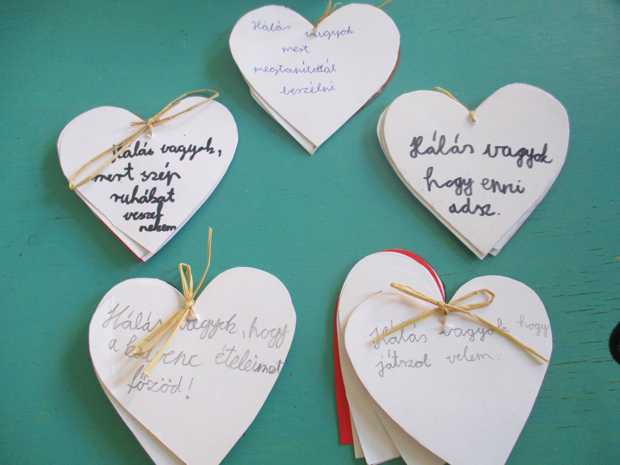 A könyv által ajánlott feladatok közül összegyűjtöttük hálaforrásainkat. Virágszirmokat fűztünk egybe és mindenki elkezdte vezetni hálanaplóját, melybe legtöbbször az édesanyák kerültek. Nekik készítettünk egy az összefűzött virágszirmokból csokrot és hálakártyákat. Végül a naplók ihlették az írásos feladat elkészítését. Versünk teljes egészében közös munkaként született meg.