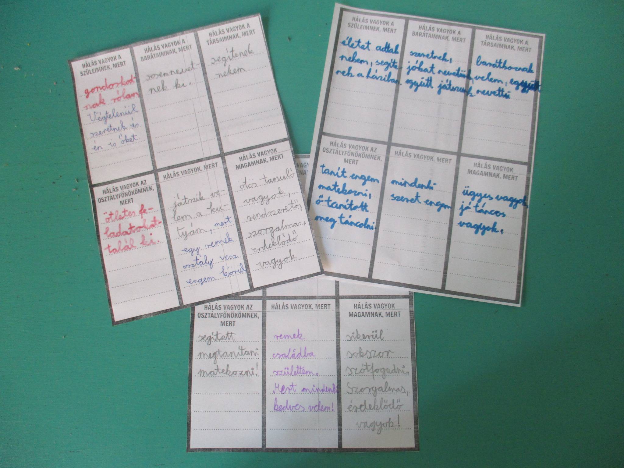 A könyv által ajánlott feladatok közül összegyűjtöttük hálaforrásainkat. Virágszirmokat fűztünk egybe és mindenki elkezdte vezetni hálanaplóját, melybe legtöbbször az édesanyák kerültek. Nekik készítettünk egy az összefűzött virágszirmokból csokrot és hálakártyákat. Végül a naplók ihlették az írásos feladat elkészítését. Versünk teljes egészében közös munkaként született meg.