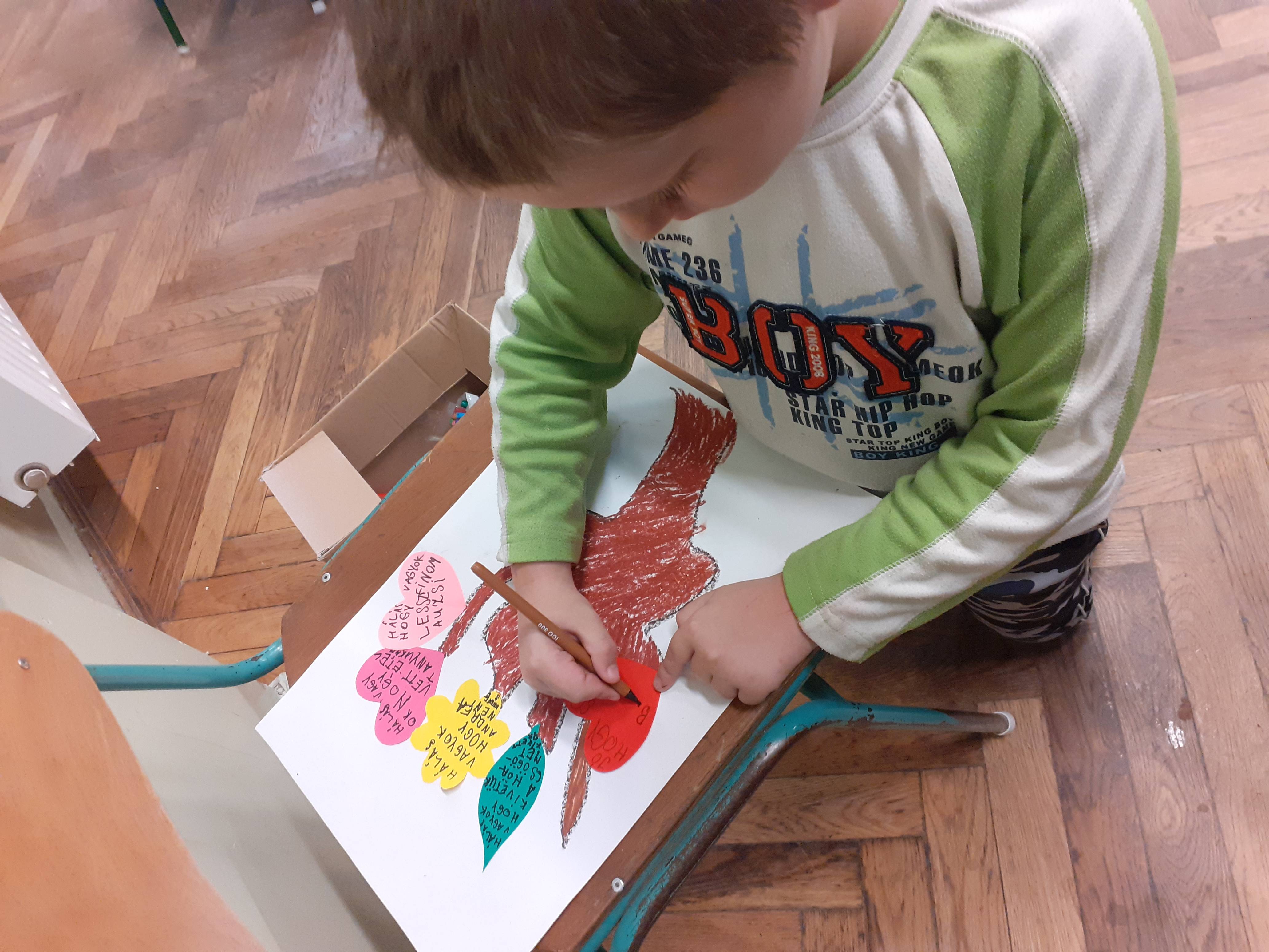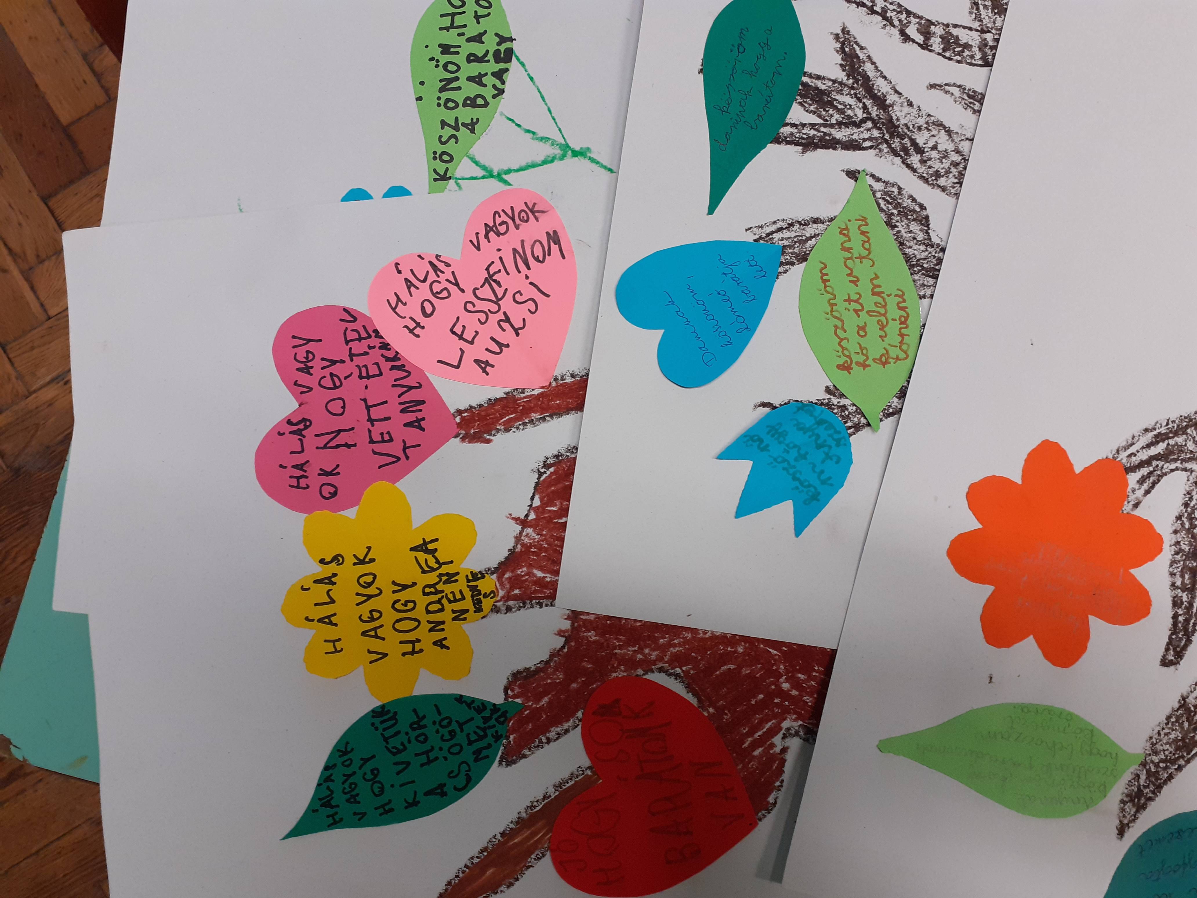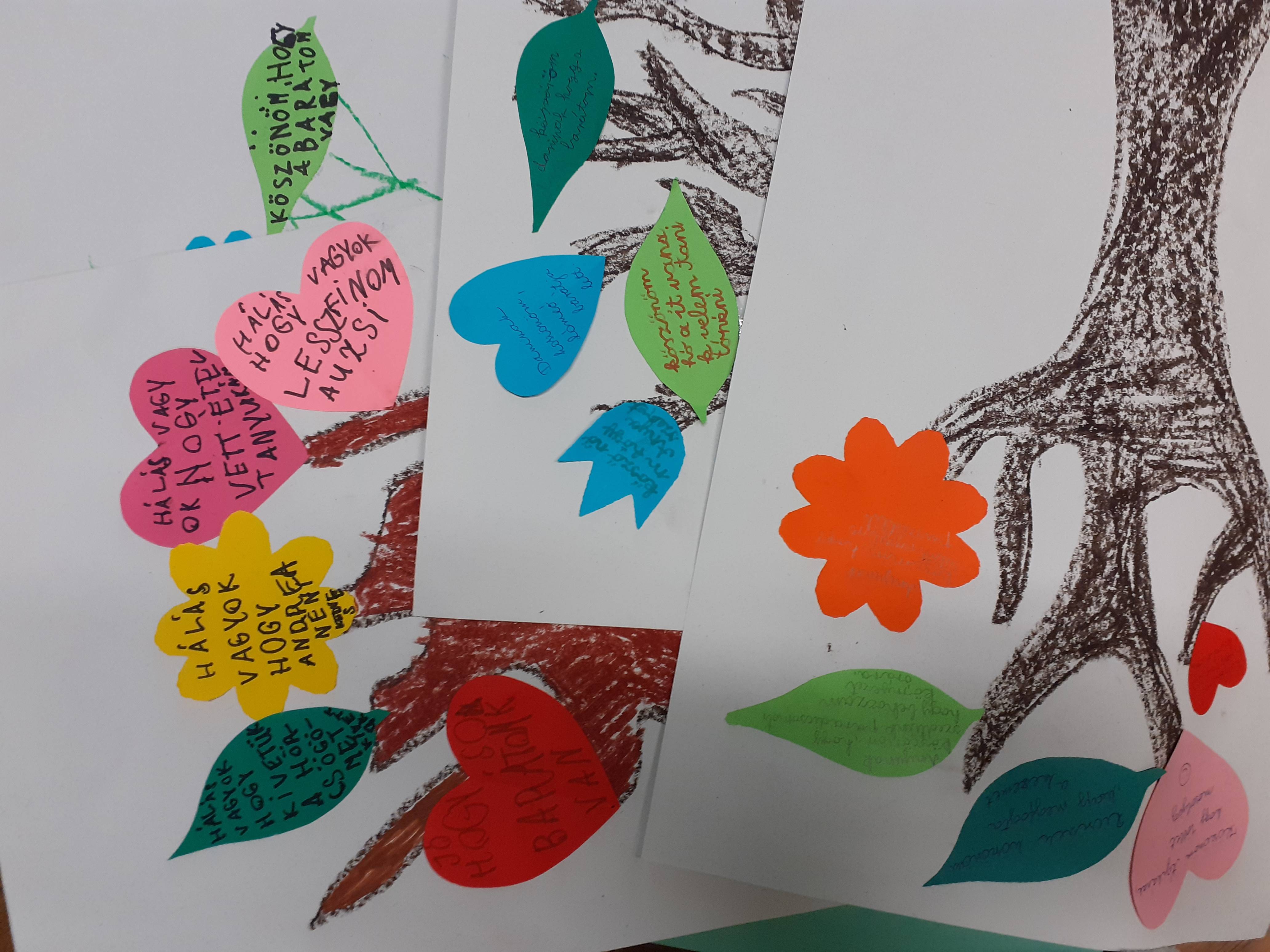 A „Hála” témakörben készített munkánkról tettem fel pár képet, amit egymásnak és maguknak készítettek a gyerekek a kis lelkesedésükkel. Ami nekem örömet jelentett ebben munkafolyamatban az az volt , hogy láthattam az őszinte gondolkodást rajtuk, amint azon törik a fejüket, hogy milyen kedvességet , jót és szép emlékképet , ” hála levélkét”, írjanak egymásnak, s ragasszák fel a megrajzolt ” Köszönöm-fájukra” a „megbecsülés virágával ” és a „jóérzés szívecskéjével” együtt.