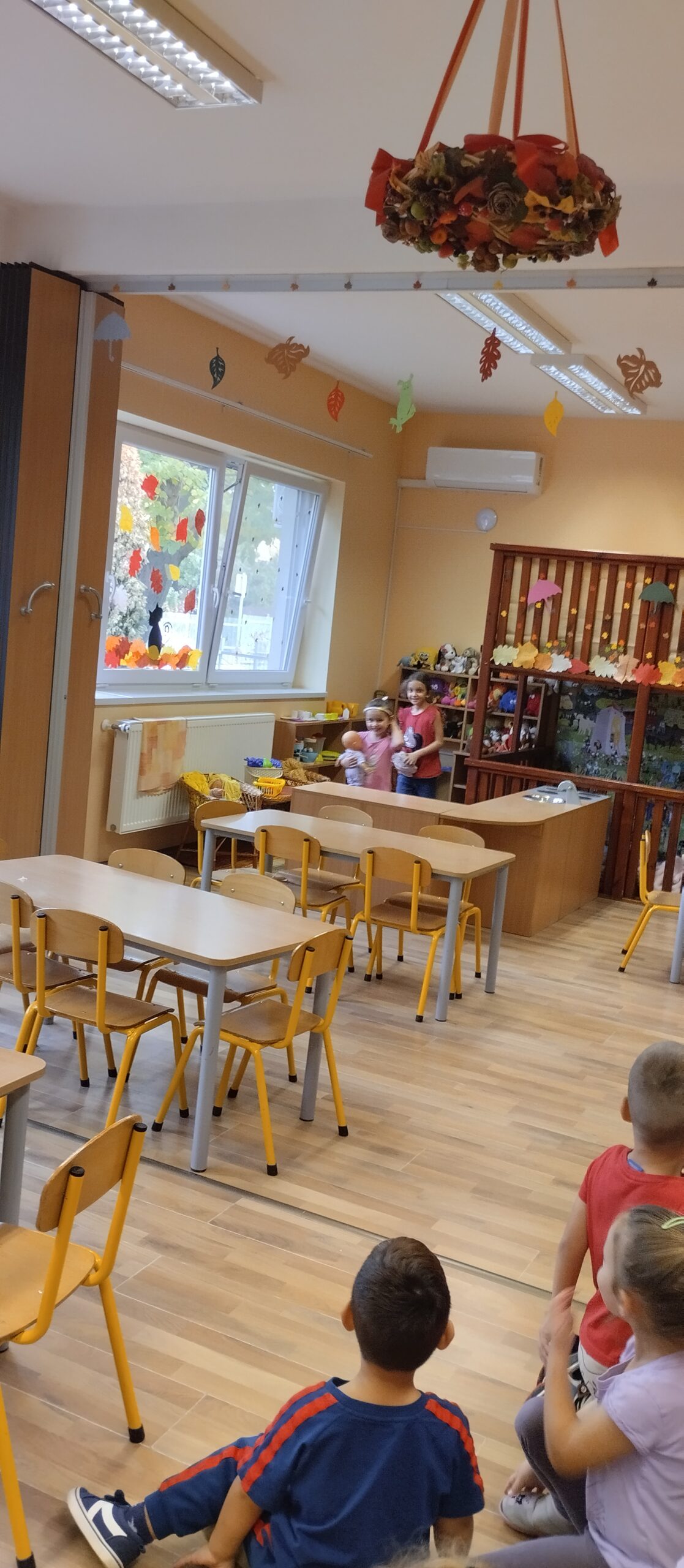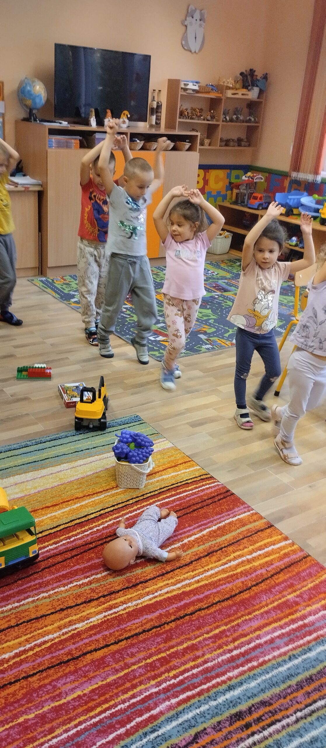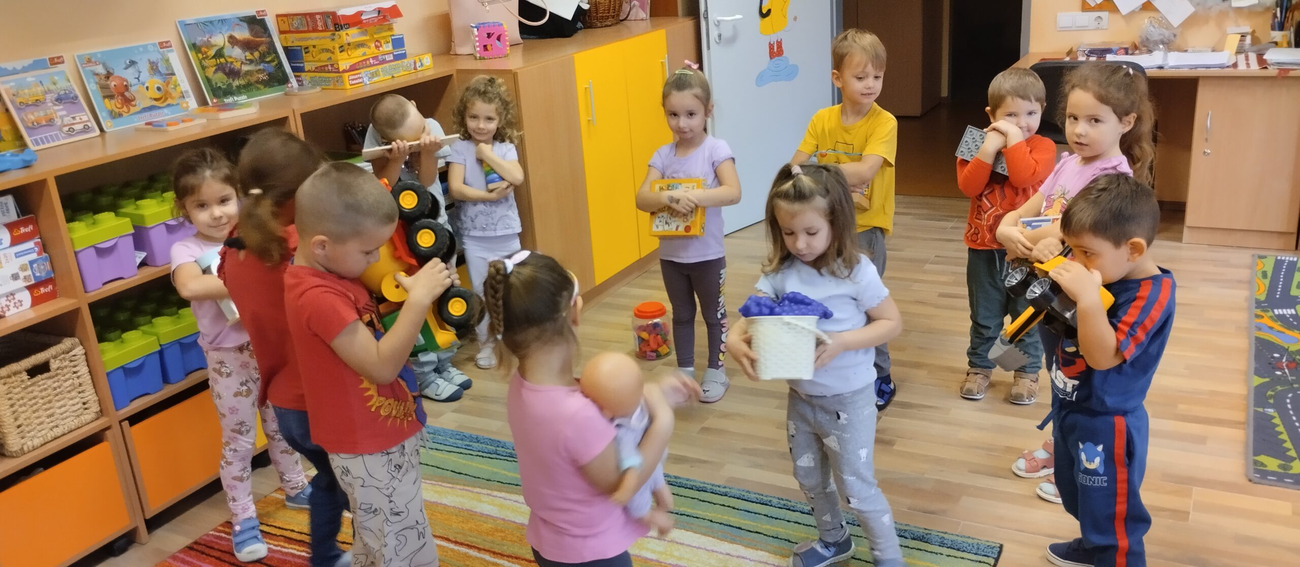 Beszélgető körben a háláról társalogtunk és örültünk annak, hogy együtt lehetünk. Ez után mindenki választott egy kedves játékot, amit körbe rajtunk. Kimentünk az öltözőbe és visszatérve egy szívecske formában találtuk a választott játékokat. Miért lehetett ez a forma? Boldogan találgattuk, miközben körbe jártuk é vidáman birtokba vehettük. Elmesélték a gyerekek kinek miért kedves a játéka.