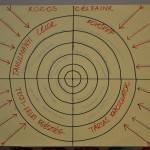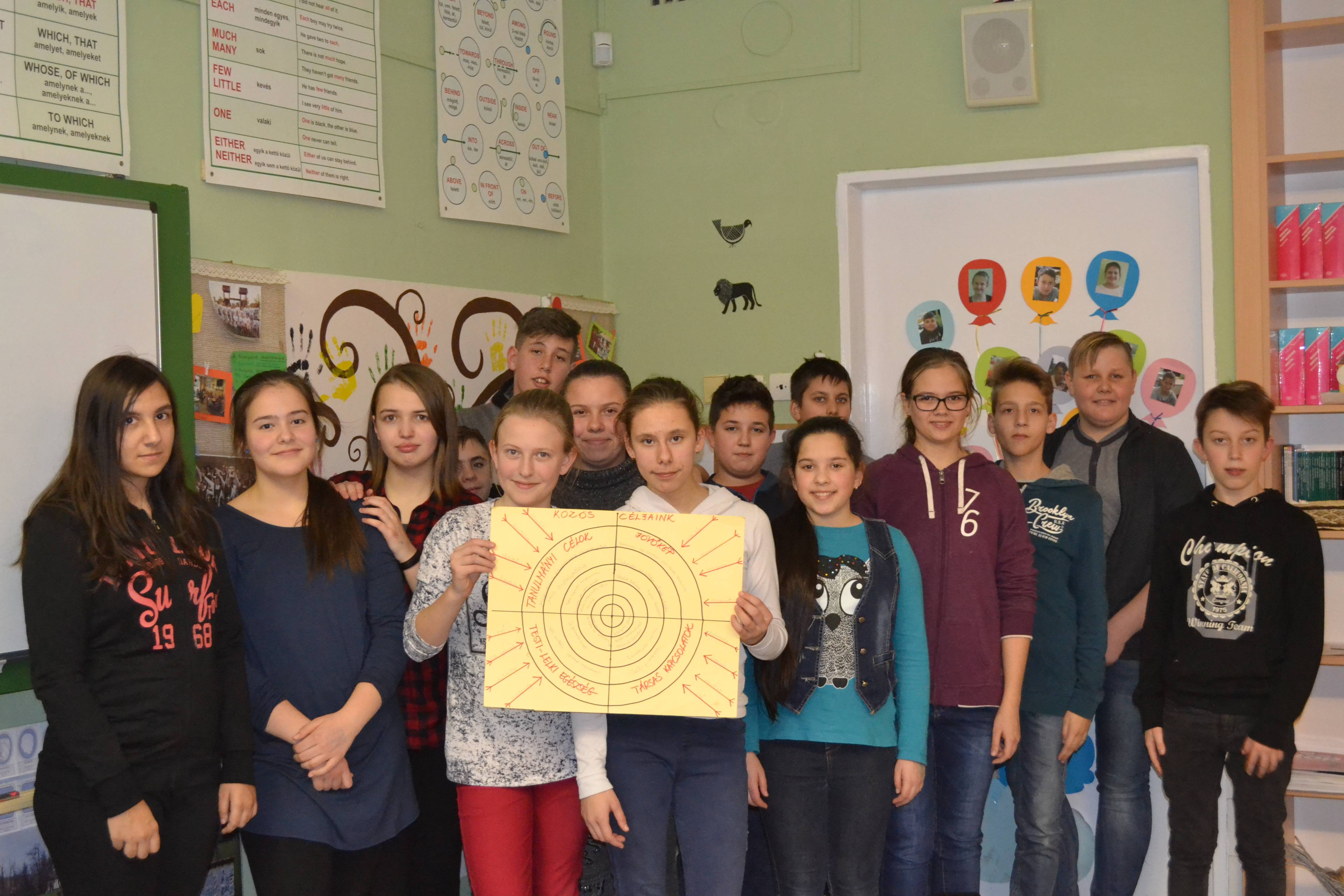 A januári feladatot úgy oldottuk meg, hogy készítettünk egy céltáblát. Ebbe négy kategóriában gyűjtöttük össze közös elérendő céljainkat: tanulmányokkal, jövőképpel, társas kapcsolatokkal és testi-lelki egészséggel kapcsolatos célok. A nyílvesszők szimbolizálják azokat a készségeket, képességeket, tulajdonságokat, melyeket fejlesztenünk kell, hogy elérjük ezeket a kitűzött célokat.