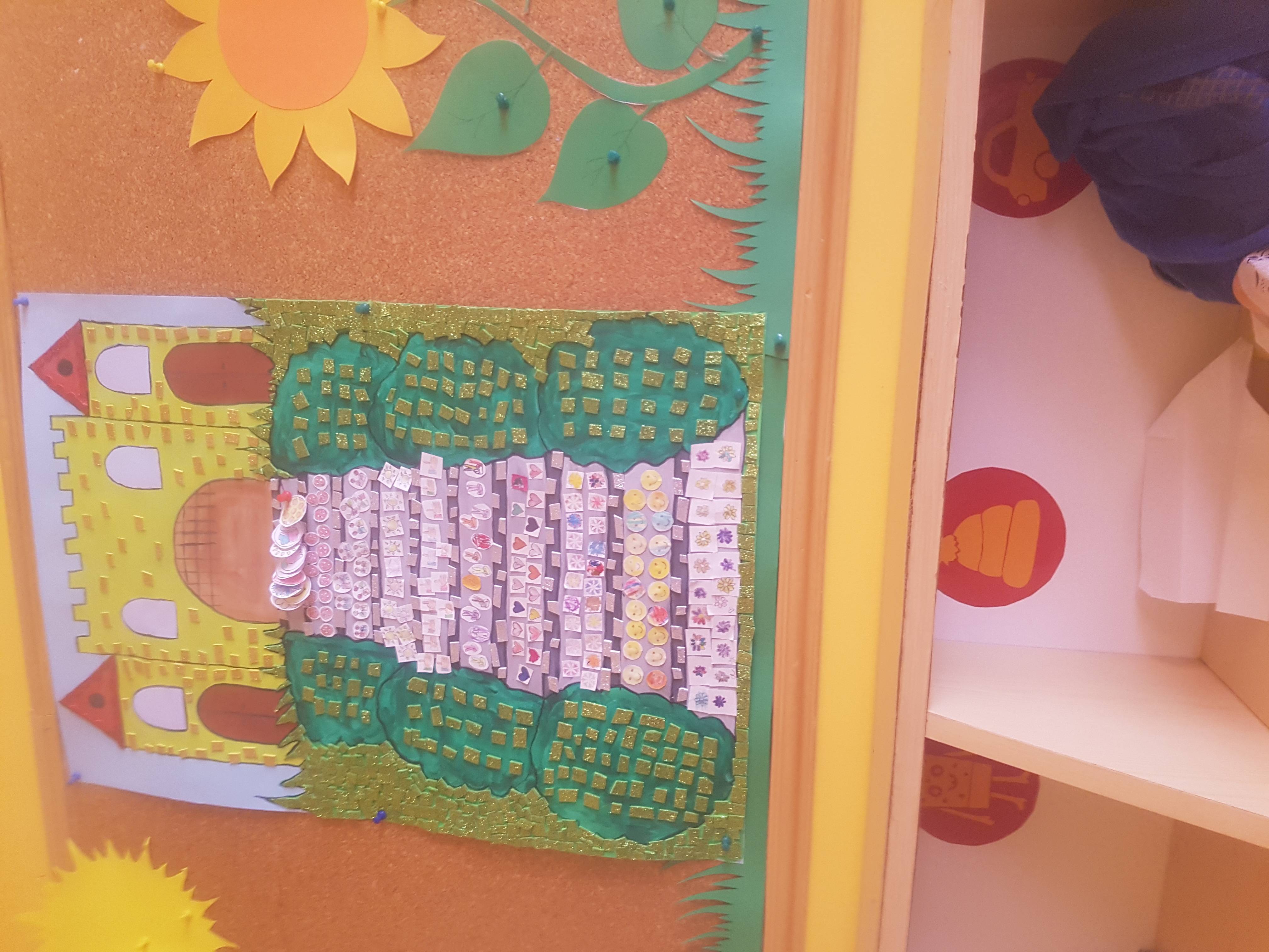 Pénteken volt egy kis időm, amit csak a csoporttal tölthettem el. Ezt kihasználva elmeséltem Bezzeg Andrea: Boldog erdő-Kerekerdő című meséjét felidézve közben a gyerekekkel az év boldogságóráit. Nagyon lelkesen meséltek a tapasztalataikról és remélik, hogy jövőre is lesz hasonló élményekben részük. A mese után közösen elkészítettük a „boldogságláncot”. Igaz, nem találtunk barna és fekete gyöngyöt a készletünkben, de a gyerekek javaslatára a barnát rózsaszínnel a feketét pedig sötétkékkel helyettesítettük. A kész láncot pedig feltettük a „Boldogságvár” utolsó lépcsőfokára.