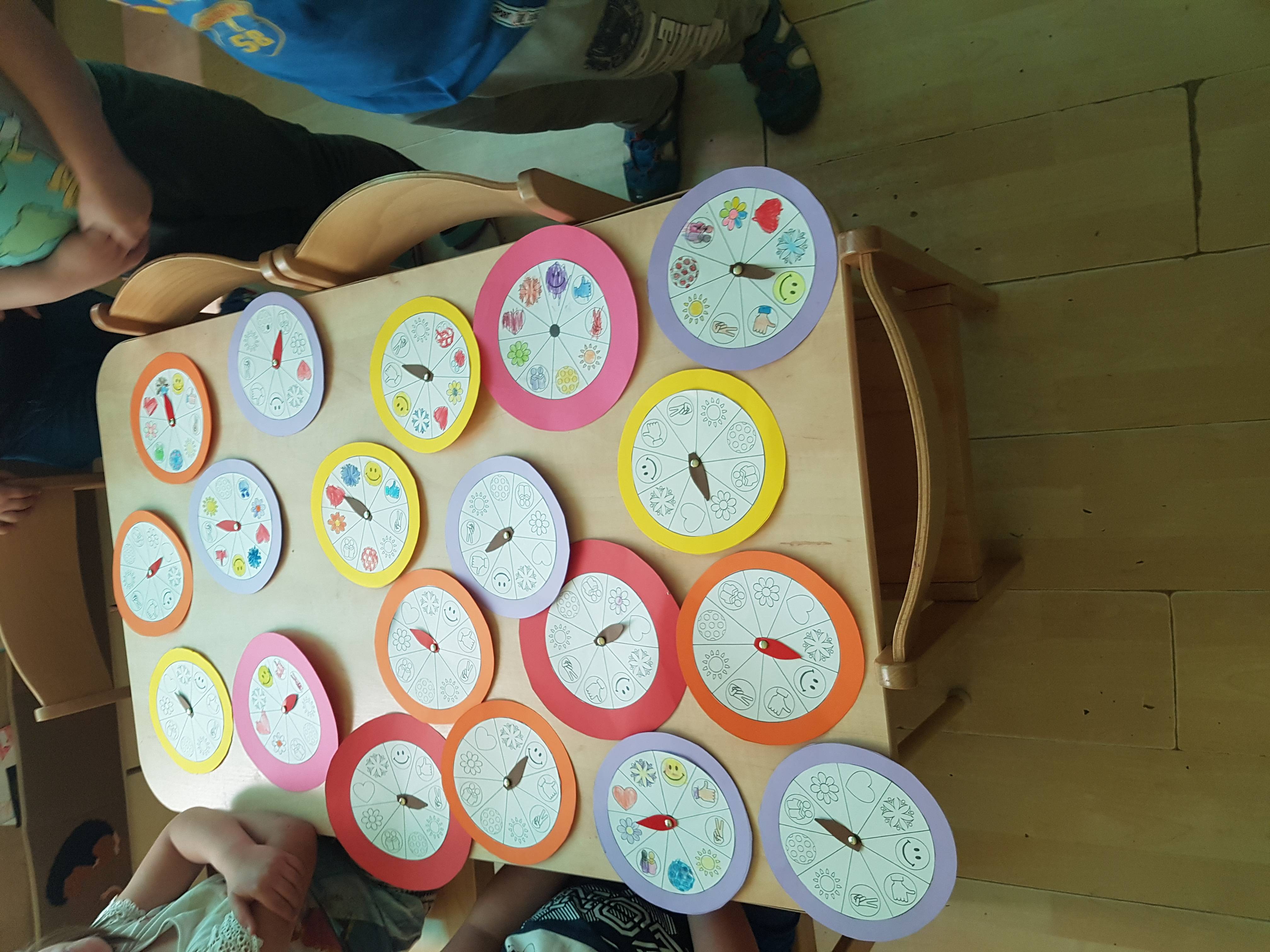 Ebben a hónapban egy kicsit rendhagyó módon tartottam meg a boldogságórát. A csoportunk tagjai nem együtt töltötték el az utolsó hónapot. Június 4-én volt a ballagásunk. Ezt követően a csoport egyik része egy hétig táborozott, másik része pedig az óvodában töltötte az idejét. Az utolsó héten pedig már sokan nem jöttek az óvodába. Ilyen körülmények között nem volt könnyű összehozni a boldogságórát, de végül mégiscsak sikerült. Még a ballagás előtt készítettem a gyerekekkel egy ún. „boldogságórát” (lásd: a képen), amit hazavihettek és otthon bármikor elő vehetnek. Jancsiszeg segítségével lehet rajta forgatni a mutatót és az adott tevékenységet (hála, optimizmus, barátság, stb.) gyakorolni azon a napon. A táborozós héten én délutános voltam, ami szintén nem kedvezett a foglalkozás megtartásának. Ezeken a napokon sokat hallgattuk Bagdi Bella lemezét, ami az óvoda többi csoportjába járó gyerekeinek is nagyon tetszett, ők is szívesen táncoltak az adott dalokra.