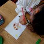 A foglalkozás másik felében a közös emlék alkotáson volt a hangsúly. Olyan őszi fát készítettünk, aminek „leveleit” a gyermekek festékbe mártott ujjlenyomatai alkottak. A kép többi részéhez pedig szintén mindenki hozzátett valamit. Valaki kis napocskát rajzolt rá, valaki virágot stb. A képet végül keretbe foglaltuk, hogy arra évekkel később is ránézve a közös emlék alkotás jusson eszünkbe.