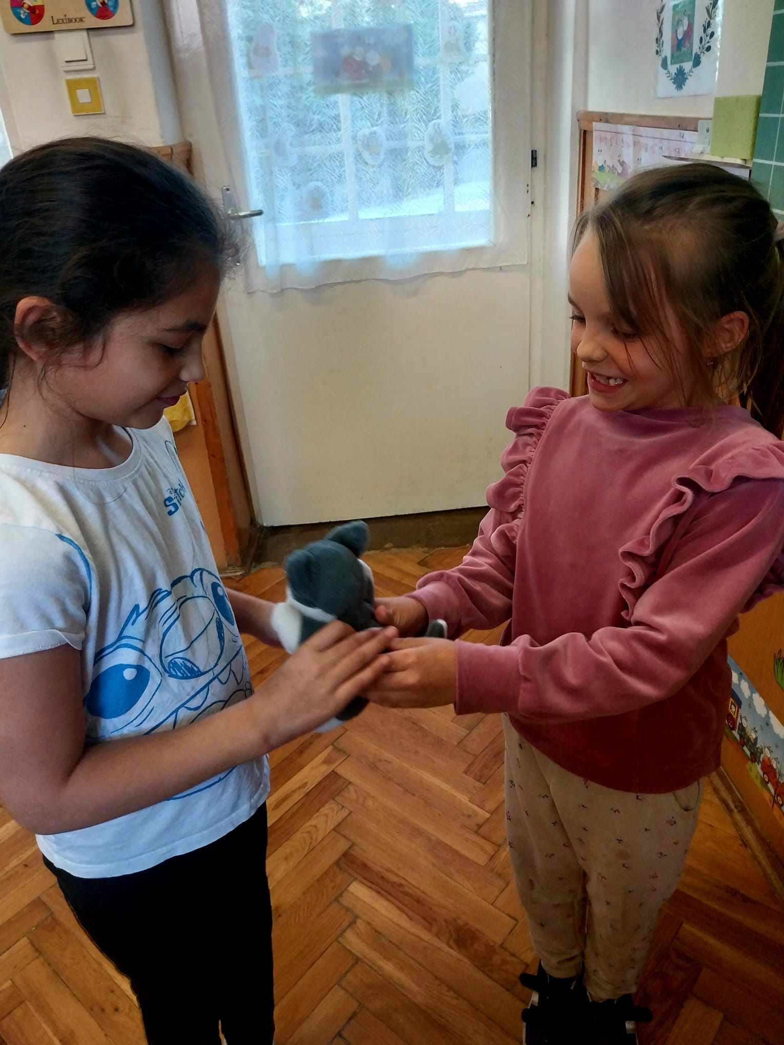 A novemberi boldogságóra során a „Társas kapcsolatok ápolása” volt a témánk. A foglalkozáson körbejártuk, miért is lényeges, hogy embertársainkkal, mikro- és makro környezetünkkel harmonikus kapcsolatot alakítsunk ki. A téma fontos elemének tartottam, hogy a gyerekek játékos formában megfogalmazzanak olyan állításokat, melyek társaik pozitív tulajdonságait emelik ki. Ennek célja a kapcsolati rendszer erősítése volt. Ehhez a tanulók kis kört alkottak, és a mellettük állóhoz fordulva mondtak dicsérő szavakat a másiknak, eszközként egy plüss kutyust adtak körbe. Ilyen mondatok hangzottak el például: