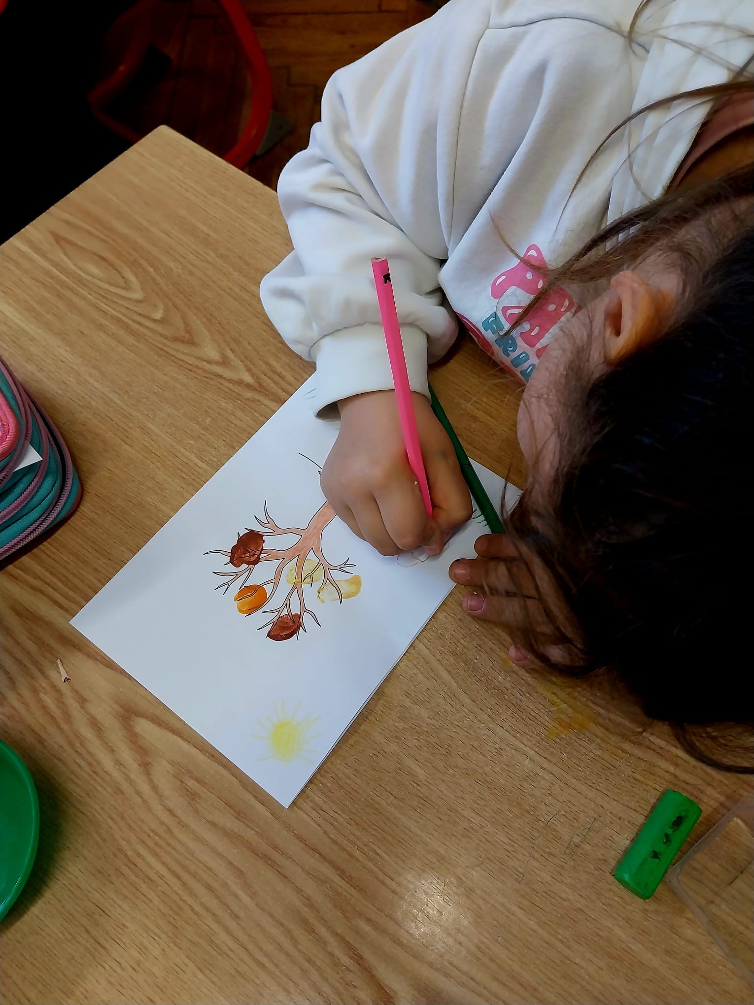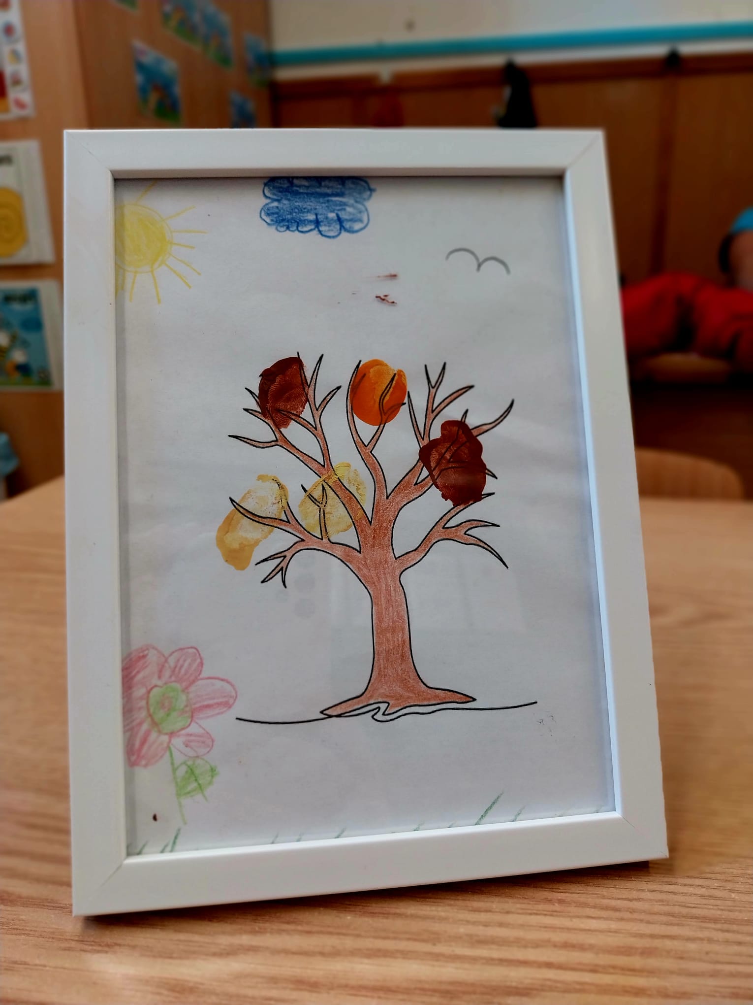 A foglalkozás másik felében a közös emlék alkotáson volt a hangsúly. Olyan őszi fát készítettünk, aminek „leveleit” a gyermekek festékbe mártott ujjlenyomatai alkottak. A kép többi részéhez pedig szintén mindenki hozzátett valamit. Valaki kis napocskát rajzolt rá, valaki virágot stb. A képet végül keretbe foglaltuk, hogy arra évekkel később is ránézve a közös emlék alkotás jusson eszünkbe.