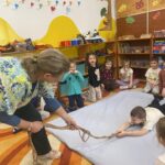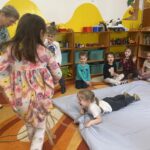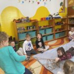Egy szituációs játék során „viharos tengerből” kellett kiúsznunk: az egyik gyermek az úszó szerepében küzdött a hullámokkal, míg egy társa kötéllel segítette őt a partra. A játék során megtapasztalhatták, hogy a nehézségekkel való megküzdés erőfeszítést igényel, de egymás támogatásával könnyebb átvészelni a kihívásokat. A gyerekek élményszerűen tapasztalhatták meg az összefogás, a kitartás és a segítségkérés fontosságát.