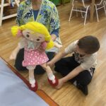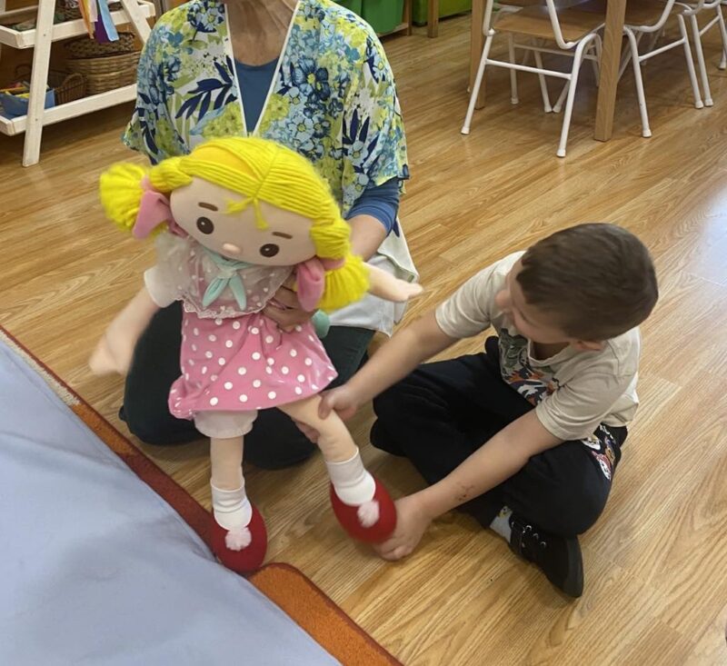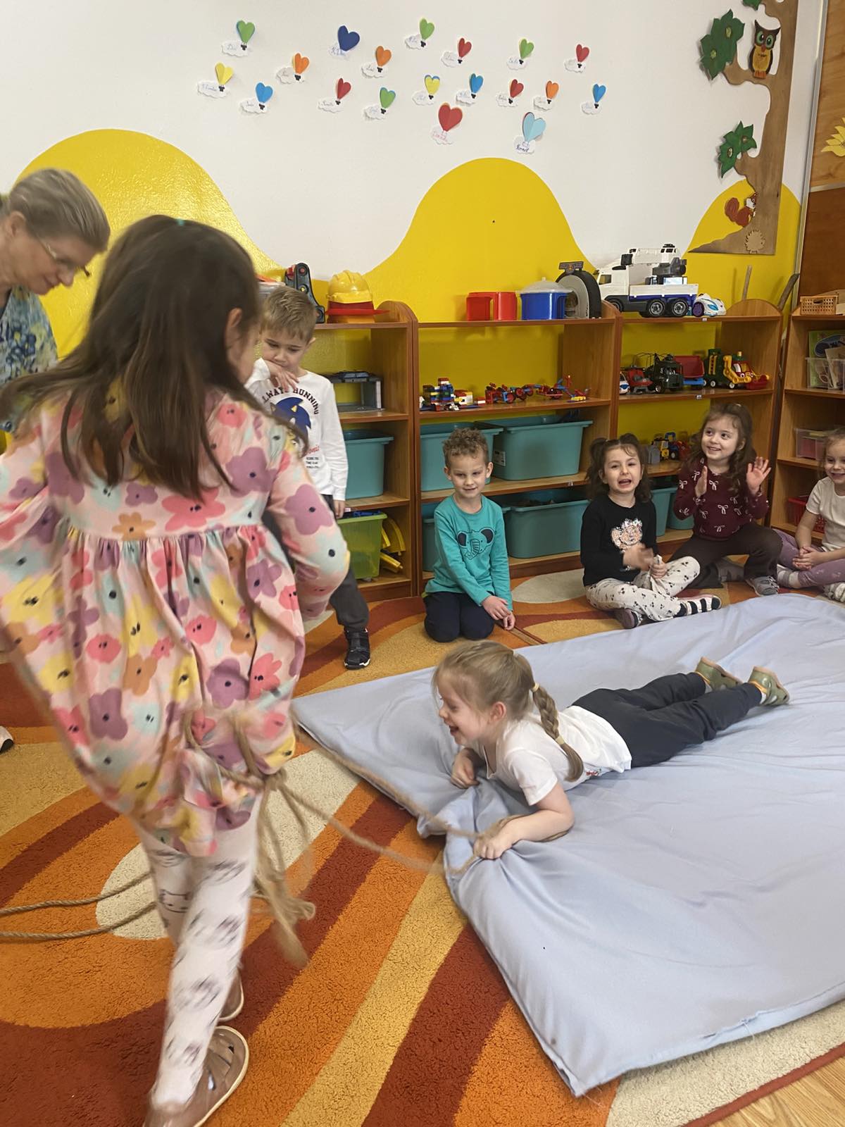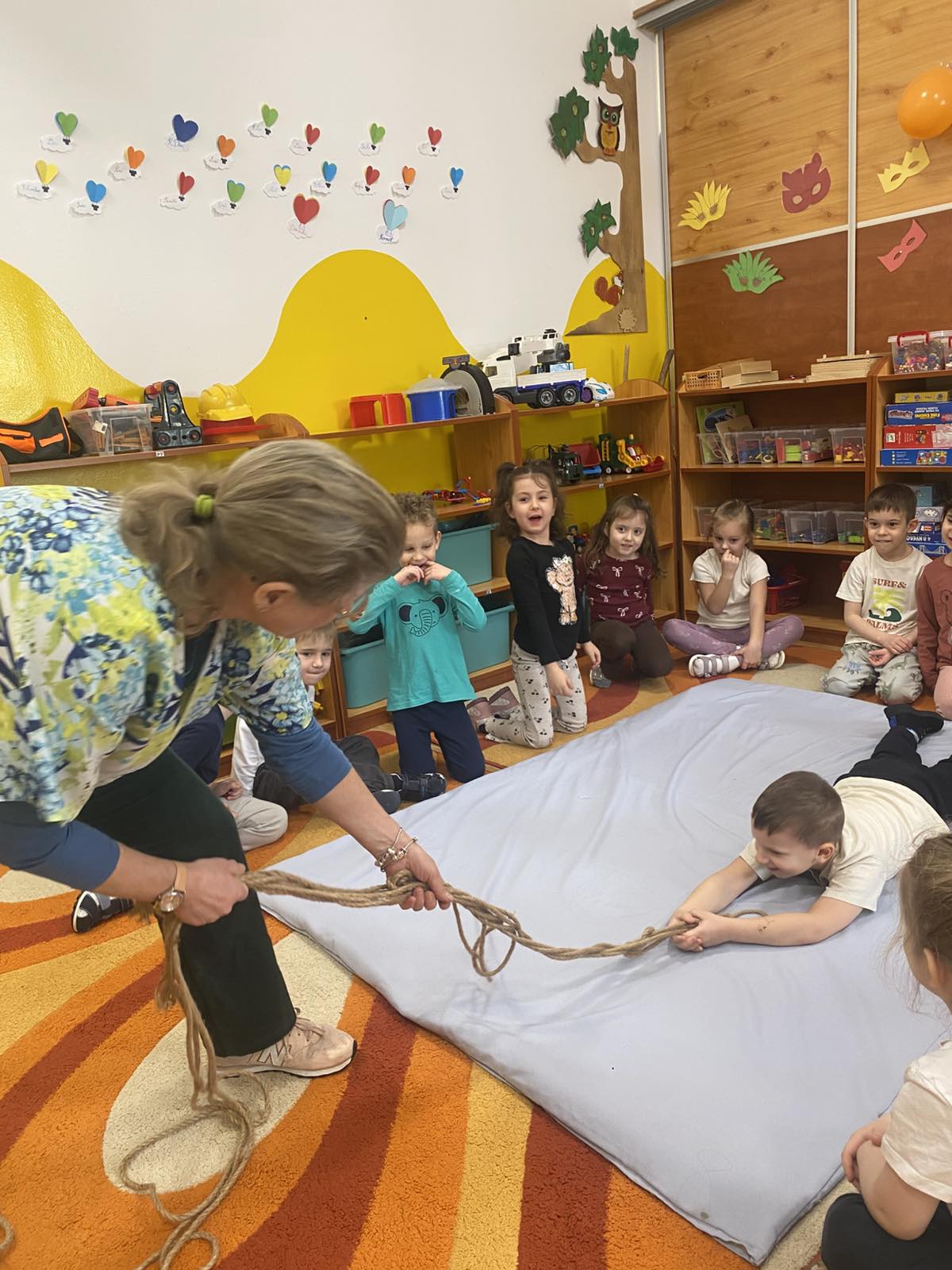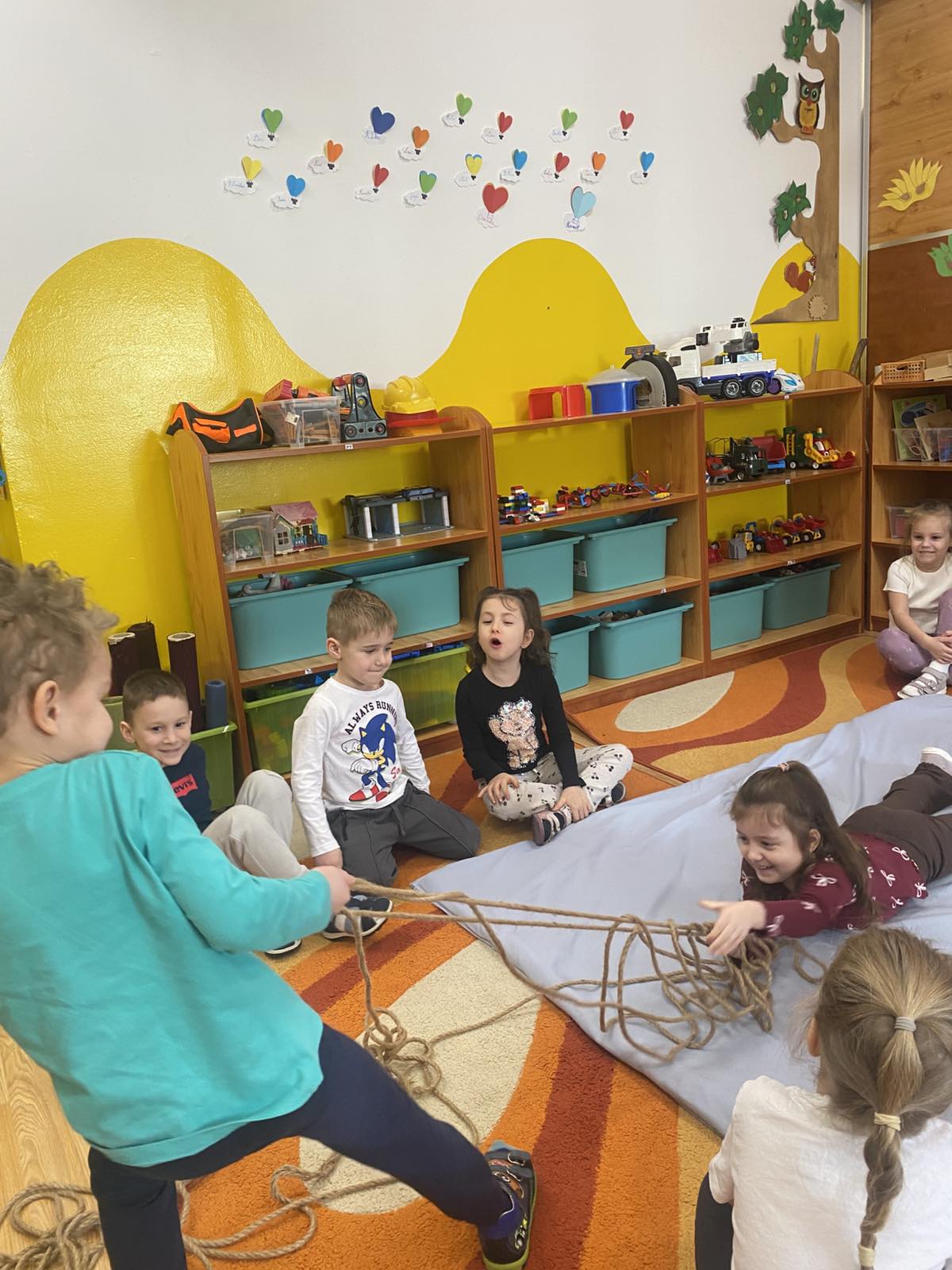 Egy szituációs játék során „viharos tengerből” kellett kiúsznunk: az egyik gyermek az úszó szerepében küzdött a hullámokkal, míg egy társa kötéllel segítette őt a partra. A játék során megtapasztalhatták, hogy a nehézségekkel való megküzdés erőfeszítést igényel, de egymás támogatásával könnyebb átvészelni a kihívásokat. A gyerekek élményszerűen tapasztalhatták meg az összefogás, a kitartás és a segítségkérés fontosságát.