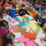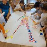 Csütörtök: A mai a torna napunk, labdával küzdöttünk, padra fel, és le, pattogtatás, hol a fiúk, hol a lányok szabadultak meg a labdáktól a „szigeten”. El is fáradtak. A reggeli után óriás papírra lerajzolták egymást, volt akit kiszíneztek, volt akit pöttyöztek szivaccsal, meg festékkel, és nem is tudtunk mindenkit kiszínezni, mert nem volt rá idő. A kisasztalnál önarcképet lehetett készíteni, mindenki magának ragasztott hajat papír csíkkal, akinek rövid haja van, az levághatta rövidre. Ezt is folytatjuk holnap, hogy mindenki kész legyen. A mese a Festéktüsszentő Hapci Benő volt, nagyon szépen figyelték, élvezték. Egy rövid játékra volt még idő, papír lappal mutattam mozgásokat, nekik utánozni kellett. Ugrás, guggolás, pörgés, fekvés, rázkódás, előre hajlás, leülés. Nagyon ügyesek voltak ma is!!