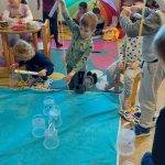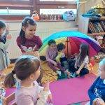 Kedd: Ma volt nálunk látogatóba Jozifek Zsófia. A reggelt egy kis szurka-piszkával kezdtük, ami azt jelenti, hogy a nyomtatott tulipánt, vagy hóvirágot rajzszőggel, hungarocell lapon kellett kiszurkálni, aztán színezni. A reggeli után megépítettük a „nyugalom szigetét”, amihez szivárvány színű esernyőt, pokrócokat, szivacsot, jógaszőnyeget, párnákat raktunk le a szőnyegre. Majd csatlakozott hozzá a kék pokróc, a mi a tó volt, és halakat lehetett horgászni, újrahasznosított műanyag vödröcskéből, papírhengerből. A halacskák arca különböző érzelmeket tükröző arcot viseltek, így mikor kifogták őket, még azt is mondták: az én halam szomorú, vidám, dühös, mérges, álmos. A halakat el is készítették a konyhába, úgyhogy a szigeten ettek, ittak finomakat. Amikor elpakoltuk a játékot, akkor dórival beszéltünk egy kicsit, azuán a tegnapi követős játékkal próbáltunk kört alakítani, de sajnos ma még többet kellett segítenem a kör alakításban, mint tegnap. Mikor meg volt a kör, a légzésünkre figyeltünk, és megpróbáltunk egyszerre lélegezni, mert annak közösség erősítő ereje van, szinkronban maradtunk. A légzés után tulipánokká nőttek a magocskából, mert így meg eljátszhatták azt az érzést, ami folyton érdekli a kicsiket, a naggyá válást. A játék után Balla Piroska Rossz kedvet elűző mondókáját mondtuk el. A mese ma is Csukás István volt, A Nagytüdejű Levegőfújó. Tetszett nekik a mese, végig figyeltek. A Kicsi Gesztenye klub Buborék dalára táncoltunk, és meglepiből lufikat varázsoltam elő a szekrényből. A másik meglepi a banánturmix volt, és még mindig van, udvar helyett a játszótérre mentünk.