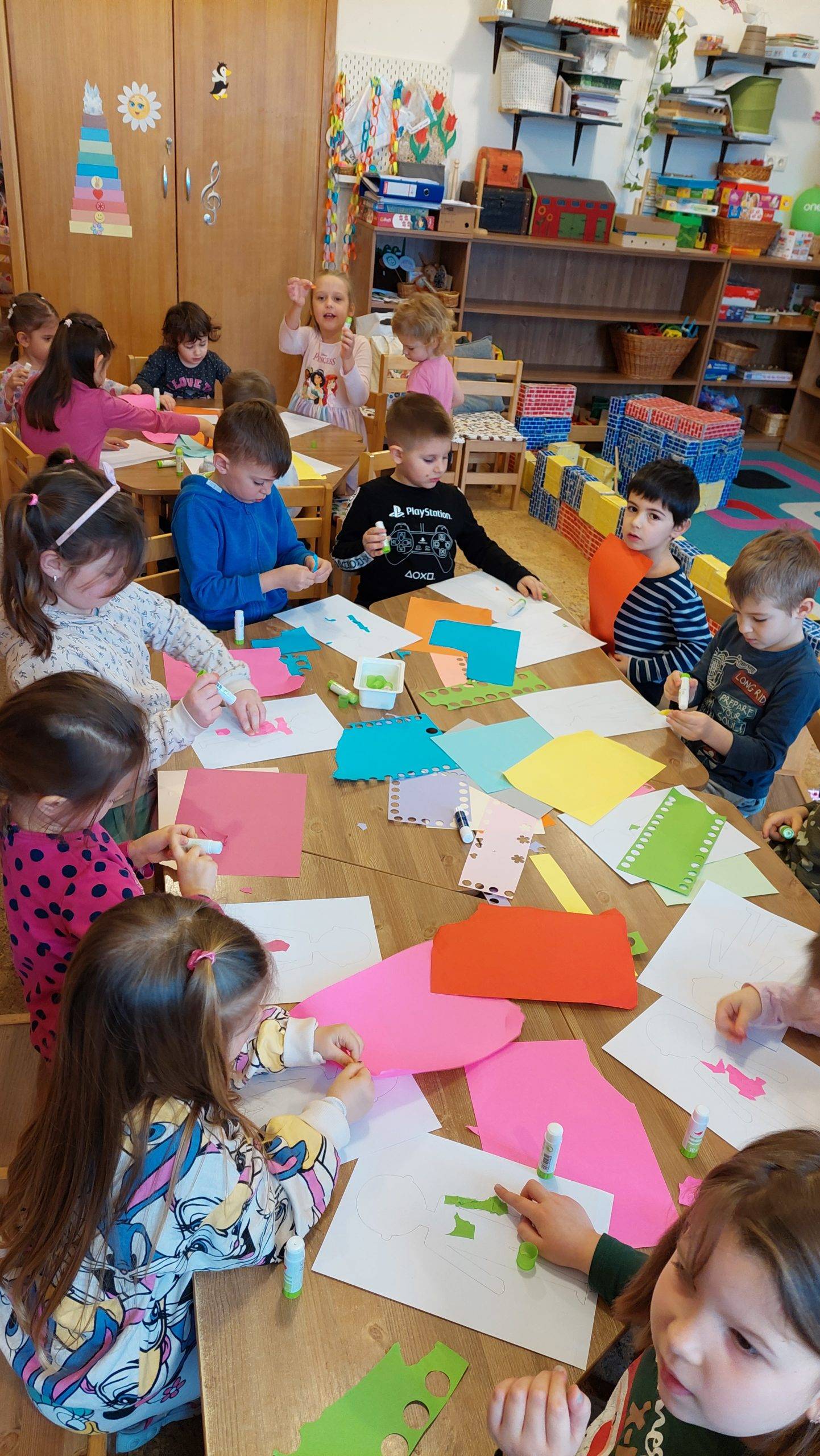 Csütörtök: A mai a torna napunk, labdával küzdöttünk, padra fel, és le, pattogtatás, hol a fiúk, hol a lányok szabadultak meg a labdáktól a „szigeten”. El is fáradtak. A reggeli után óriás papírra lerajzolták egymást, volt akit kiszíneztek, volt akit pöttyöztek szivaccsal, meg festékkel, és nem is tudtunk mindenkit kiszínezni, mert nem volt rá idő. A kisasztalnál önarcképet lehetett készíteni, mindenki magának ragasztott hajat papír csíkkal, akinek rövid haja van, az levághatta rövidre. Ezt is folytatjuk holnap, hogy mindenki kész legyen. A mese a Festéktüsszentő Hapci Benő volt, nagyon szépen figyelték, élvezték. Egy rövid játékra volt még idő, papír lappal mutattam mozgásokat, nekik utánozni kellett. Ugrás, guggolás, pörgés, fekvés, rázkódás, előre hajlás, leülés. Nagyon ügyesek voltak ma is!!