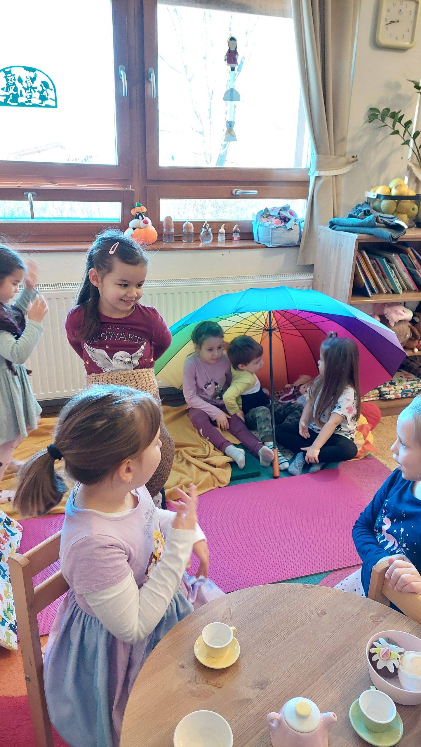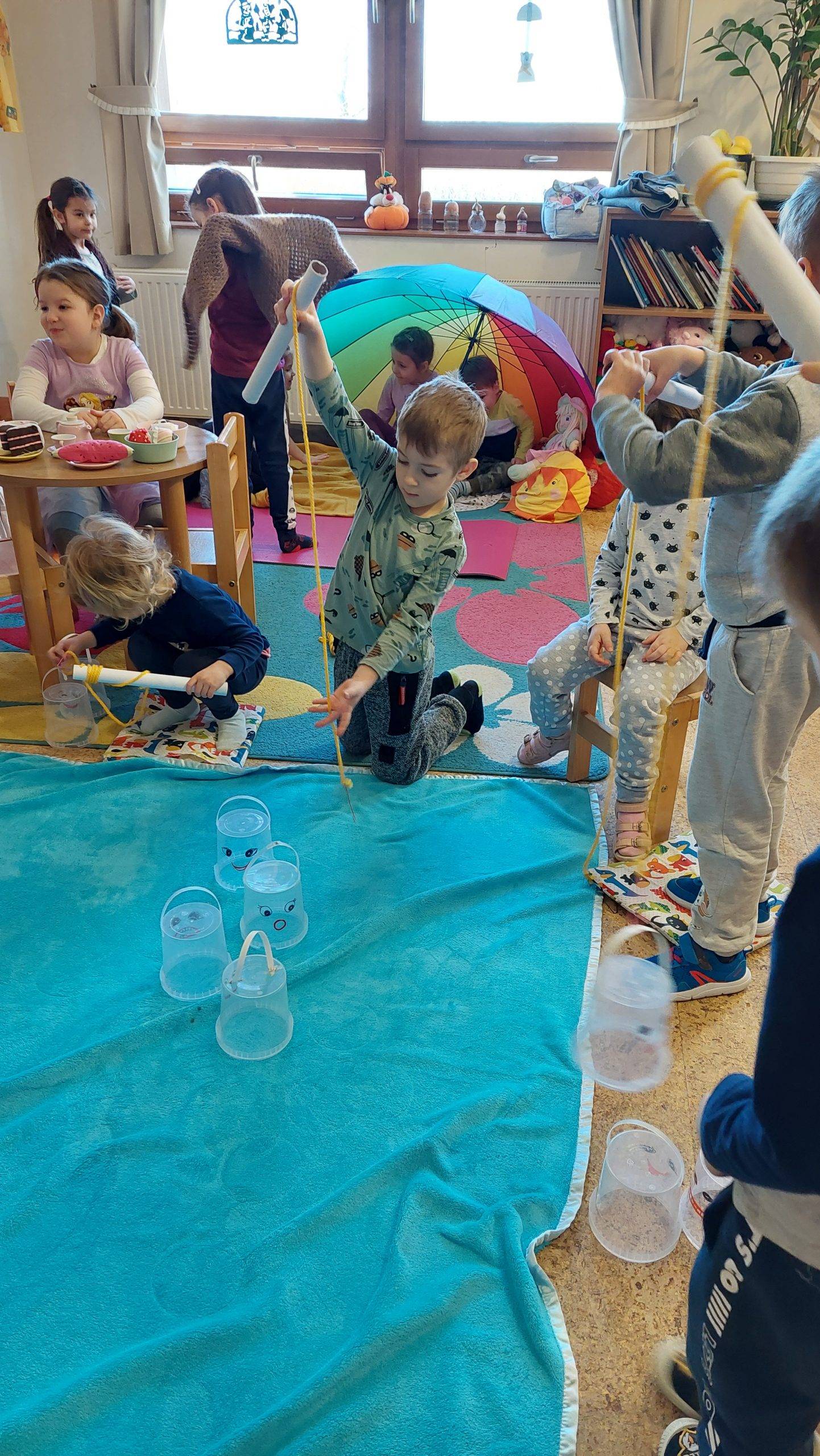Kedd: Ma volt nálunk látogatóba Jozifek Zsófia. A reggelt egy kis szurka-piszkával kezdtük, ami azt jelenti, hogy a nyomtatott tulipánt, vagy hóvirágot rajzszőggel, hungarocell lapon kellett kiszurkálni, aztán színezni. A reggeli után megépítettük a „nyugalom szigetét”, amihez szivárvány színű esernyőt, pokrócokat, szivacsot, jógaszőnyeget, párnákat raktunk le a szőnyegre. Majd csatlakozott hozzá a kék pokróc, a mi a tó volt, és halakat lehetett horgászni, újrahasznosított műanyag vödröcskéből, papírhengerből. A halacskák arca különböző érzelmeket tükröző arcot viseltek, így mikor kifogták őket, még azt is mondták: az én halam szomorú, vidám, dühös, mérges, álmos. A halakat el is készítették a konyhába, úgyhogy a szigeten ettek, ittak finomakat. Amikor elpakoltuk a játékot, akkor dórival beszéltünk egy kicsit, azuán a tegnapi követős játékkal próbáltunk kört alakítani, de sajnos ma még többet kellett segítenem a kör alakításban, mint tegnap. Mikor meg volt a kör, a légzésünkre figyeltünk, és megpróbáltunk egyszerre lélegezni, mert annak közösség erősítő ereje van, szinkronban maradtunk. A légzés után tulipánokká nőttek a magocskából, mert így meg eljátszhatták azt az érzést, ami folyton érdekli a kicsiket, a naggyá válást. A játék után Balla Piroska Rossz kedvet elűző mondókáját mondtuk el. A mese ma is Csukás István volt, A Nagytüdejű Levegőfújó. Tetszett nekik a mese, végig figyeltek. A Kicsi Gesztenye klub Buborék dalára táncoltunk, és meglepiből lufikat varázsoltam elő a szekrényből. A másik meglepi a banánturmix volt, és még mindig van, udvar helyett a játszótérre mentünk.
