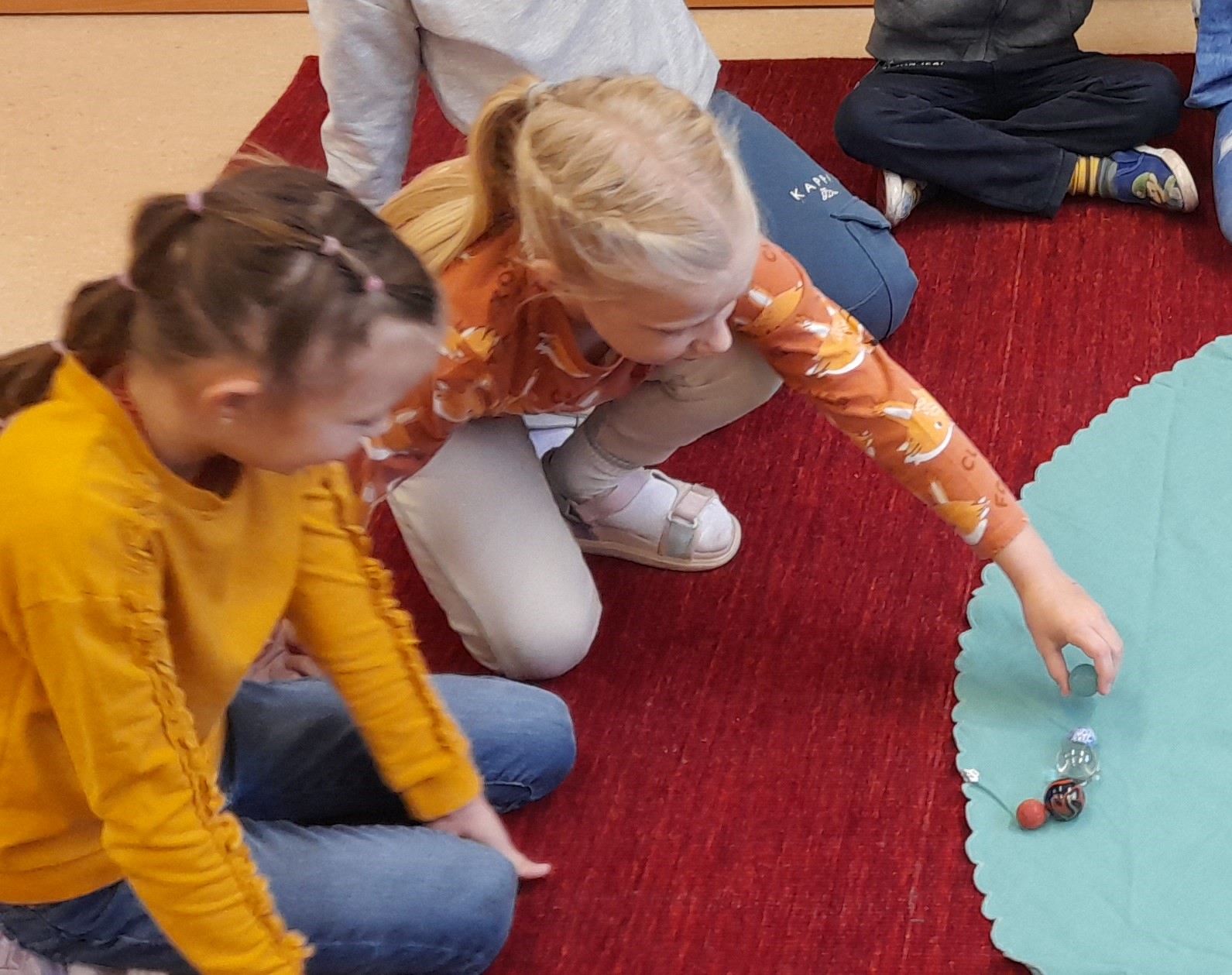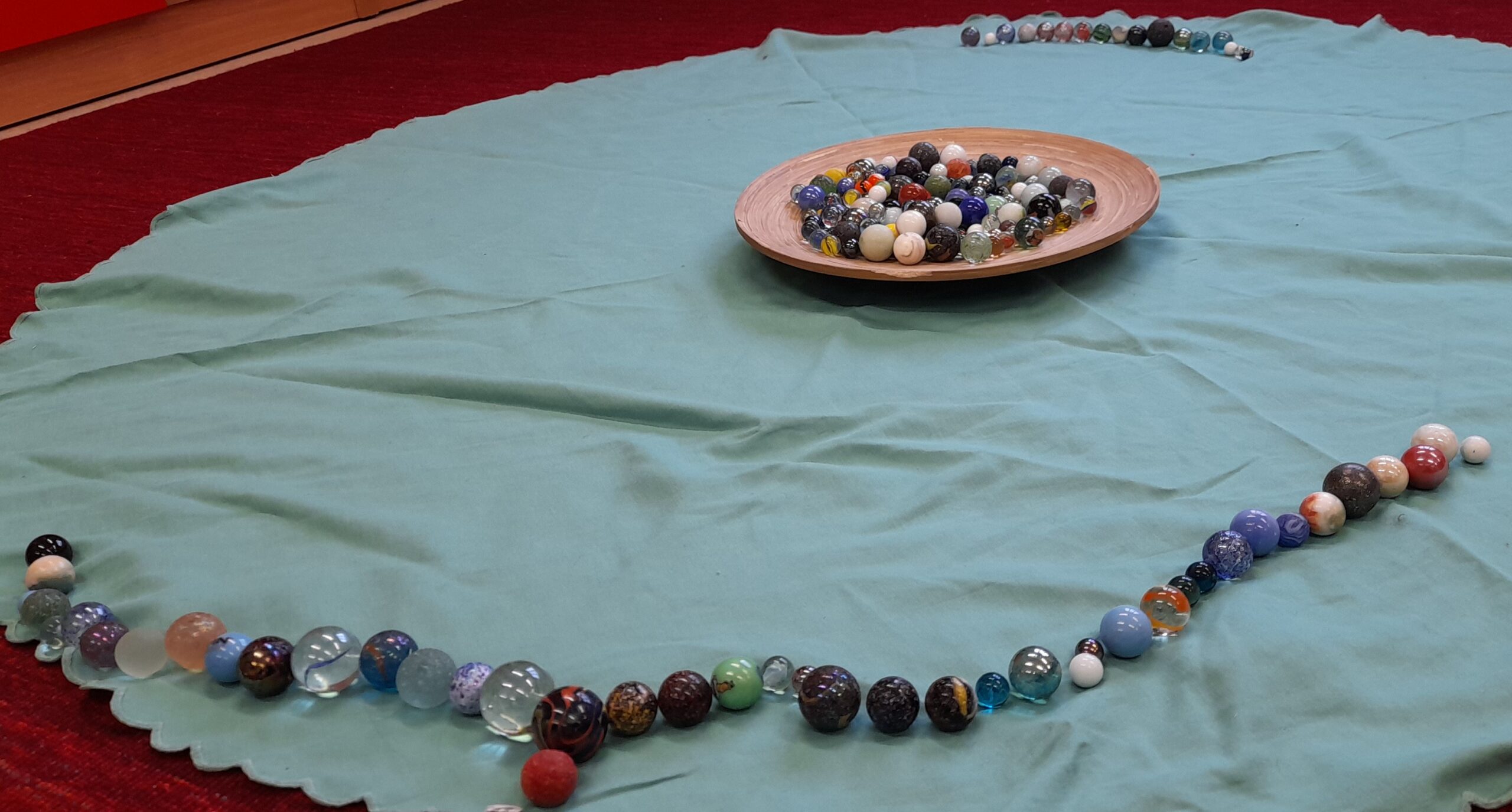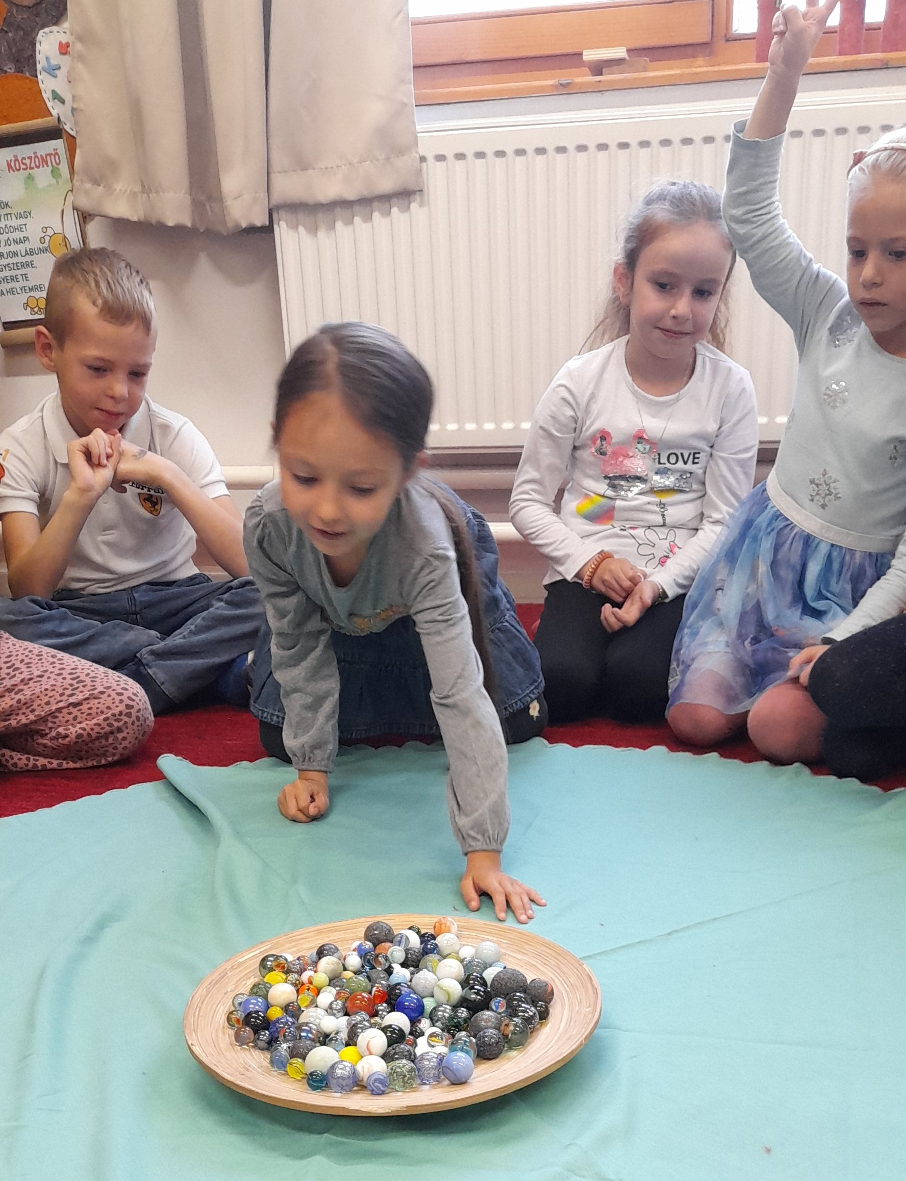 Vidámfalva lakóinak javaslatára mi is kipróbáltuk a varázsszemüveget. Nem csalás, nem ámítás, hiszen a segítségével ténylegesen megláttuk magunkban és egymásban is a jót, az értékeset. Ezt a csoportban hangosan is megfogalmaztuk egymásnak. Mindeküzben a megosztott belső kincsekből egy varázslatos üveggolyófüzért készítettünk, amelynek látványa mosolyt csalt az arcunkra, örömöt a szívünkbe.