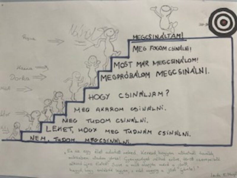 Beszélgettünk arról, mi a különbség a vágyak és a konkrét célok között. Az óra során egyéni feladatként minden tanuló megfogalmazott egy számára fontos, reális célt, valamint átgondolta az ahhoz vezető lépéseket és az esetleges akadályokat. A jelenlegi céltudatosságunkat tekintve készítettünk egy célunkig vezető lépcsőfokos szemléltetőt, megpróbálva elhelyezni magunkat rajta. Többen megosztották gondolataikat az osztállyal, ami erősítette az egymás iránti figyelmet.