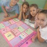 A 2020-2021. tanévben is nagy lelkesedéssel kezdtük meg a boldogságórás témakörök feldolgozását, ami idén heti egy foglalkozás megtartásával, szakköri keretek között valósul majd meg. A szeptember a hála hónapja, az általános előkészítő óra után rögtön ezzel a témával kezdtünk foglalkozni. Kedvcsinálónak Bagdi Bella Szép nap, ölelj most át… kezdetű dalát hallgattuk meg, majd légzőgyakorlatokkal (energiacsillag, energiapaplan), játékos mondókák ismétlésével, mozgásos, figyelemfejlesztő játékokkal hangolódtunk egymásra, a témára. A zenehallgatás alatt mindenki lerajzolhatta egy színes hátterű lapra, hogy mi jellemző rá a leginkább, mit szeret csinálni a legjobban, miért hálás. Ezeket a lapocskákat egymás mellé ragasztottuk, ez lett a mi „hálapárnánk”.