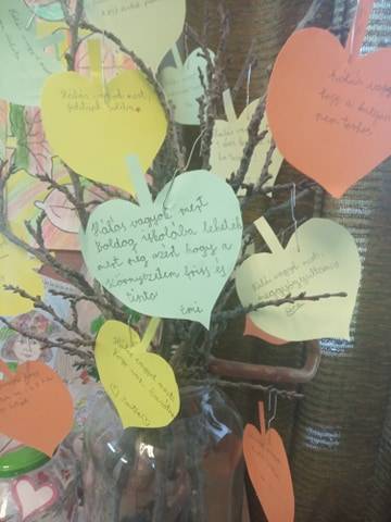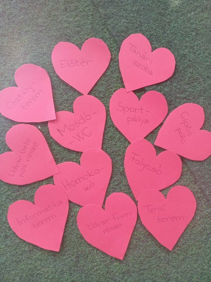 A csodakantár (Mf 9-10.o.) című izgalmas történetet szájtátva hallgatták végig a gyerekek. Közösen értelmeztük a cselekményt, megbeszéltük, hogy kik a szereplők és ki, kinek lehet hálás a mesében. Ezt követően sétára indultunk az iskola épületében, majd körülötte is az udvaron. Előtte bizonyos területekre szívecskéket helyeztem, ezeknek a felkutatása volt a fő feladat. Amikor megtaláltunk egy-egy szívecskét, elmondtuk, hogy miért lehetünk hálásak az iskola ezen részen, mi az, amit az adott hely ad, adhat a számunkra. Azt is megbeszéltük, hogyan védhetjük, óvhatjuk iskolánk helyiségeit, hogy még sokáig élvezhessük az általuk biztosított örömöket. (Helyszínek, ahova a szívek kerültek: mosdó, tanári szoba, osztályterem, folyosó, előtér, tornaszoba, informatika terem, sportpálya, füves és betonos udvarrészek, homokozó.)