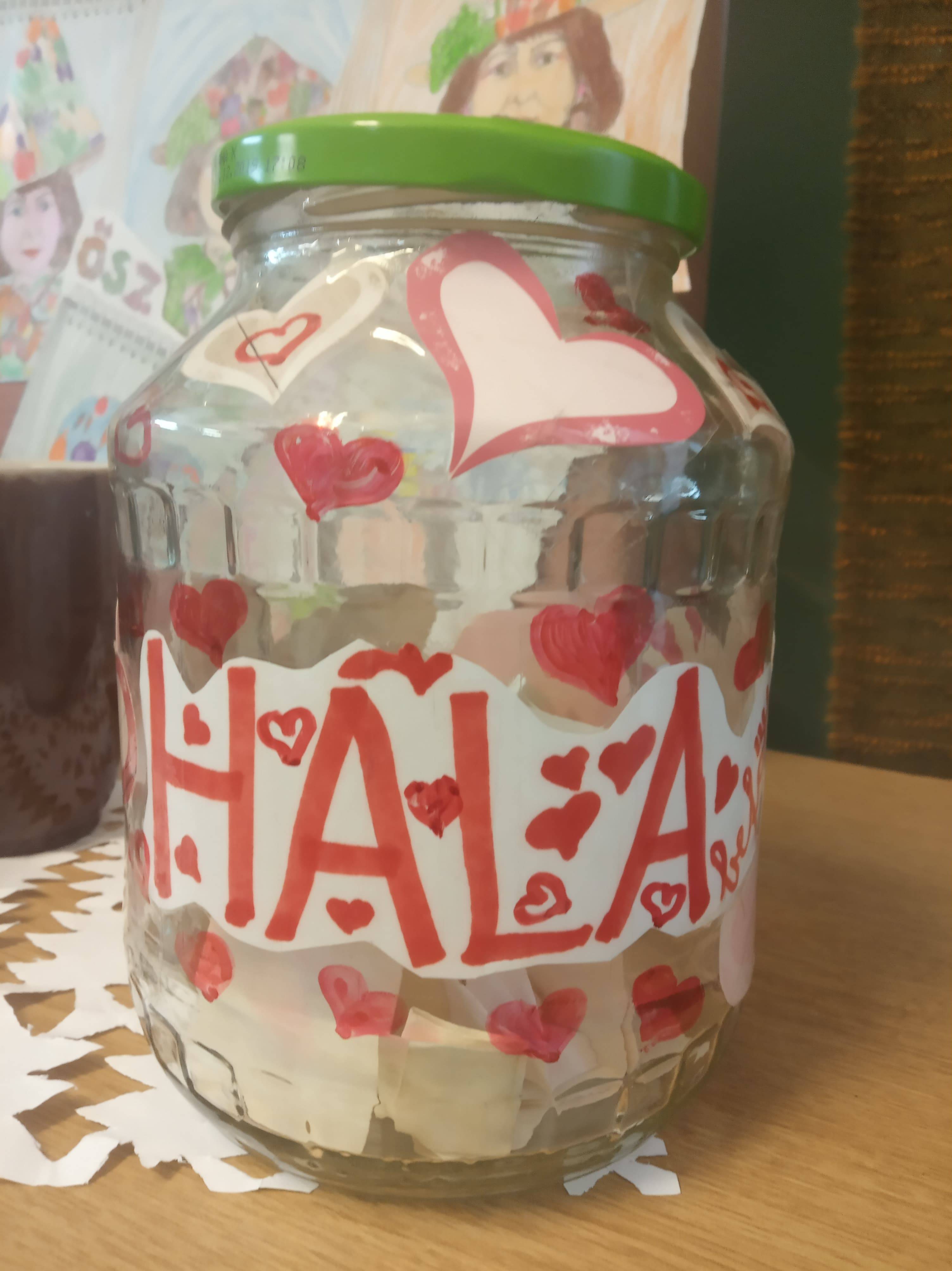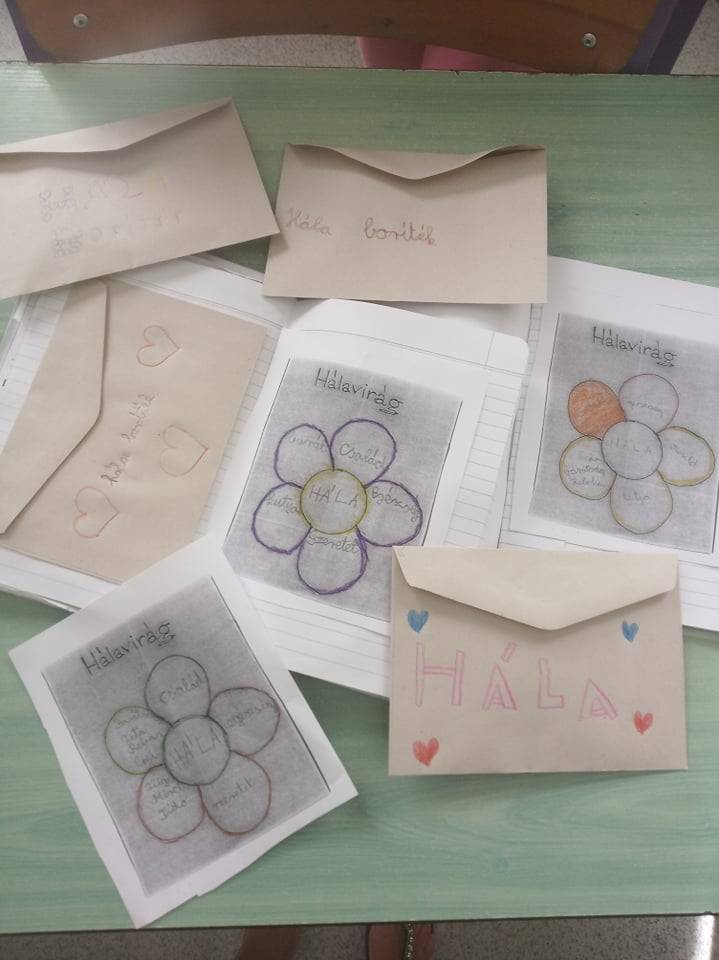 Hatalmas élményt jelentett a gyerekek számára a tavalyi „hálabefőttünk” felbontása, a benne lévő feliratok közös elolvasása (Ezt a tavalyi tanévben a járványügyi helyzet nem engedte megvalósulni.). Megállapítottuk, hogy nagyon pici dolgok elegendőek ahhoz, hogy hálásak lehessünk valamiért, valakinek és ez milyen jó érzés. Ezután új cetlikre, új hála-feliratokat írtunk, és elkezdtük idén is feltölteni a kiüresedett hálaüveget. „Hálaborítékot” is készítettünk, amit mindenki a füzetébe ragasztott, hogy otthon is legyen helye a hála-feliratoknak.