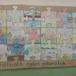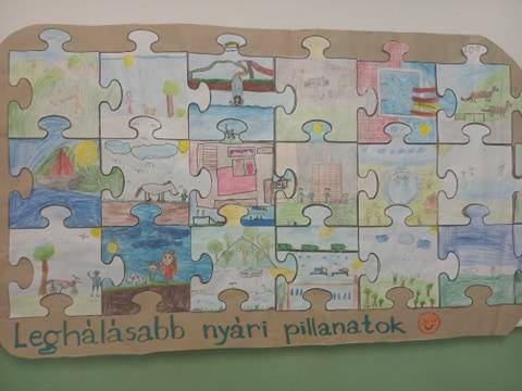 A hónap feladatának a „Leghálásabb nyári pillanatok” címűt választottuk. Ezt az első rajzóráinkon valósítottuk meg, érdekessége pedig az, hogy puzzle sablonra alkották meg a gyerekek, amiket összeraktunk, majd felragasztottunk egy nagy csomagolópapírra, hogy a faliújságunkat díszítse. Az összeillesztett puzzle darabkák az összetartást, az egymáshoz tartozást szimbolizálják, és egyben azt az örömöt, hogy ismét együtt lehetünk az iskolában, közösen alkothatunk, gyarapíthatjuk tudásunkat, szaporíthatjuk élményeinket. Hálásak vagyunk, hogy az élet megint a „majdnem” megszokott rendben zajlik körülöttünk, bennünk!