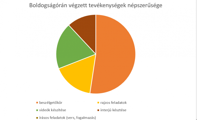 Felmérést végeztünk, amelyben a gyerekek megnevezhették legkedveltebb tevékenységeiket, amelyeket a boldogságórák során végeztek. Egyértelműen a rendszeresen alkalmazott beszélgetőkör emelkedik ki a többi tevékenység közül.