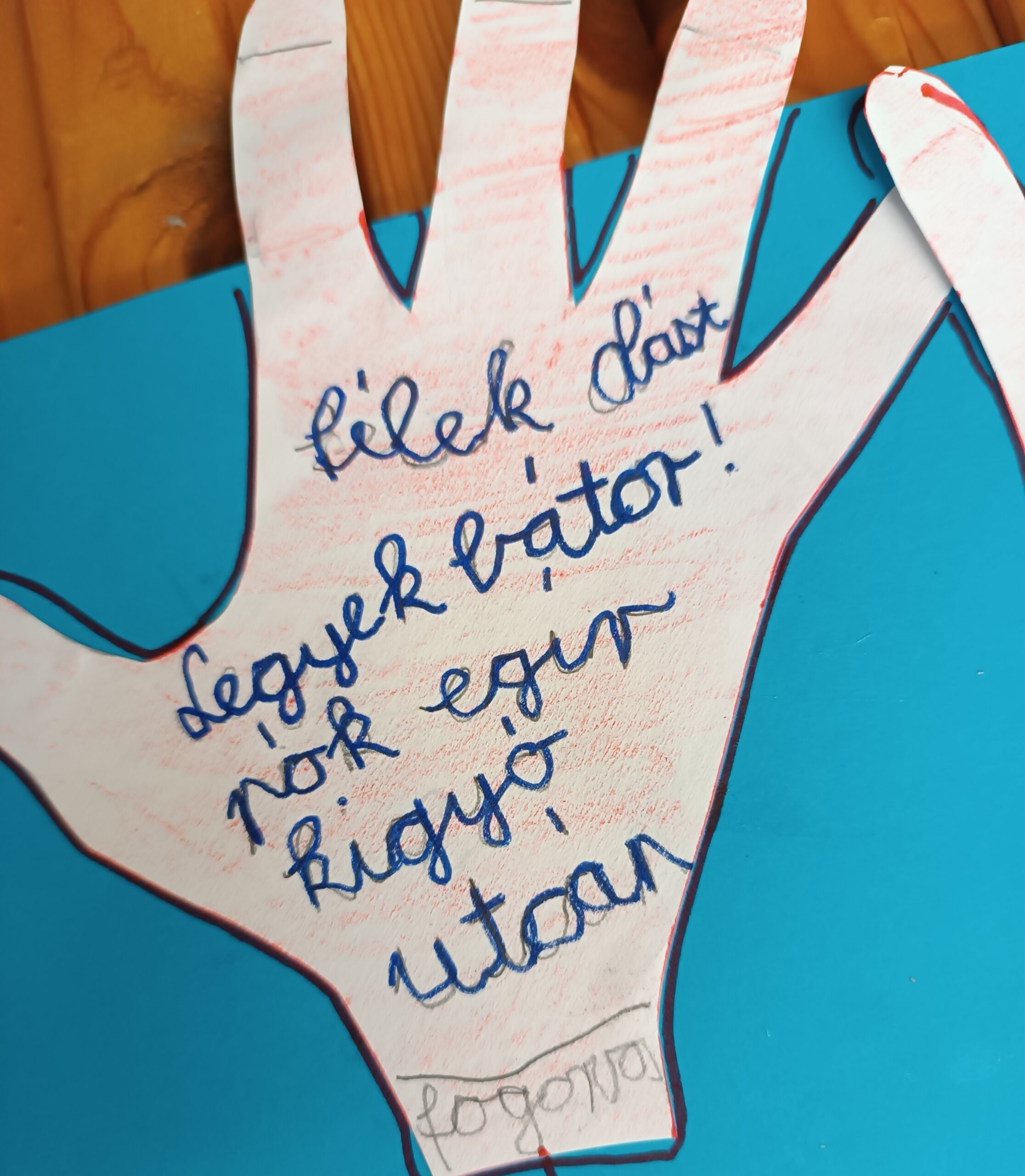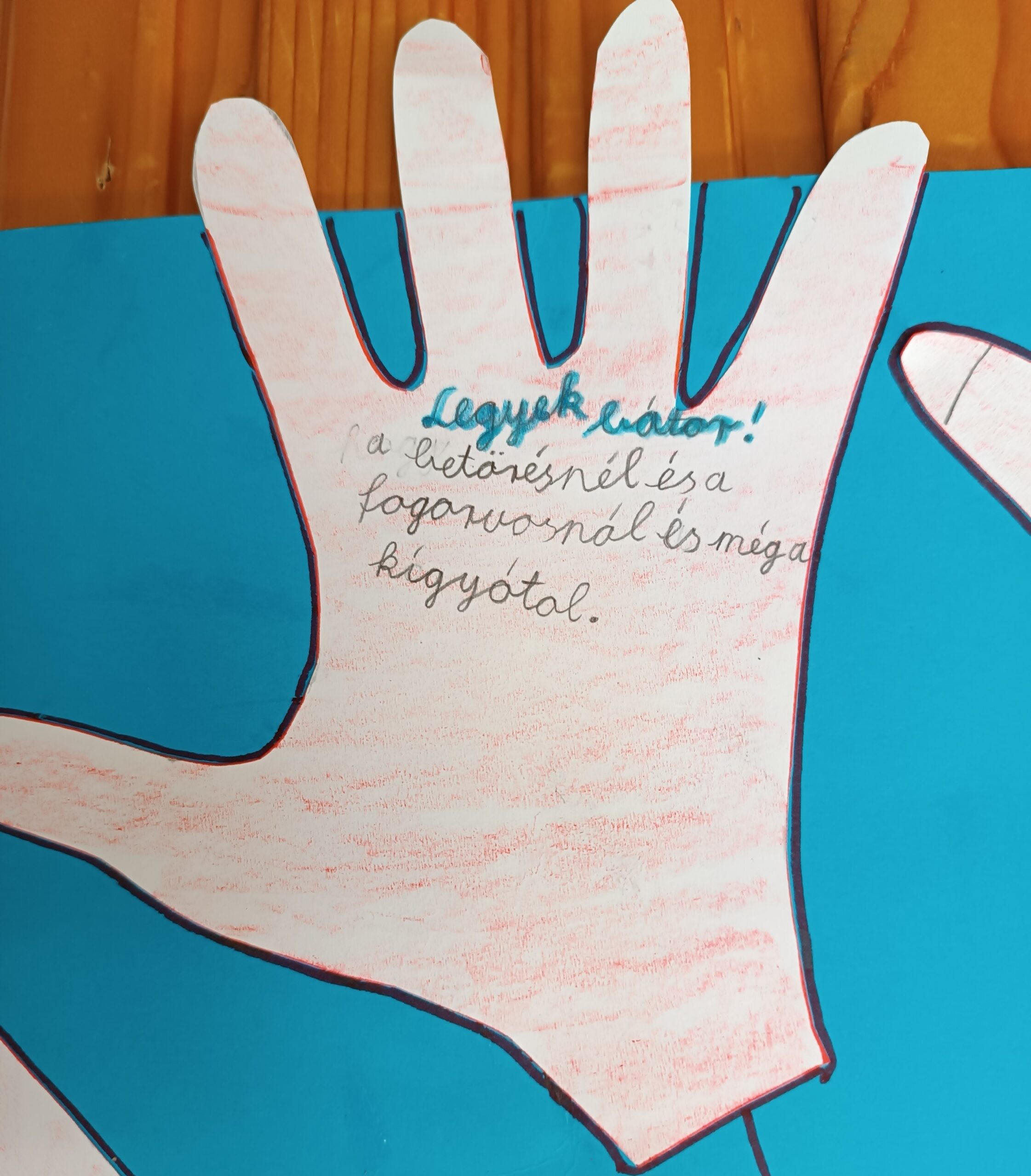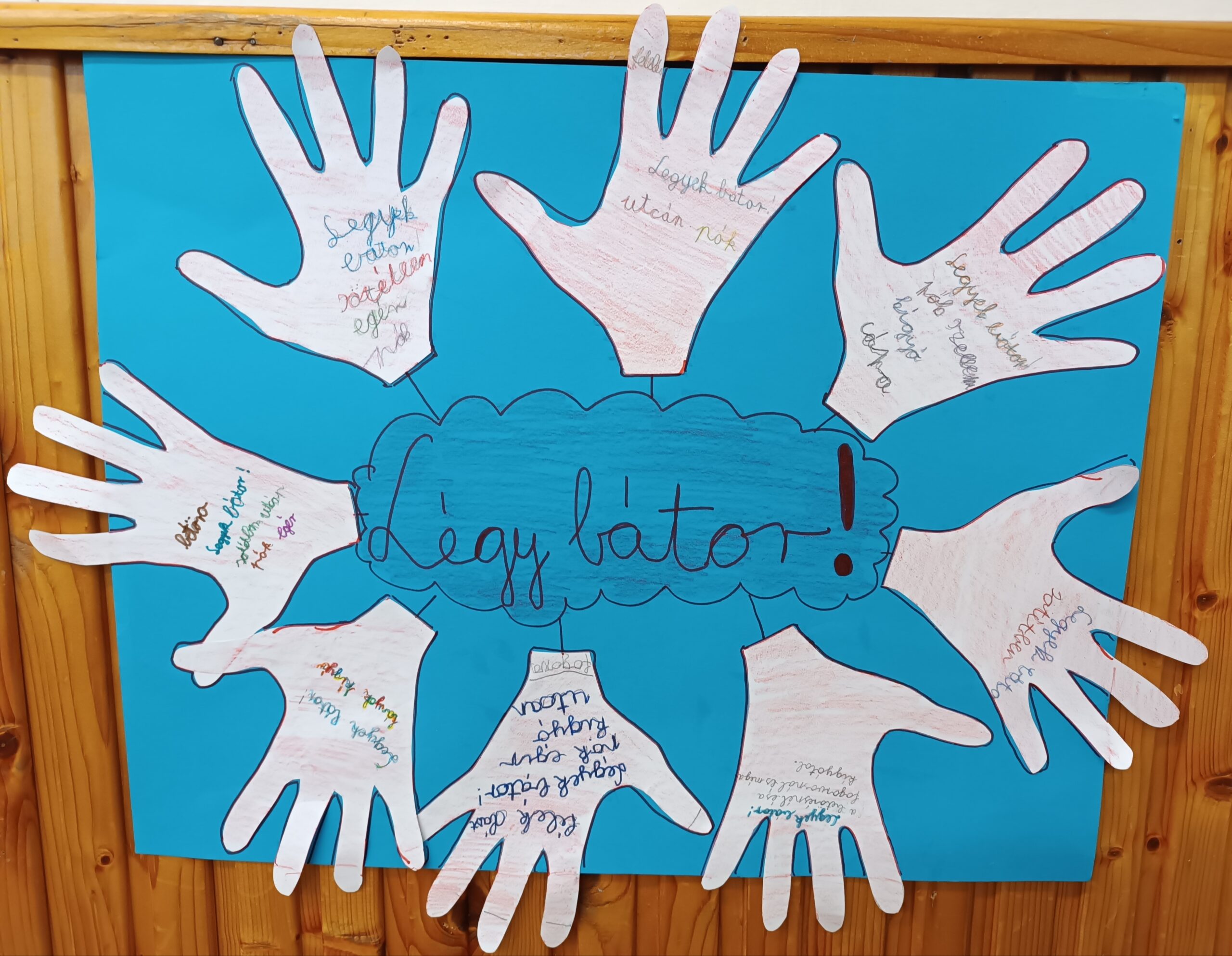 A gyerekek rajzaiból plakátot készítettünk és kihelyeztük a tanterem falára. Megbeszéltük, ha valakinek bátorításra lenne szüksége, akkor ránézhet a plakátra vagy ha tudjuk, hogy valaki valamitől fél, akkor tenyerünkkel bátoríthatjuk, biztathatjuk őt.