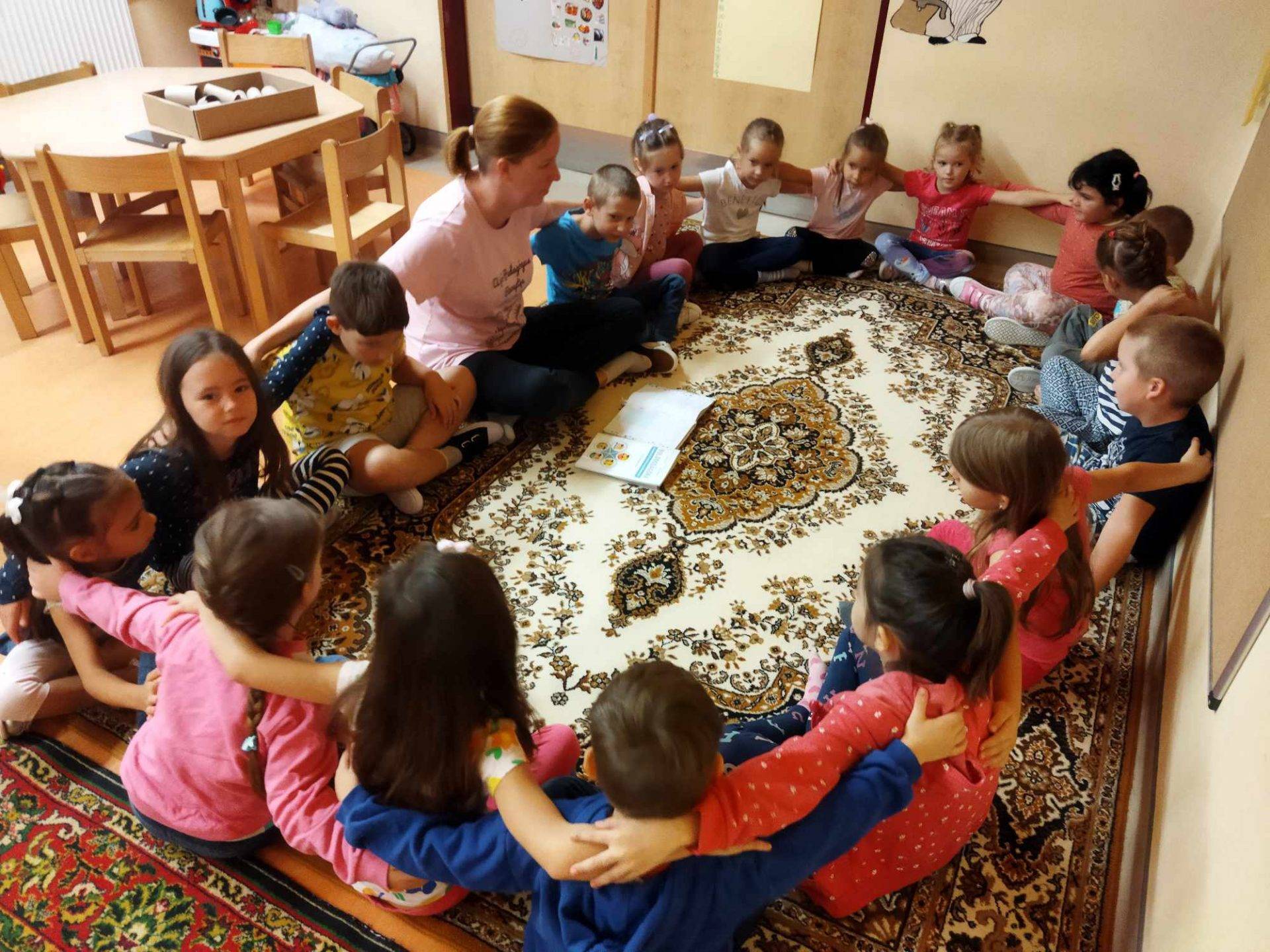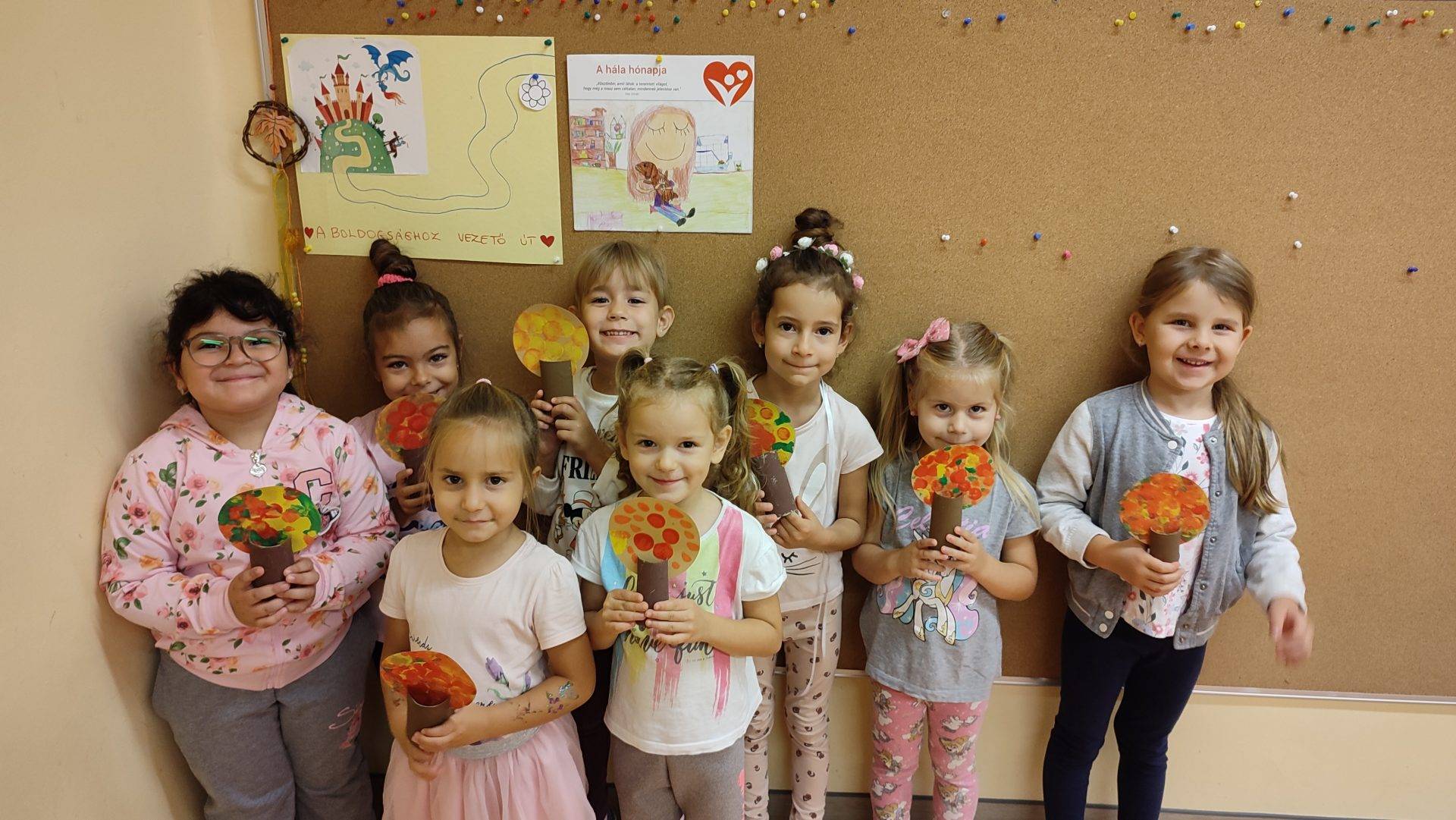 Az új nevelési évünk első témája a hála gyakorlása volt. A gyerekeknek megmutattam a Boldogsághoz vezető lépcsőt és a Boldogság várát, ehhez szeretnénk ebben az évben eljutni közösen a témák segítségével. Bevezető relaxációval kezdtünk, napimádással, malomkörzéssel… Mit jelent boldognak lenni? Mikor vagy boldog? Erre nagyon aranyos válaszokat adtak. Mit jelent hálásnak lenni? Ha valamit kapsz, amit pénzen nem lehet megvenni azt hogy hálálod meg? Mondták hogy megköszönik, ölelést adnak, simogatást, szeretetet. Ezután játszottuk az add tovább faleveles játékot, de mi a boldogságórás plüssmacinkat adtuk kőrbe egymásnak. A szőnyegen közösen ülve, egymást átölelve hallgattuk meg a hónap dalát. A régi mese csoportosaink már ismerték Boldog Dóra mesére hívó versikéjét, ezt most az újonnan csoportba jött gyerekeknek is elmondtuk. A hónap meséje után a hozzá tartozó kérdéseket megbeszéltük, és a boldogságóra, hála hetén a mese főszereplőjét, a Hála fát is megfestettük, így ezt mindenki hazavihette magával. A nagytornánk alkalmával építettük meg a Hála hídat, a padon menve pedig a gyerekek elmondták, melyik testrészüknek mit köszönnek meg. A hála világnapján elmondták a gyerekek miért hálásak, ezeket a gondolatokat pedig ráírtuk a hála fa lombjának hátuljára, hogy otthonra is el tudják vinni a hála érzését és jusson eszükbe, ha hálát adnak, boldogabbá válnak.