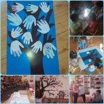 Ezután elkészítettük a csoport hálafáját. A tenyerüket kivágtuk, kiszínezték az ujjaikat a tenyerükbe pedig volt aki bele tudta rajzolni, volt akinek én rajzoltam bele amit kért, mi az amiért ők hálásak majd felragasztották az előre megragasztott hálafájukra.