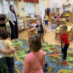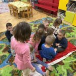 Februárban a Boldogságórán a megküzdési stratégiák voltak a középpontban. Az alkalmat a szokásos mondókával kezdtük, majd egy rövid relaxációs gyakorlat segített ráhangolódni a foglalkozásra. Ezt követően két játékot játszottunk. Az egyik a karikás cápák játék volt, ahol a „jön a cápa” jelzésre a gyerekeknek gyorsan hajót kellett találniuk. A másik a plédes cápák játék volt, amely során egy közös „hajóba” kellett beszállniuk. A játékok során a karikák száma folyamatosan csökkent, a takaró pedig egyre kisebb lett, így a gyerekek együttműködése és alkalmazkodóképessége is fejlődött.