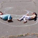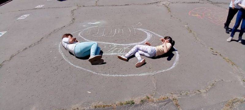 Képkiegészítés. A gyerekek aszfaltkrétával rajzoltak egy képet, majd elhelyezkedtek, mint a kép rései. A végén körbementünk és mindenki megmutatta az alkotását.